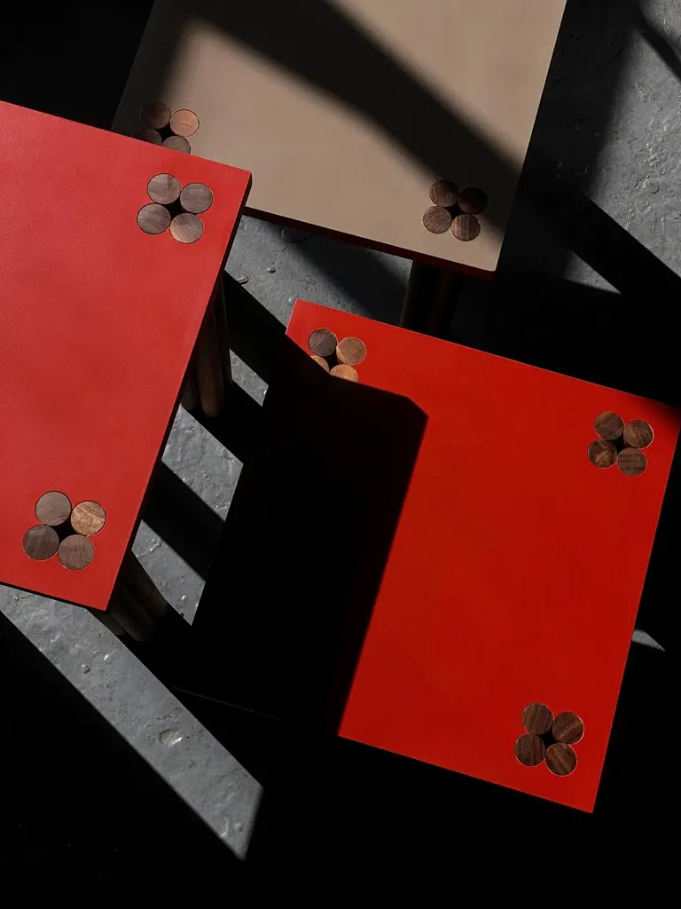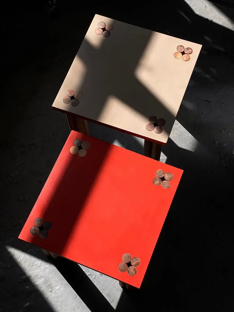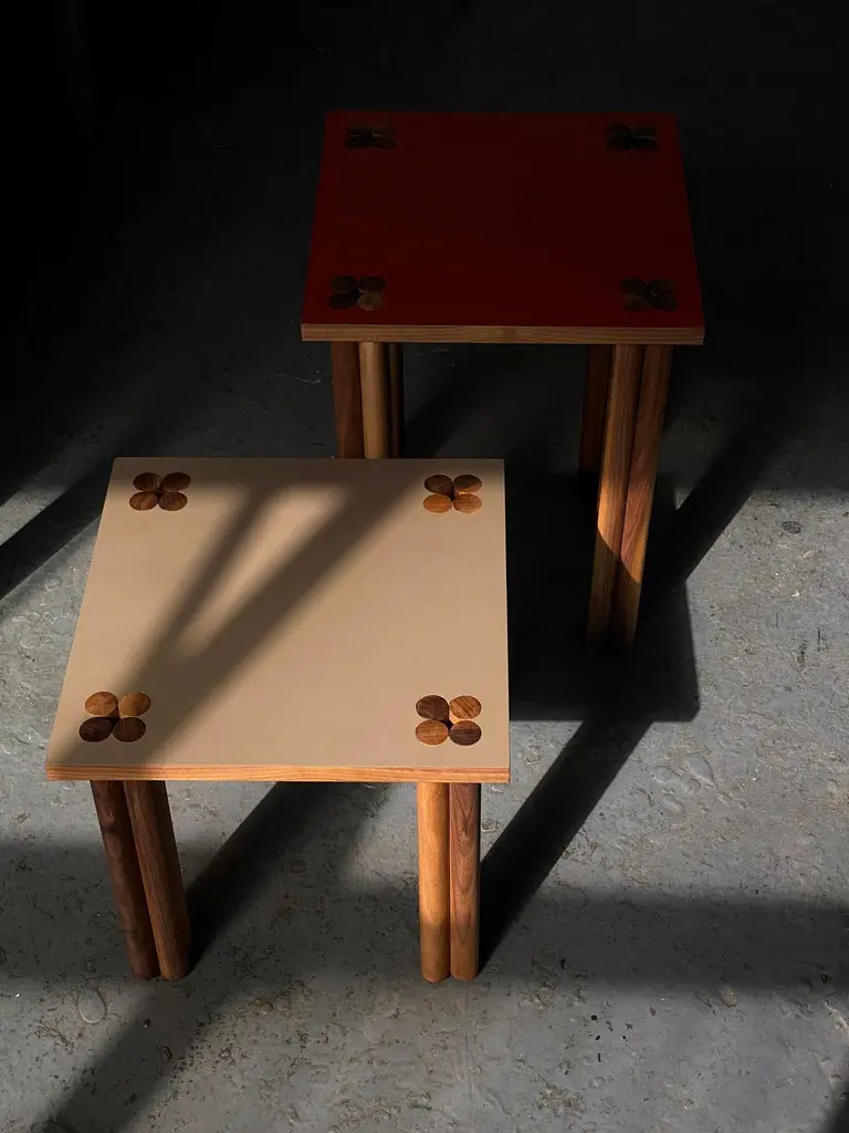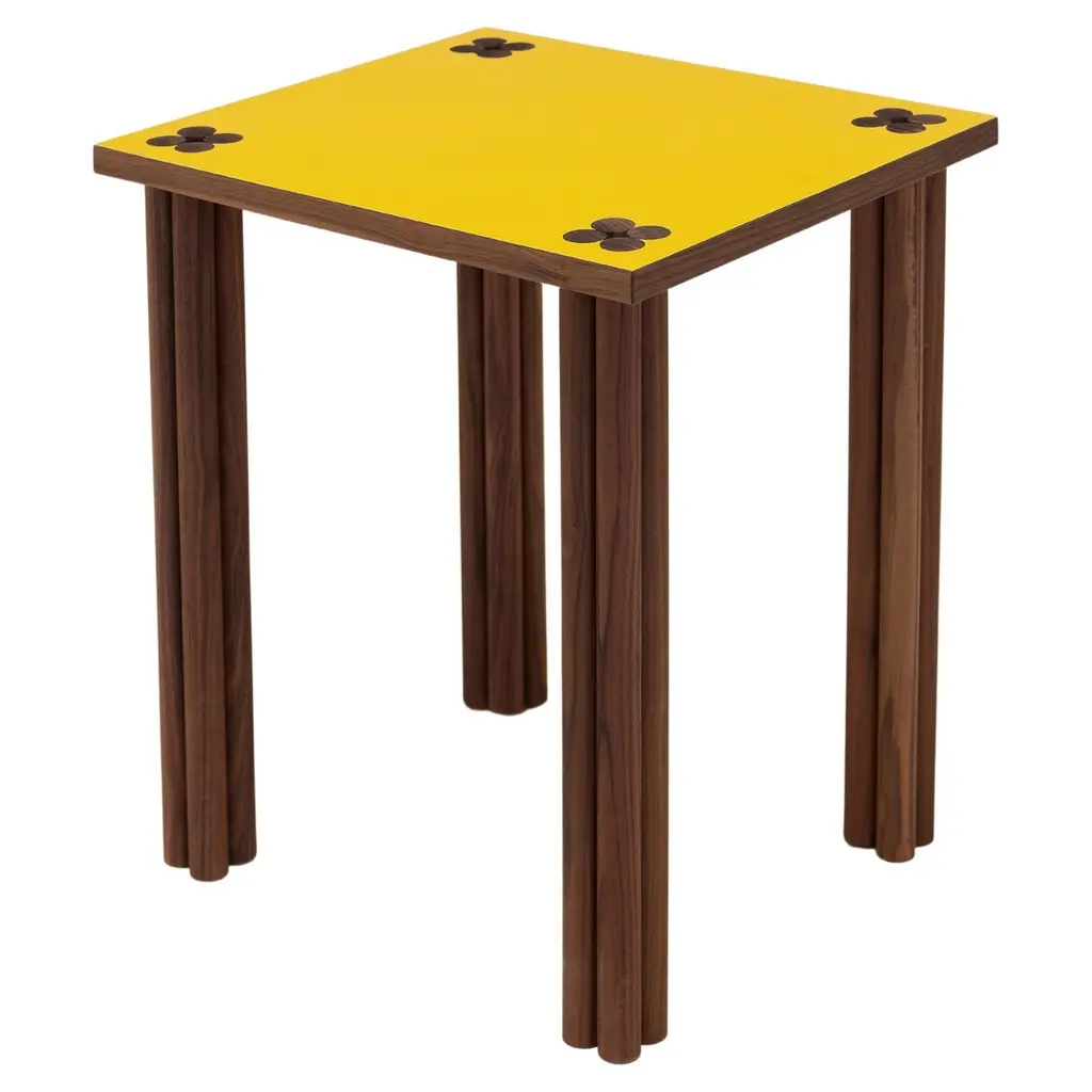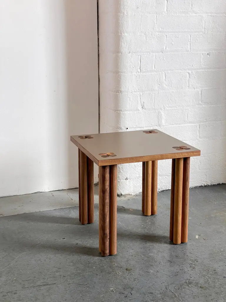 Beige & walnut Hana side table.Dimensions: D 35 x W 35 x H 33 cm.Materials: solid walnut wood, walnut veneer, FormicaOak or other wood possible. Hana is Japanese and means flower - it is a collection of side tables and a sideboard. The name stands for the pattern created by the four wooden dowels piercing through the surface and simple Japanese carpentry as a point of inspiration.