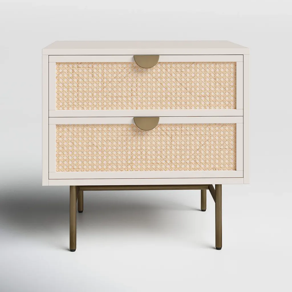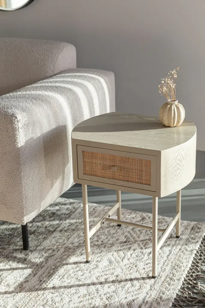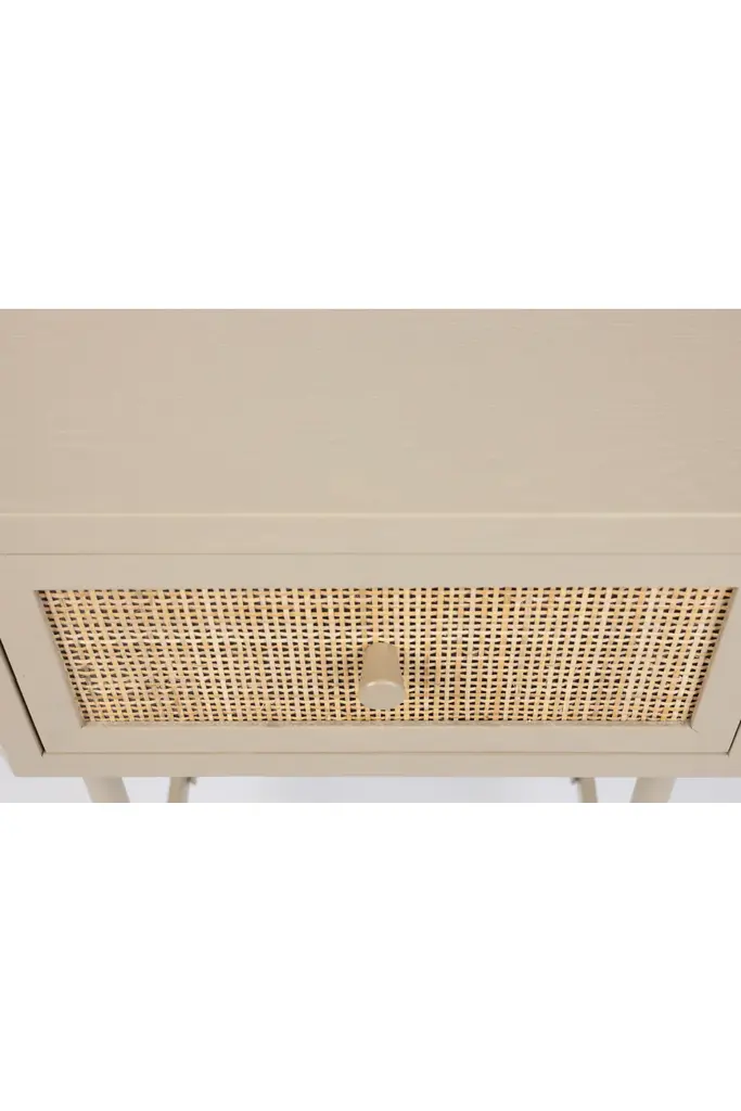 Streamline your storage with the stylish DF Amaya Side Table. It features a drawer with rattan door front, adding a natural touch into any space. Crafted with beige wooden lacquered frame and beige iron legs, it exudes a modern yet timeless charm. The Amaya Side Table combines convenience and contemporary elegance, ideal for any living room or bedroom.