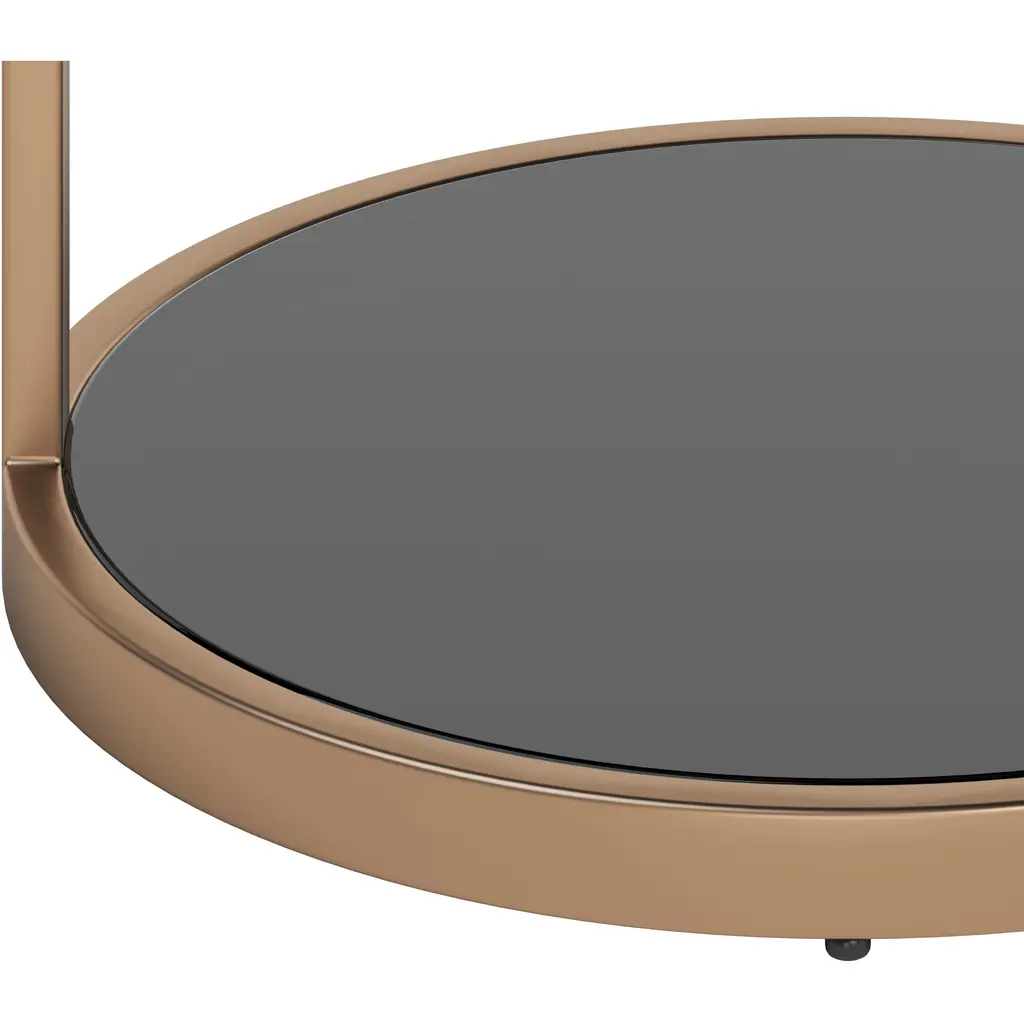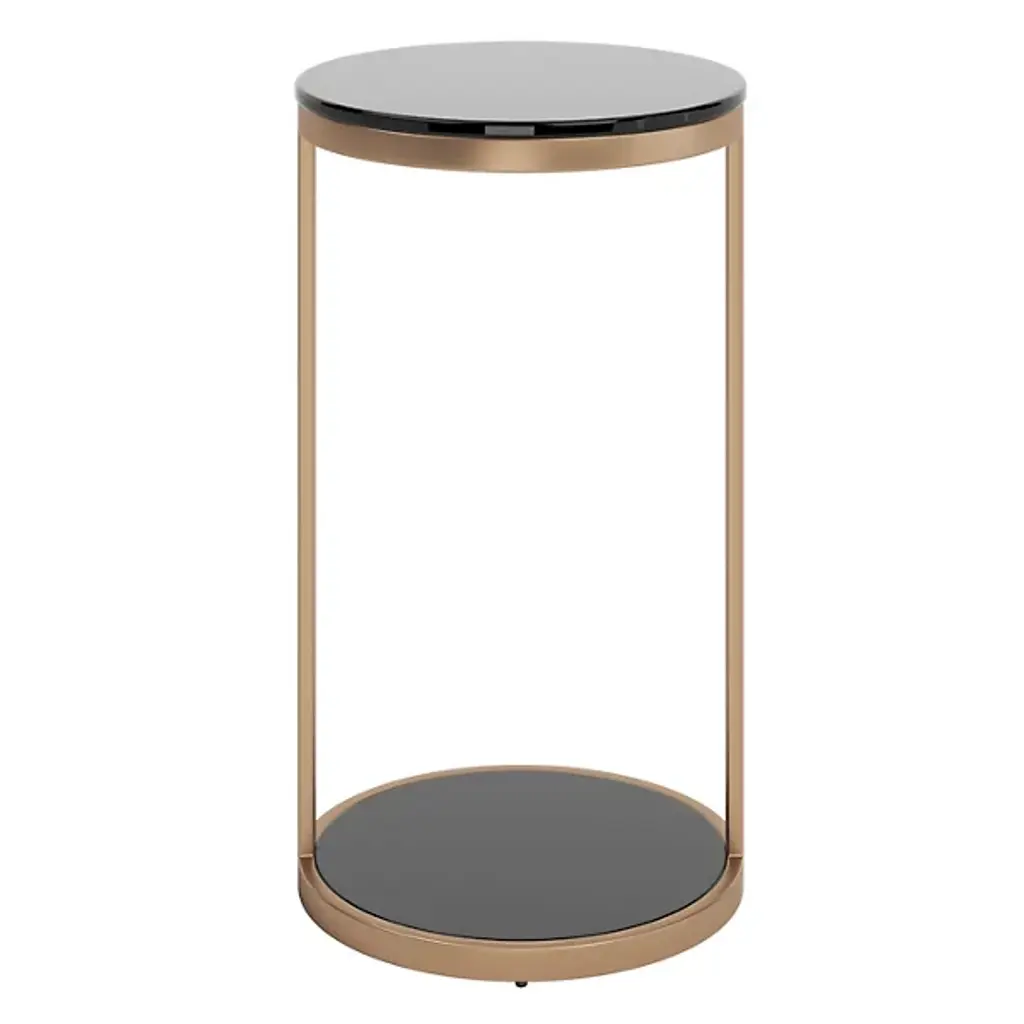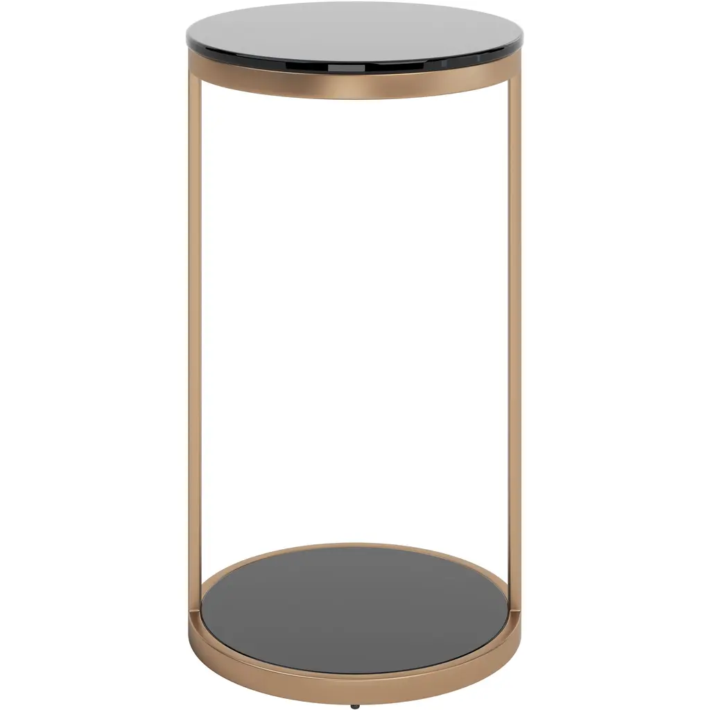 This end table features tempered black glass on an antique brass steel base. Perfect for compact spaces in both transitional and modern environments. Also available in a chrome finish.