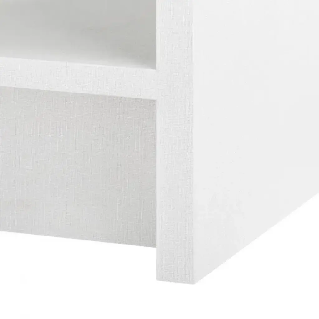 Form and function come together flawlessly in the Benjamin 1-Drawer Side Table. Its structural silhouette is refined by clean lines and an inherent sense of airiness, making it a modern pick that’s versatile enough to complement any style of decor. A floating top drawer on our signature soft-closing glides hovers above an open base, creating a built-in box-like frame for a decorative statue or stack of your favorite books. The piece is executed in lacquered linen with a sleek white finish and distinctive soft edges, which, combined with an antique brass pull, elevate its aesthetic from simple to sophisticated. Whether standing solo or paired on each side of a bed or sofa, the Benjamin is sure to complete your room.