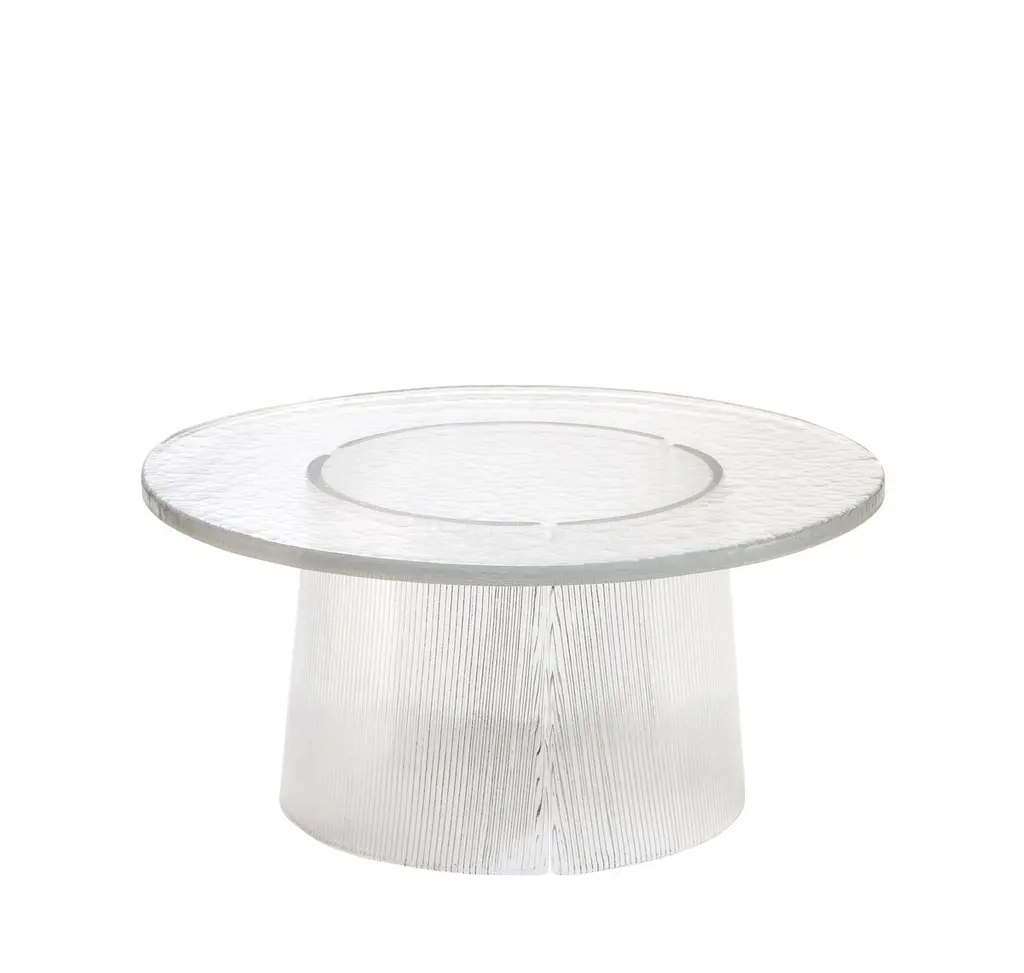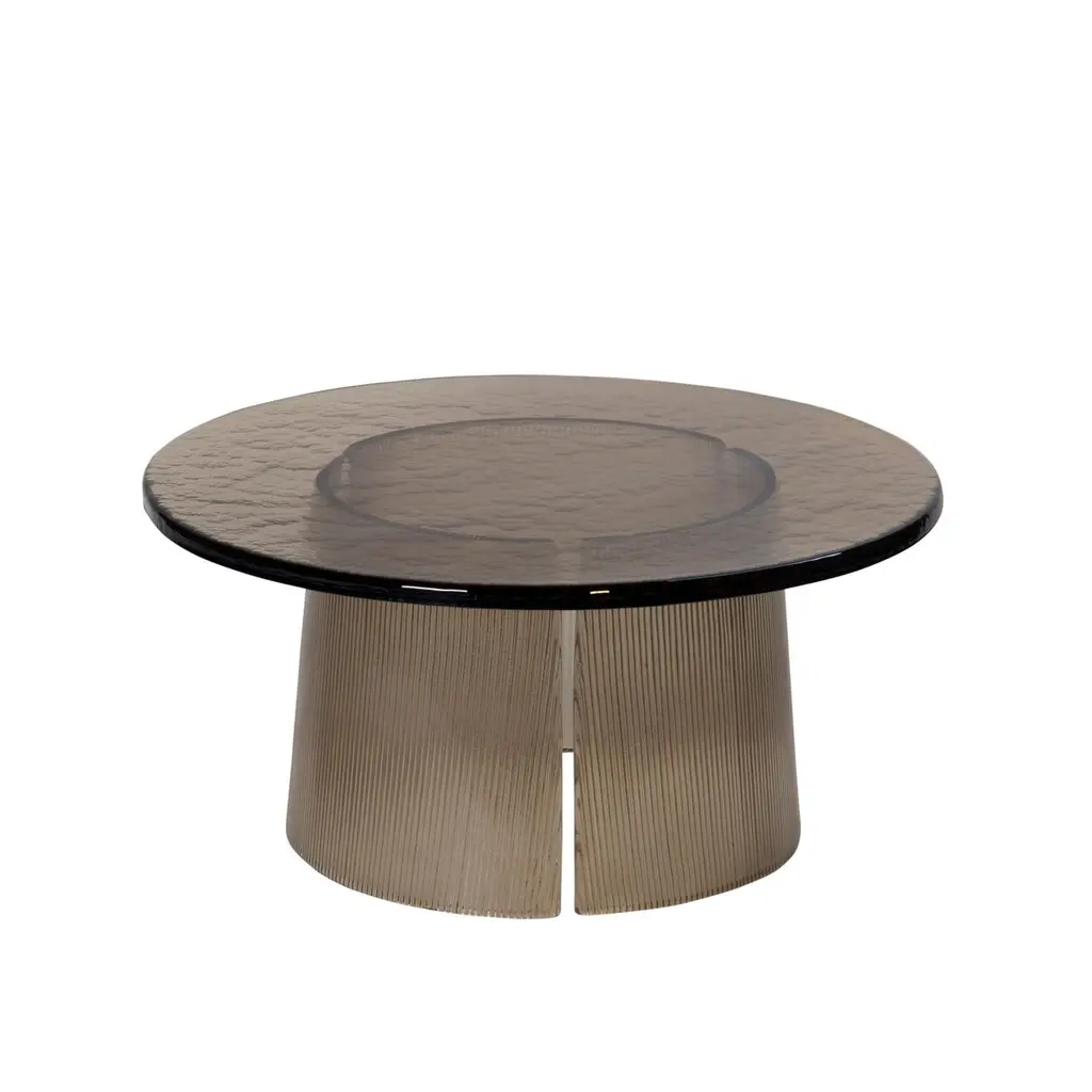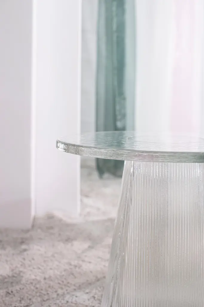 Bent side table big smoky grey by PulpoDimensions: D 75 x H 35 cmMaterials: casted glassAlso available in different finishes and dimensions.The bubbled surface of the cast glass table top dances against with the smooth lines of the fluted cast glass base. The bent side table expresses the beauty of glass in all its forms. With a striking simplicity, this interior companion has the ability to blend in or the centre of attention.Pulpo is a design editor for high-end products in the home sector.Design is our passion. Art is our engine. We are fascinated by the craft of the ceramic and glassblowing workshops and are guided by the rough aesthetics of these unique pieces.Pulpo’s philosophy goes back to the idea of ??the “carte blanche”. Our designers and artists develop their designs freely and experimentally. A variety of materials and a weakness for structures are our strengths.The headquarters of pulpo is in Weil am Rhein, near the Swiss border. Consisting of the creative and sales department, warehouse and logistics, this is the think tank for our artists and designers. pulpo’s dealer network extends far beyond Weil am Rhein – from Iceland and Dubai to Australia.Pulpo is movement – is possibility – is passion.In 2006, pulpo was founded by Ursula and Patrick L’hoste as a design brand at the interface between shape and material. pulpo’s conception is to edit lighting, furniture and accessoires on editor’s choice. The company’s focus is to conduct up-and-coming designers and selected manufacturers, using the nature of material’s to form the score. Materials such as ceramics, stone and especially glass, which is pulpo’s primary focus since 2013.
