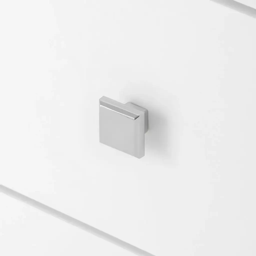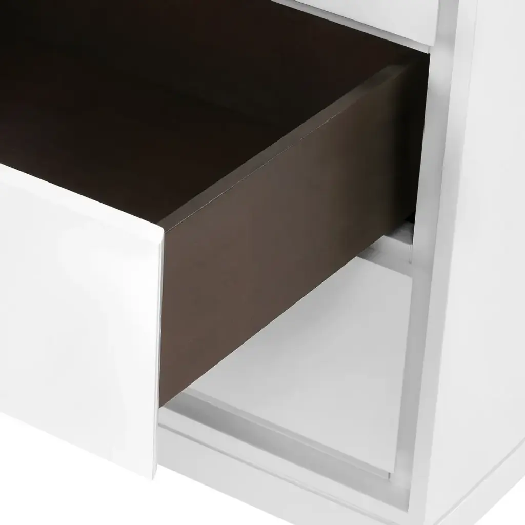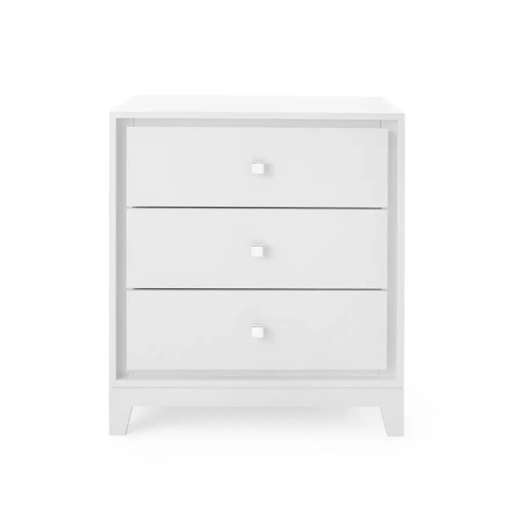 Sleek and stylishly contemporary, the Bergamo 3-Drawer Side Table supplies a bedroom, living room or study with modern polish while doubling as a chic storage solution. Its sturdy wooden form is softened by its high-shine, lacquered white finish, as a recessed border surrounding its three-drawer facade adds unique dimension to this otherwise streamlined piece. As for the drawers themselves? They softly glide open to reveal rich stained wood interiors, with square chrome pulls that speak to the Bergamo’s overall shape.