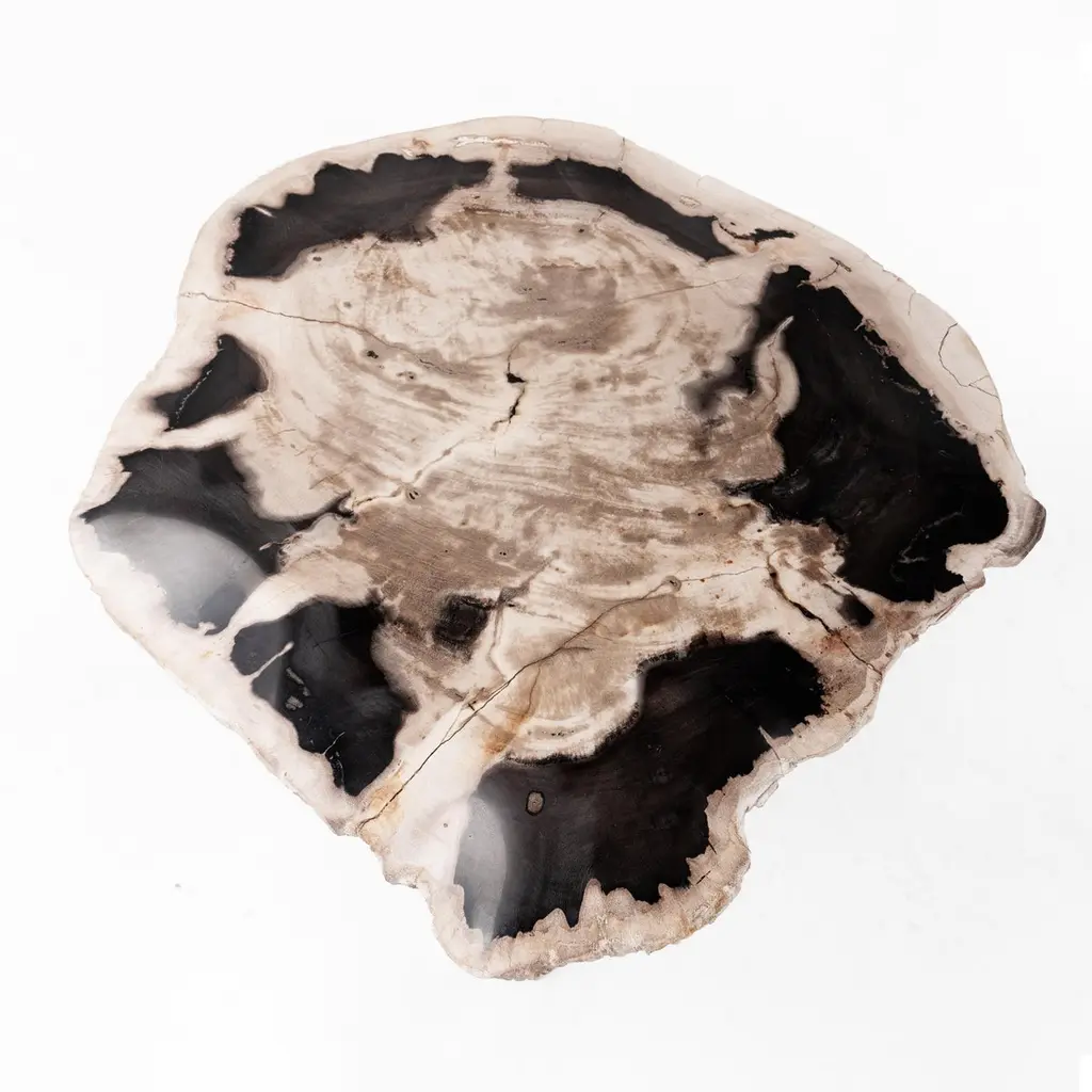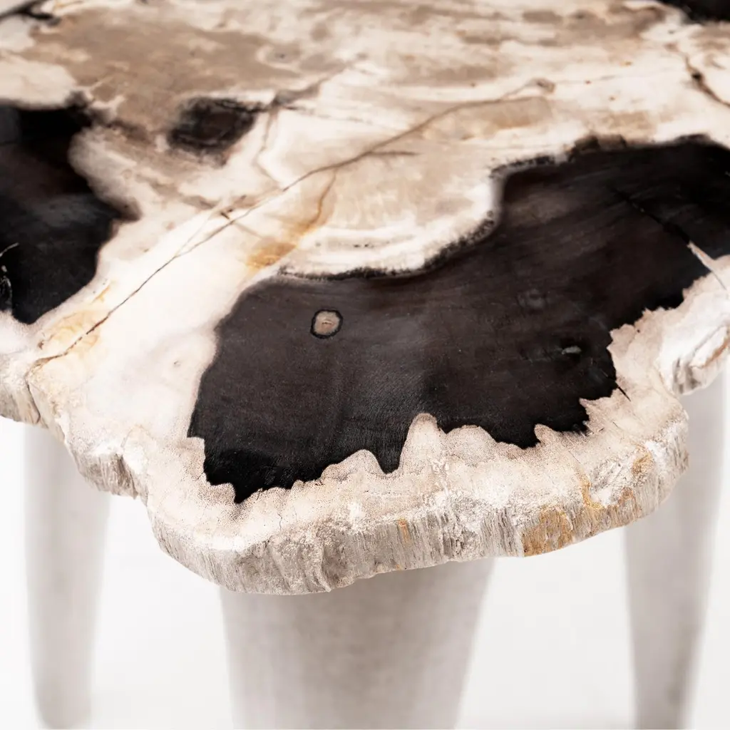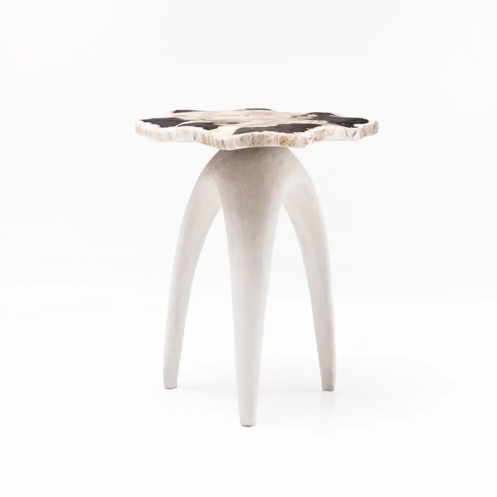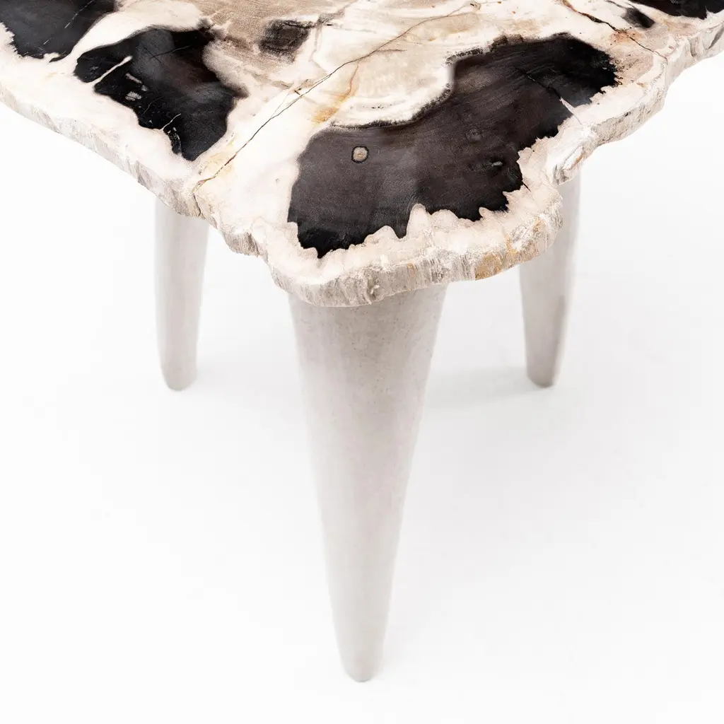 The ‘Bermuda Love Triangle’ sculptural side-table features a solid, hand carved petrified wood top, perched upon an organic shaped tripod base made from limestone composite.Petrified wood is created from fossilised trees transformed into stone by a mineralisation process that occurs underground, over hundreds of millions of years. This rare material features striking colours and motifs created by the mineral formation process, comprised of semi-precious minerals such as quartz, chalendony and jasper.This is a meticulously hand sculptured product; each object will have its own unique presence and feature interesting variations in the natural materials and forms created during the artisanal process. Dimensions:Diameter: 17.2” (45+ cm)Height: 26” (65 cm)Customization: - This piece is available in a variety of curated petrified wood table tops. - Custom height options available upon requestHandmade to order unless listed in stock.----------Odditi takes a curious look at the relationship between nature and humanity, exploring our inner and outer landscapes and creating objects that live between the worlds of art and design.