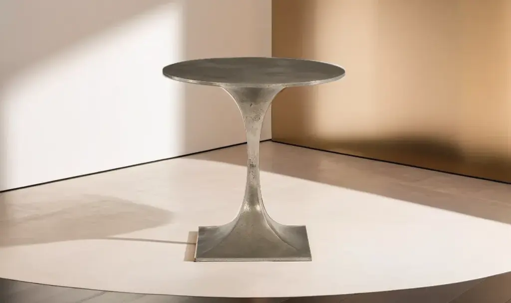 Bernhardt Interiors offers high-design furniture with an eclectic edge. The Randolph end table joins a square base to a slender pedestal and round top in a classic tulip shape. Crafted from cast aluminum in Graphite finish, this elegant accent piece combines graceful curves and geometric shapes in perfect harmony.