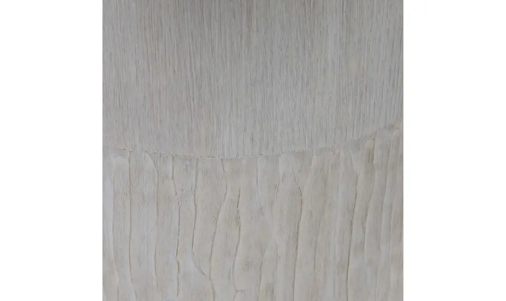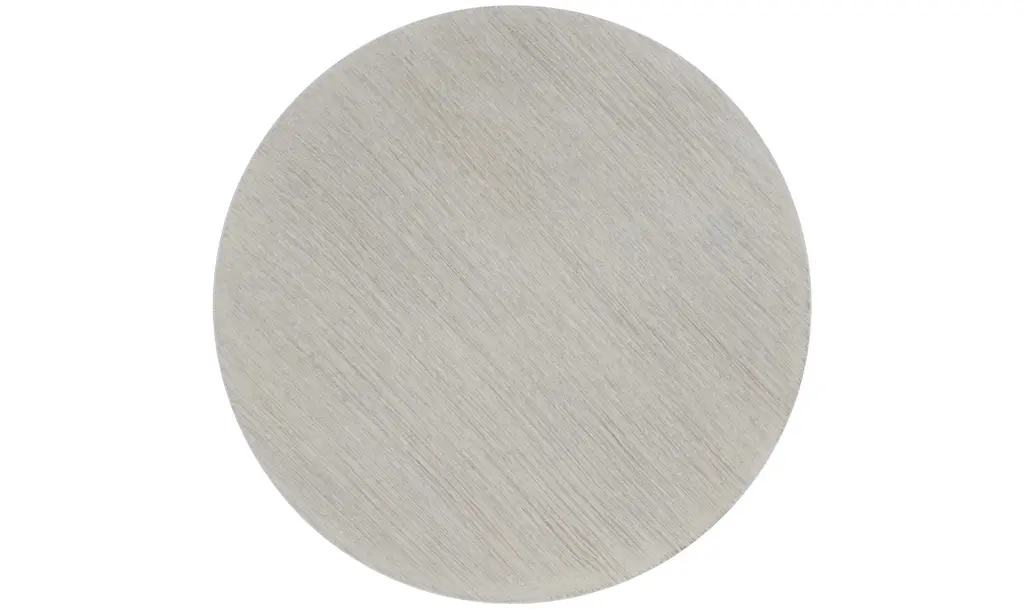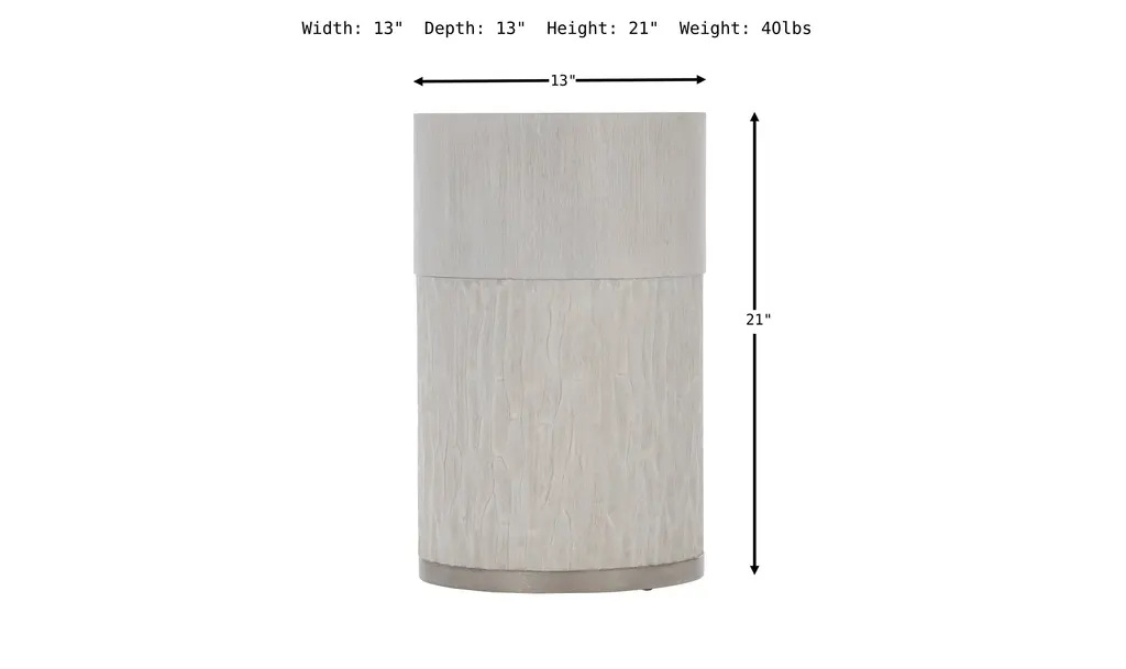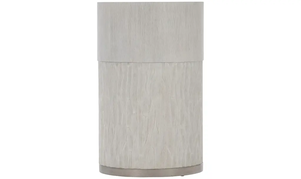 The Bernhardt Solaria2 Accent Table adds a distinctive touch to any living area by skillfully fusing cutting-edge workmanship with modern style. The elegant upper piece of this accent table is made of quartered white oak veneers and has a beautiful aged bone finish. This unique texture highlights the wood's inherent beauty in addition to adding visual appeal. Cast resin construction with a chiseled motif that adds a touch of artistic interest characterizes the lower section. The smooth upper surface and this fine detail work in perfect harmony to create a visually exciting item. A cast aluminum ring with a shining nickel finish adorns the table's base, adding a sleek, contemporary element that blends in with the overall style. Because of its adjustable glides, the Solaria2 Accent Table is both aesthetically pleasing and secure on any type of flooring. This table is a visually arresting focal point that enhances the atmosphere of any space, whether it is positioned in the living room, bedroom, or corridor.