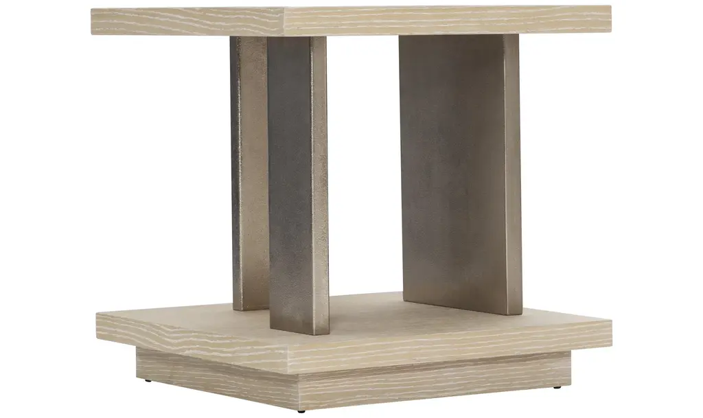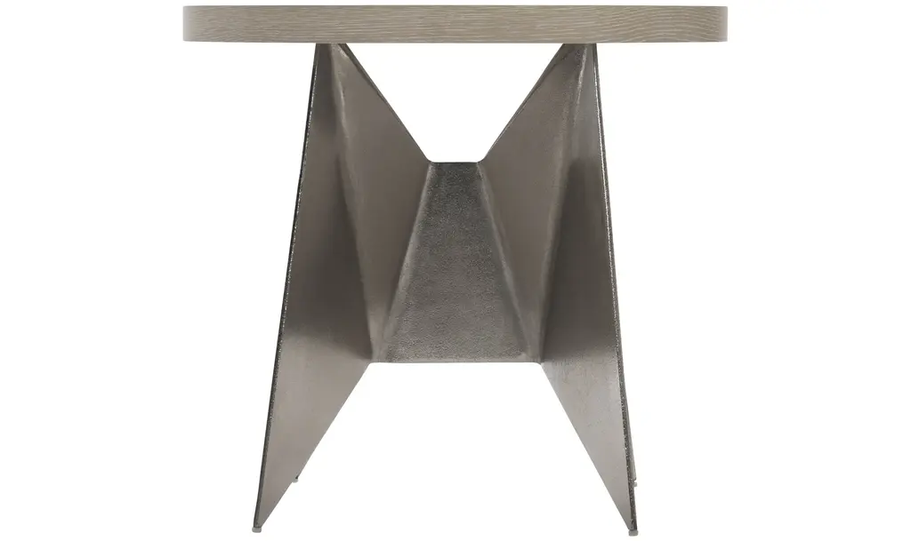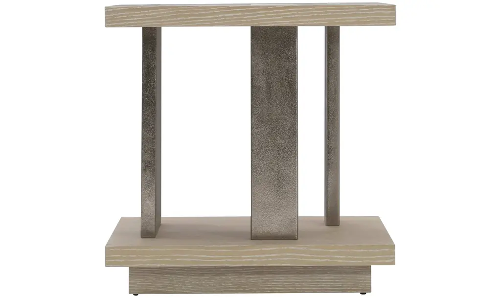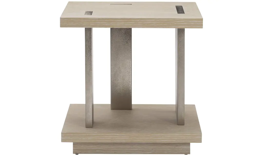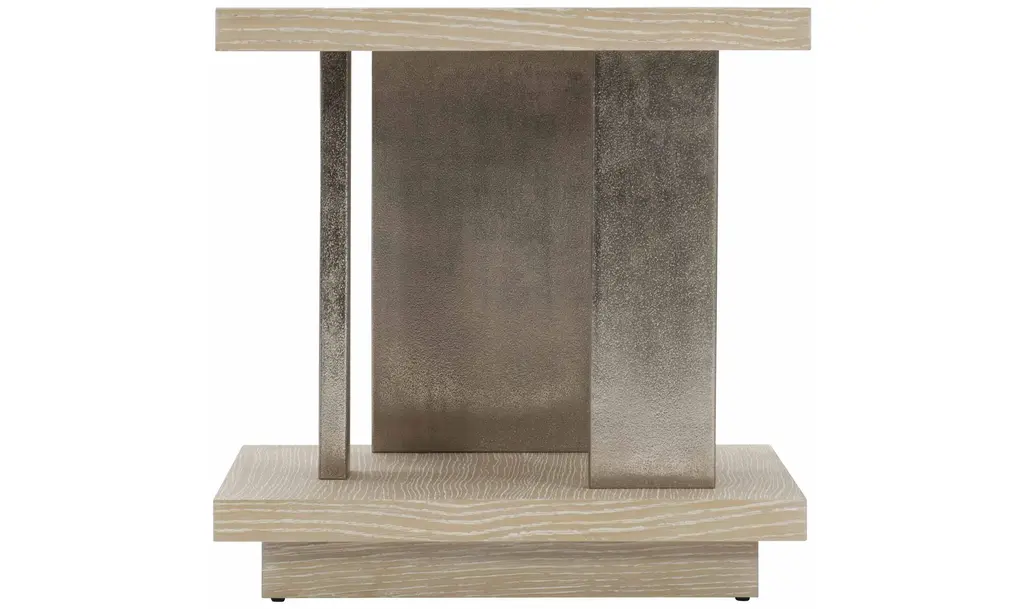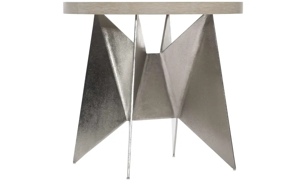 Introducing the Bernhardt Solaria2 Side Table, a masterful fusion of modern style and fine craftsmanship. The distinctive design of this side table sets it apart, with varying-sized cast aluminum pieces that offer strong support and eye-catching visual interest. In addition to serving as supports, the panels pierce through the oak top to create a complex inlaid design that elevates any living area. The base and tabletop are made of veneers cut from quartered white wood, and they have a sophisticated Dune finish that has a cozy, organic look. Sturdiness and longevity are ensured by the solid plinth and hardwood base. The metal components, which include top inserts finished in polished nickel and cast aluminum support leg panels, highlight the design. In contrast to the warmth inherent in the wood, these metal elements add a sleek, contemporary look. To complete the look of the table, the Solaria2 Side Table also has a geometric cast aluminum base that is polished to a bright nickel finish. The table has movable glides that ensure it stays level on any surface, adding to its convenience. The Bernhardt Solaria2 Side Table is ideal for modern or contemporary settings since it is more than just a piece of furnitureŃit is a declaration of quality and style. This gorgeous side table will add a touch of art and usefulness to your living area.