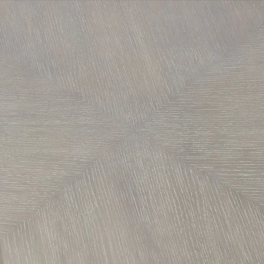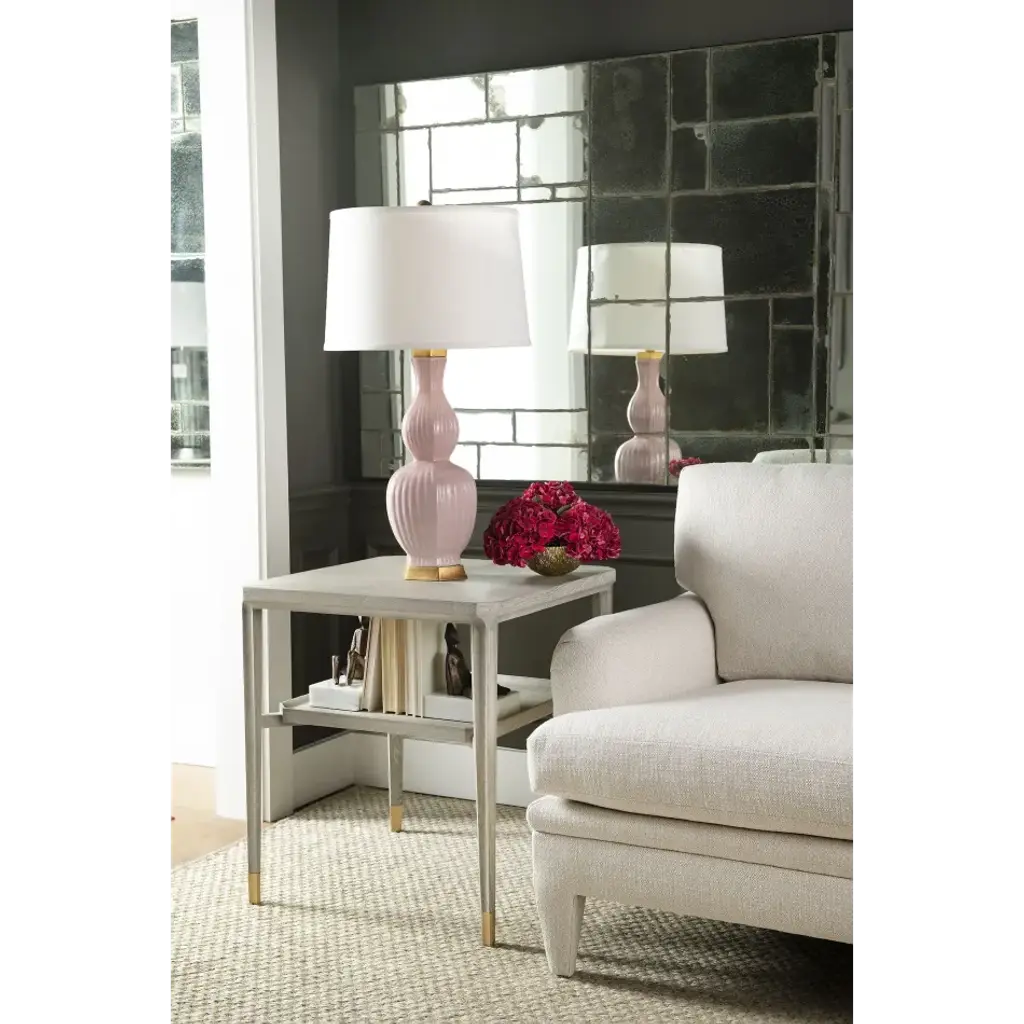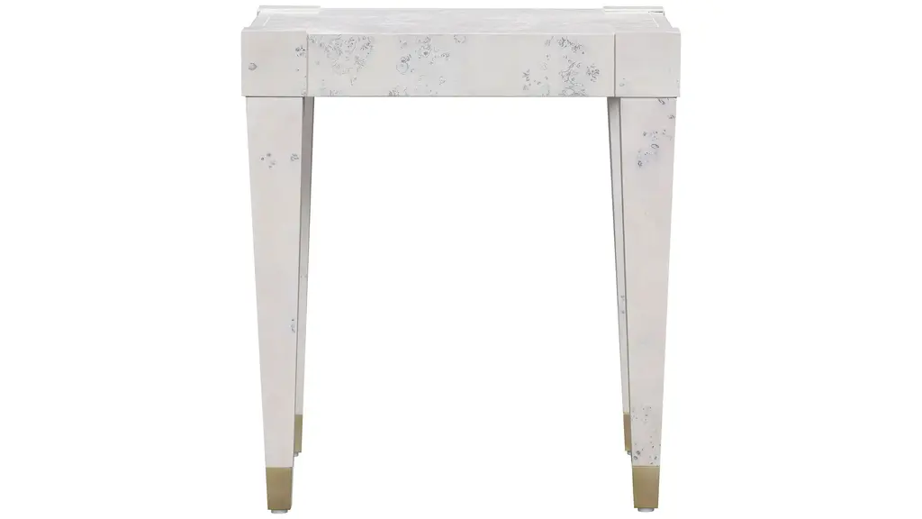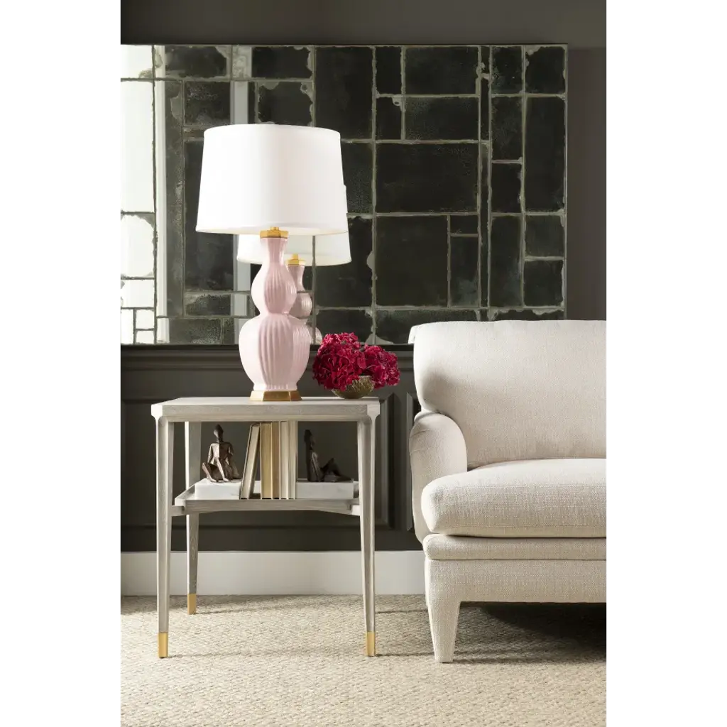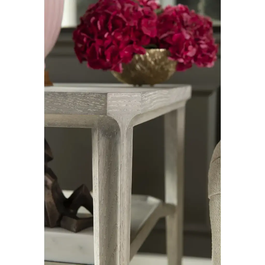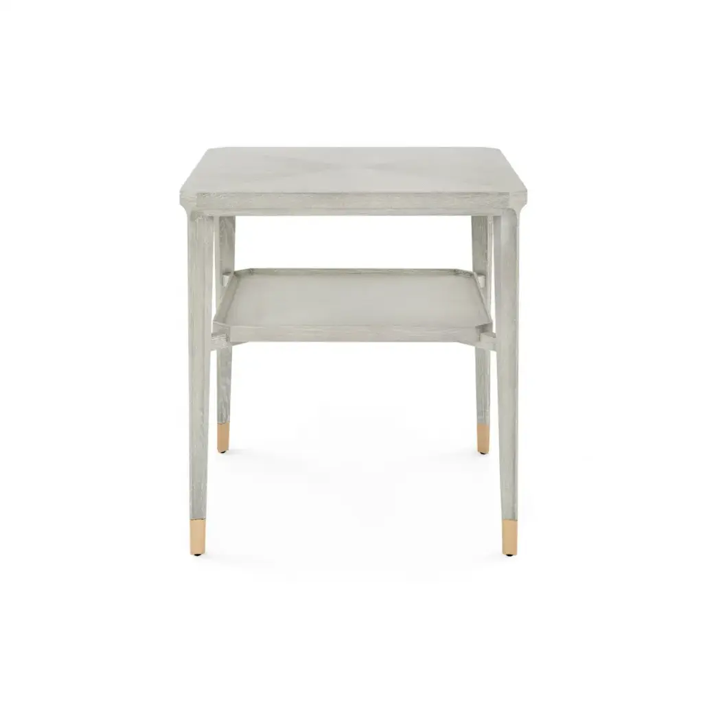An ultimately elegant piece, the Bertram Side Table comes in a soft gray straight-grain cerused oak or a sand bleached cerused oak with hand-cast brushed brass details. The square side table has a suspended tray bottom with a chevron-patterned shelf floating on a stretcher-like frame. The side table’s veneer is chevron-patterned: carefully selected and laid by hand to highlight the oak grain’s intricate markings. The legs are hand-carved, made of quarter-sawn solid oak, and expertly sanded to taper elegantly. Since this side table doesn’t include drawers, the Bertram is best used as an occasional table next to your couch or as a handy surface to store coffee table books or magazines in a reading nook. Float it in a room to show off the double-sided coved legs or nestle it into a corner. What We Love About the Bertram Collection: The delicate craftsmanship in the Bertram Collection—like the chevron-pattern oak grain or the coved details—give each piece a light, elegant presence.