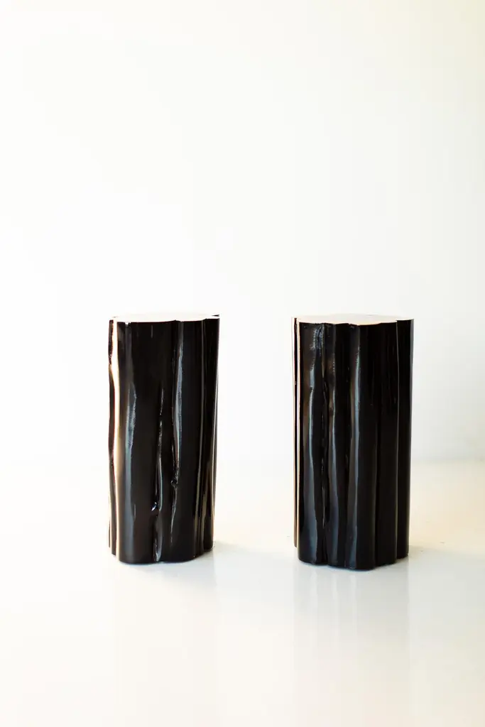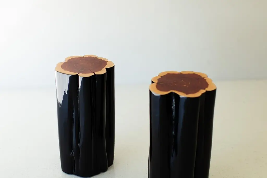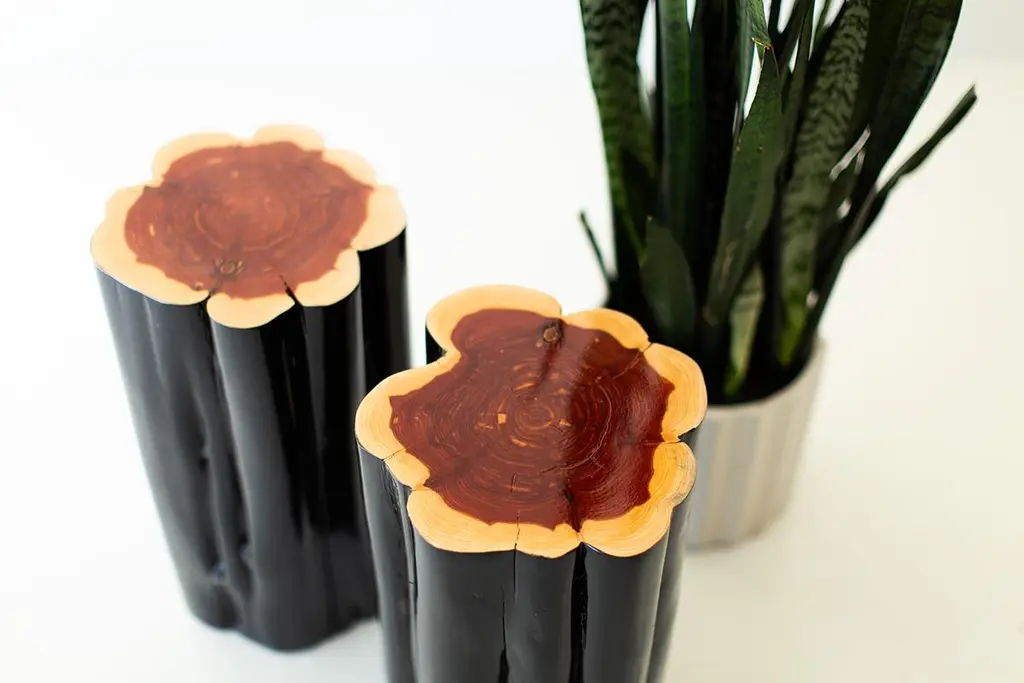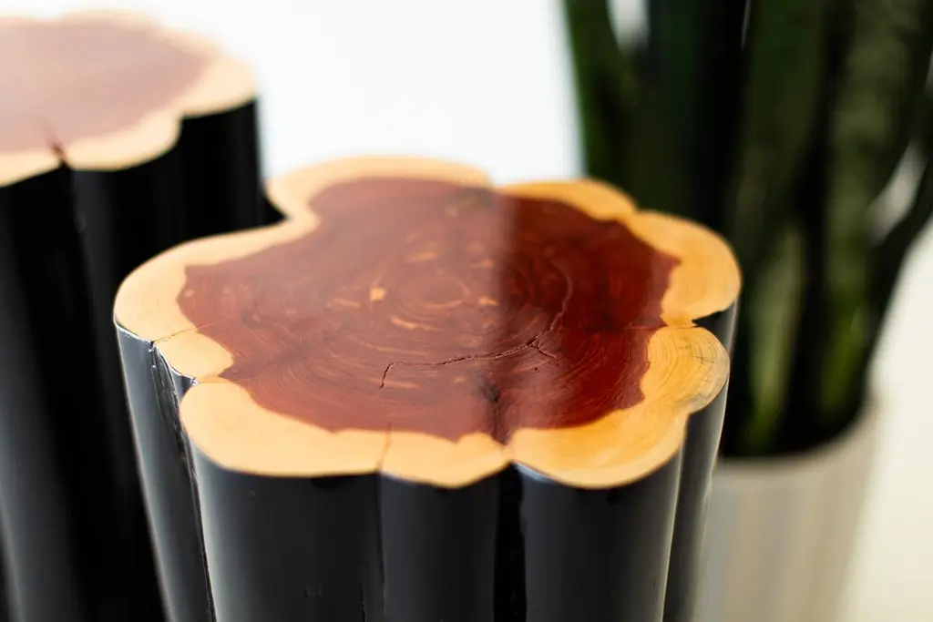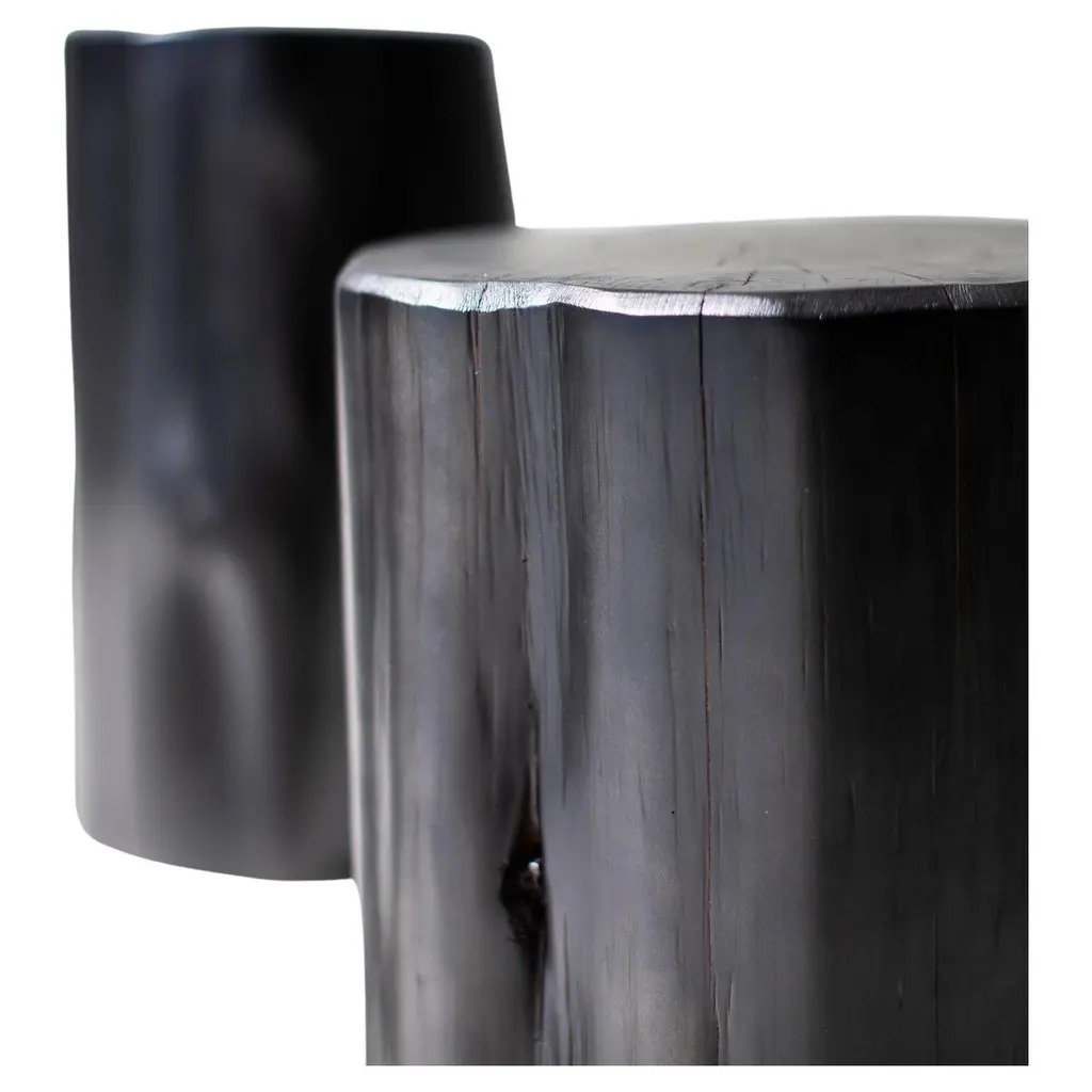 Bertu Stump Table, Black Outdoor Stump Table, Natural Top, Red CedarPlease scroll down to read IMPORTANT INSTRUCTIONS ABOUT OUR STUMPS before purchase!Please note, we have upgraded to a more durable outdoor finish with extra UV protection. With the extra durability comes more of a glossier finish. Why buy BERTU stumps?KILN DRIEDOur stumps all go through a drying process in our kiln, sometimes for up to a month. We are meticulous with bringing each and every log to a specific moisture level. This process helps with major cracking, long-term moisture issues, and bugs.ECO FRIENDLYIn an effort to replenish the trees we use, we plant 50+ trees a year. In addition, we practice salvage logging. Where do we source these? Some of the trees fall naturally. Some have damage from severe wind, lightning, flood, disease, or other natural disturbance so they need to be cut and removed before they fall. Others are fresh cut because people want them off their land. Salvage logging may reduce erosion, reduce intensity of future wildfires, and slow buildup of pest insects.FAMILY OWNEDThese are made from our family to yours. Quality is of utmost importance, and we hand cut, de-bark, sand, and finish every piece with care.See how we do it here.COMMERCIAL GRADEThese stumps are meant to be loved and USED. Each is finished with a durable commercial-grade finish. This finish is tough enough for spills, kids, and holds up in hotel and hospitality settings.PLEASE NOTE : These stumps will age naturally, and even more so being outdoors and exposed to the elements. Each is a solid log with its own unique character so we can not guarantee the finish won't fade or discolor as this varies per climate and log. This Black Outdoor Stump Table with Natural Top is made in the heart of Ohio with locally sourced wood. The stump can be used for a side table, a stool, or grouped together for a coffee table. Each stump is made from a solid trunk of red cedar and each is hand sawed, sanded, and sprayed with a durable exterior finish. Every part of the process is handled with care - even the bark is hand chipped and sanded to honor the unique markings of each tree. Note: These are REAL tree stumps. Natural movement and cracking is normal. These are all slightly different in character and they may vary in size - No two pieces are exactly alike. Each size and color can be done in our indoor finish or more durable outdoor finish. Our team and clients absolutely love these."I love natural elements. I'm inspired by them and I love being surrounded by them. I also love modern furniture and accessories. When thinking of new products a few years back, I wanted to do a modern twist on something considered rustic.Thus the whitewash stump table was born! It's important to our family to not only design and manufacture beautiful things, but to provide the best quality and experience. There is a lot of love that goes into each stump, as we hand pick and finish each one per order. Add a little piece of nature to your home in a modern way!" -- Gretta Jones // Bertu HomeIMPORTANT INFORMATION ABOUT OUR STUMPS...1. Please unpack your stump immediately and leave it out of any packaging. These are real pieces of wood and need to breathe!2. For OUTDOOR stumps : Though these are kiln dried and the wood can be used outdoors, sometimes when they arrive in different climates, humidity levels adjust and can affect the finish on top. We see this more often in direct sunlight. We do our very best and continue to make sure there are no issues, but we can not control climate. Solid wood and the elements are unpredictable and we will not be liable. The great thing about these logs is you can always sand them down and refinish.3. Wood naturally moves. These are solid pieces and for that reason, they are prone to cracking. You may get more cracks or bigger cracks in the first few weeks as the wood acclimates to its new home and climate.4. These stump tables have nylon glides (feet) underneath not only to make them easier to move around (they are heavy!), but also so there is nice air flow to the wood. The air flow is most effective on hard flooring. If you put these on rugs or carpeting, we suggest checking on the underside of your stump periodically to prevent any issues.5. We are not liable for any damages to property or people. If you have any concerns or questions you need to discuss, please write or call. We are always available, honest, and transparent about our products. Thank you and I hope you love these!specsPeriod/Model: New; Organic ModernIndoor/Outdoor: OutdoorSpecs: Red Cedar, Whitewash, Black, or Natural Commercial-Grade FinishdimensionsH: 21"W: 11" (give or take)This listing is for our "normal" diameter stumps, the smallest diameter stumps we offer. We have medium and large sizes as well!SKU: Bertu Stump Table, Black Outdoor Stump Table, Natural Top, Red Cedar