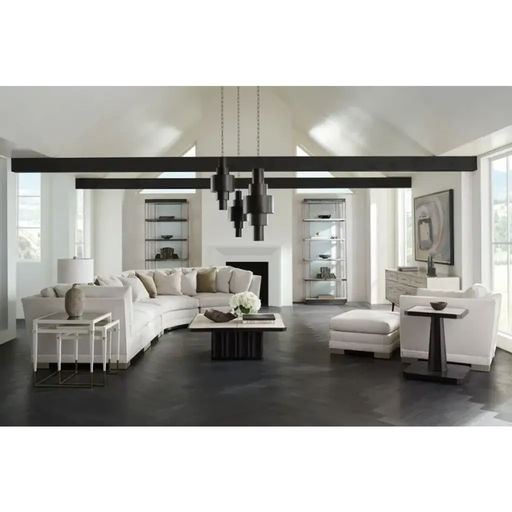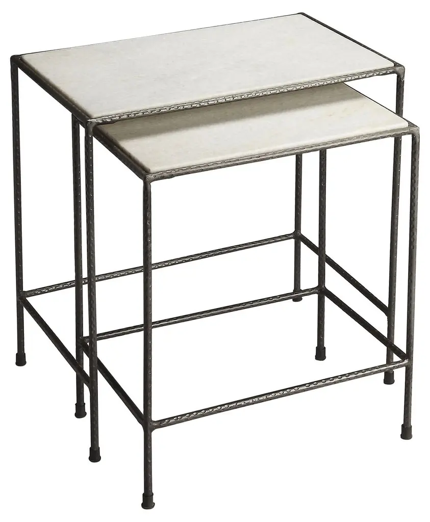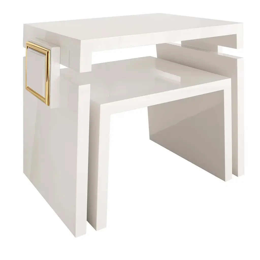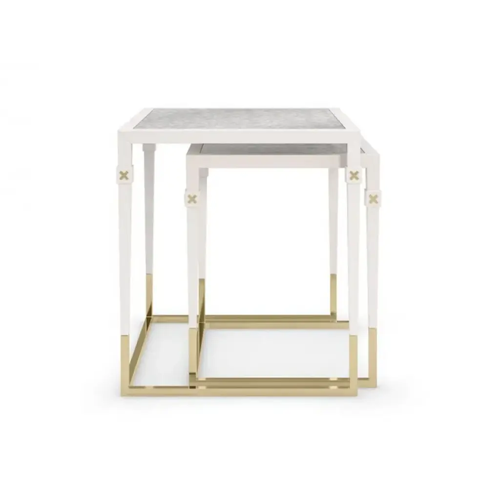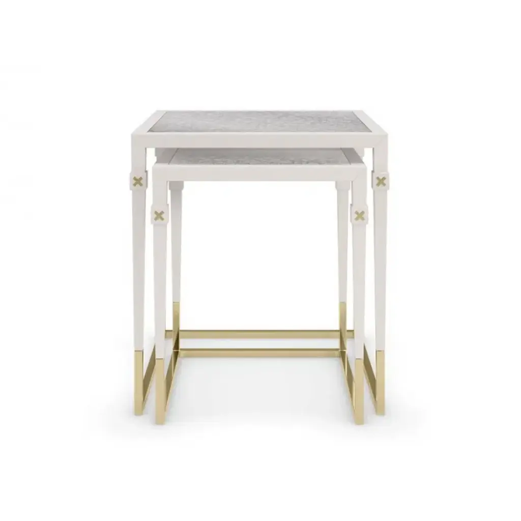 Refined and reflective, this sleek pair of nesting tables artfully mixes materials and finishes for an exquisite balance of form and function. Antique mirrored glass tops add a note of vintage glamour to a Pearly White frame and legs with Majestic Gold ferrules and stretchers. For added adornment, a gold metal “X” inlay finishes the look with an element of distinction. Sold as a nesting pair.