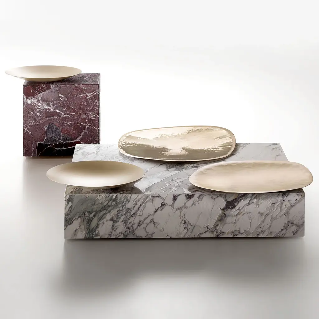 The romantic idea of an organicistic, vitalistic and dialectical nature is the concept of Between Nature. We look at an organized nature in which the parts live in function of the whole; nature as a structured and dynamic reality that manifests itself in the artifact. Characterized by a monolithic base in marble by IPOGEO ® by Margraf Innovation Lab, the tables welcome metal trays in different shapes, that seem to float on the marble surfaces. Between Nature celebrates the collaboration between De Castelli and Margraf.