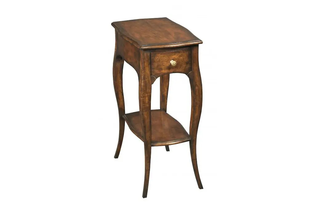 Selected solid woods and choice veneers. Features a pull-out shelf with antique brass finished hardware. Designed to be perfectly proportioned for use beside an easy chair or as a bedside table, it includes a lower shelf for additional storage.