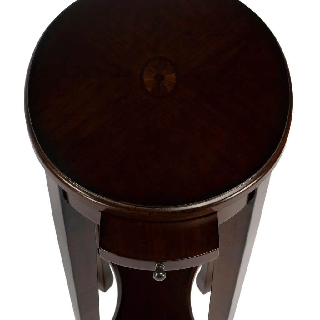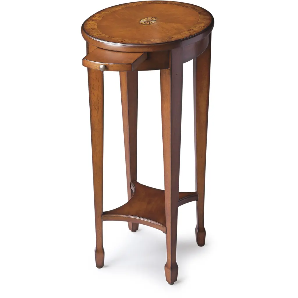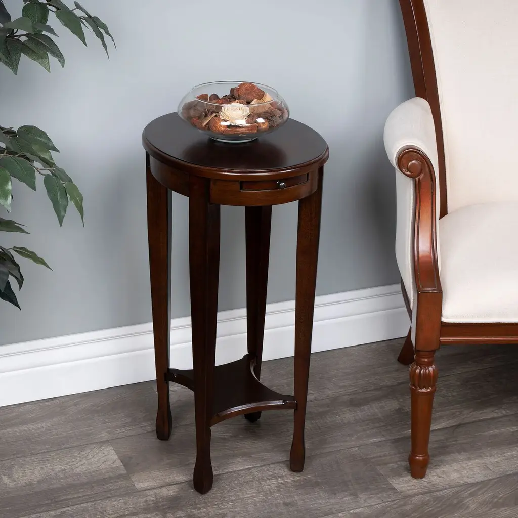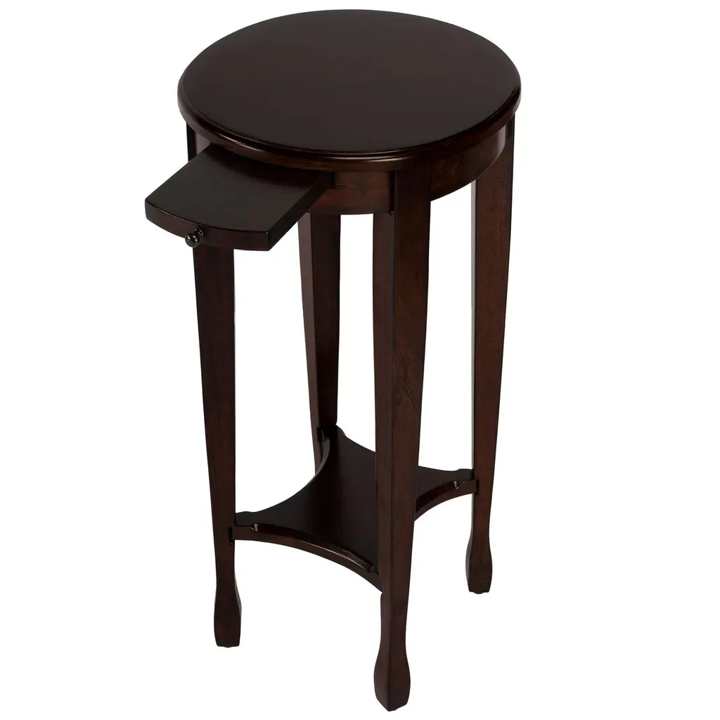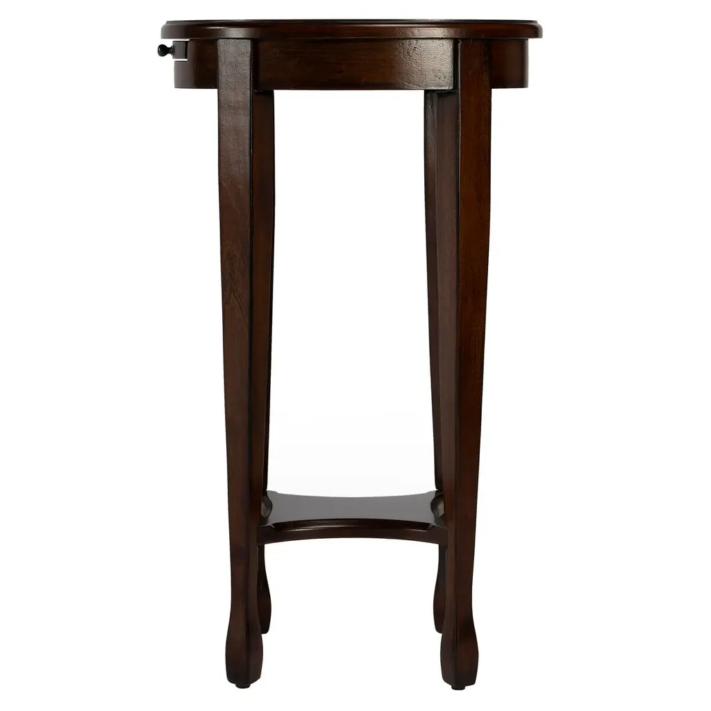 Selected solid woods and choice veneers. Features a pull-out shelf with antique brass finished hardware. Designed to be perfectly proportioned for use beside an easy chair or as a bedside table, it includes a lower shelf for additional storage.