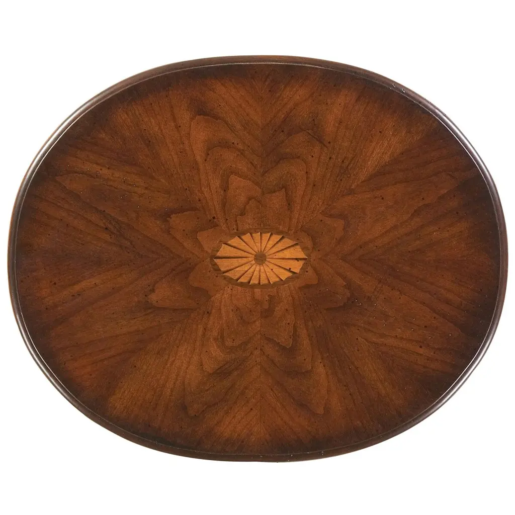 Selected solid woods and choice veneers. Features a pull-out shelf with antique brass finished hardware. Designed to be perfectly proportioned for use beside an easy chair or as a bedside table, it includes a lower shelf for additional storage.