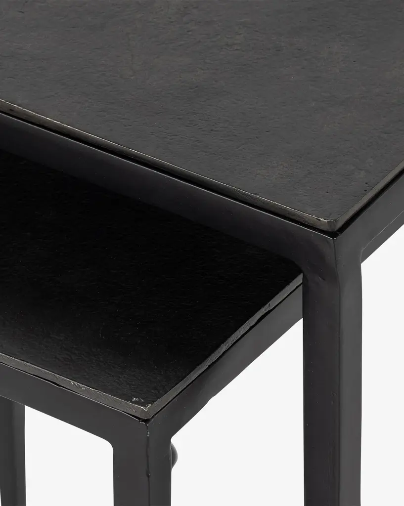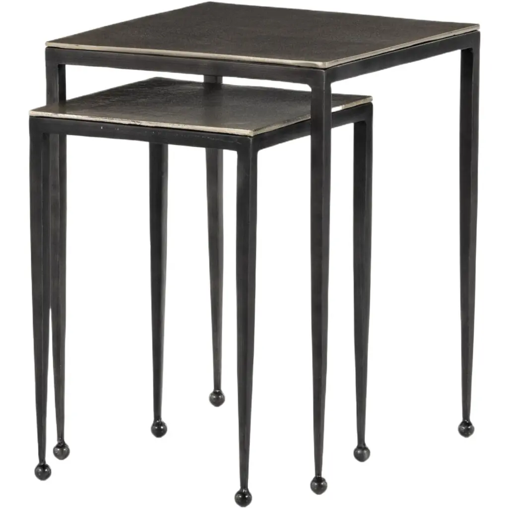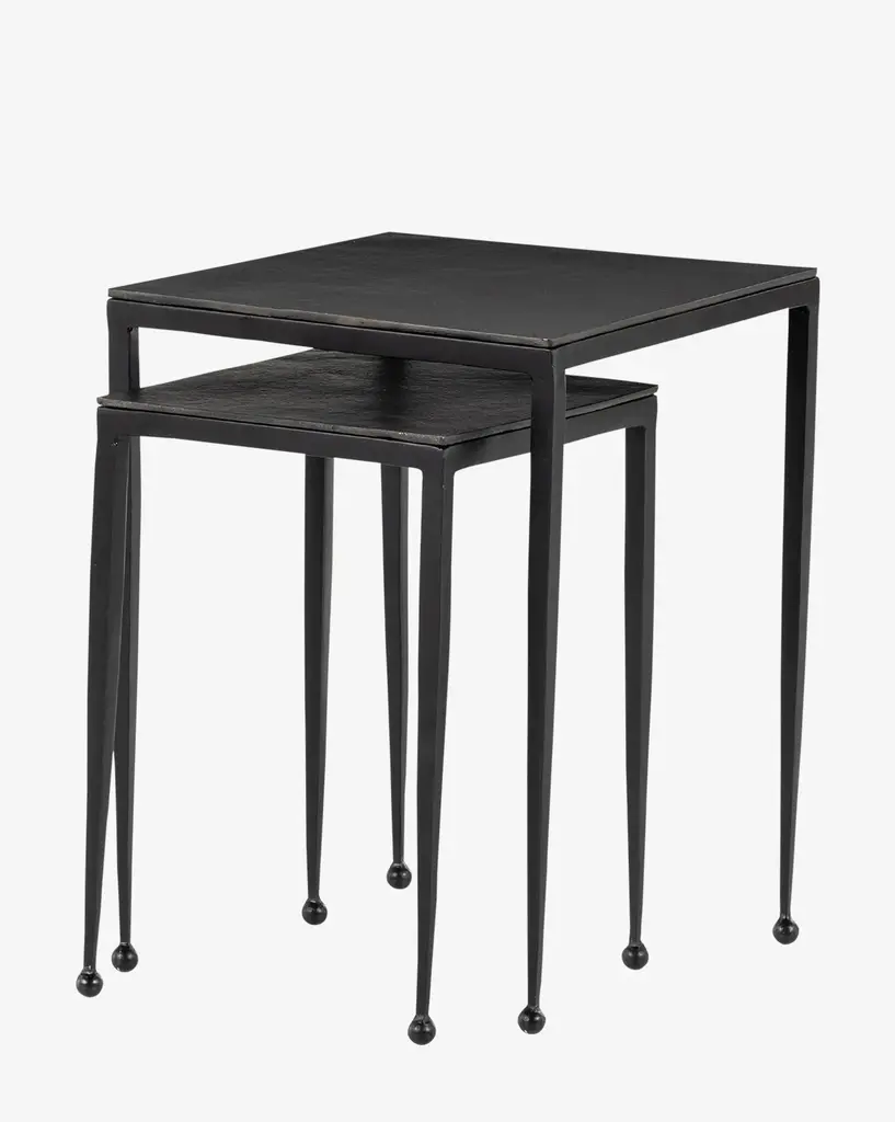 Creating long, slender lines, the Biddy Nesting End Tables have elongated legs featuring rounded feet. This small detail is impactful, giving a sense of balance to its legs and squared-off tabletop. Finished using a wire-brushed technique, the piece has swirling tones that are powder-coated and lacquered to create dimension and depth inspired by antique furniture.