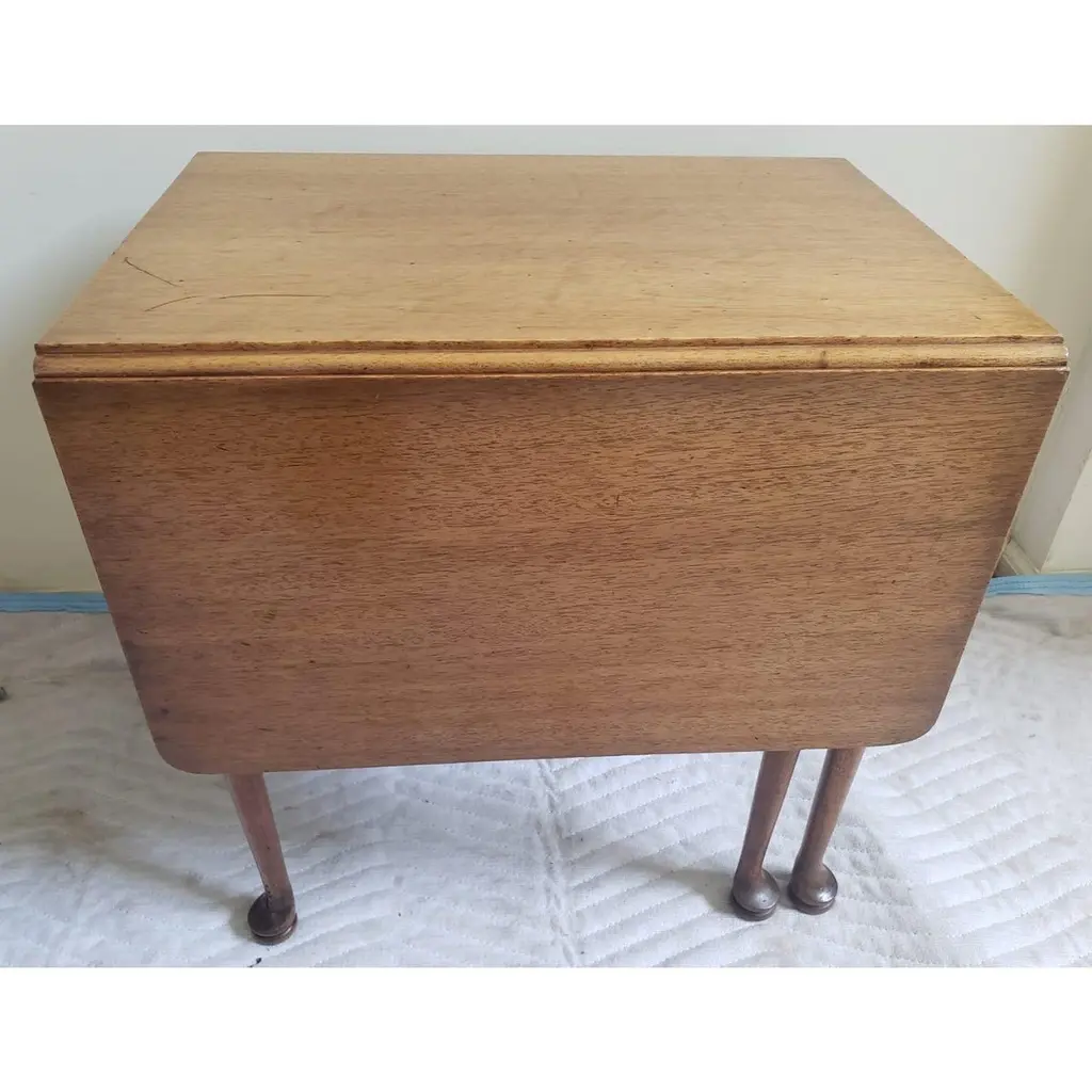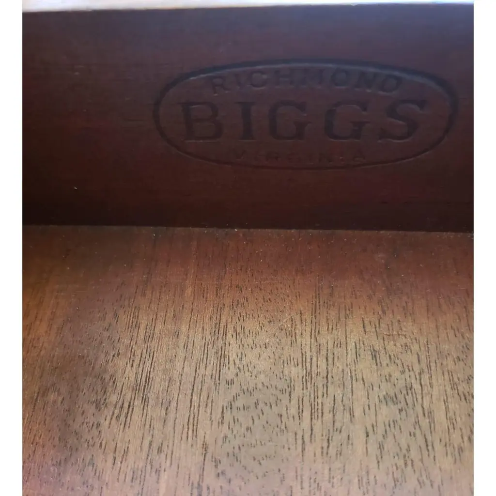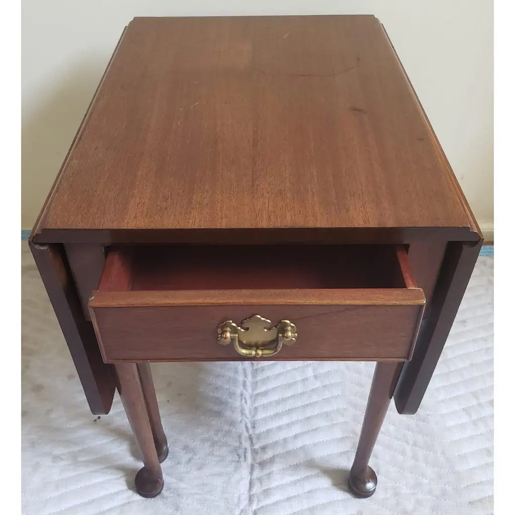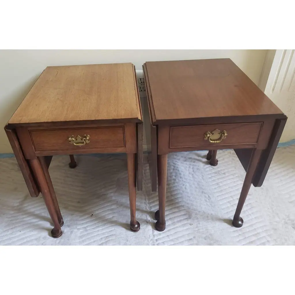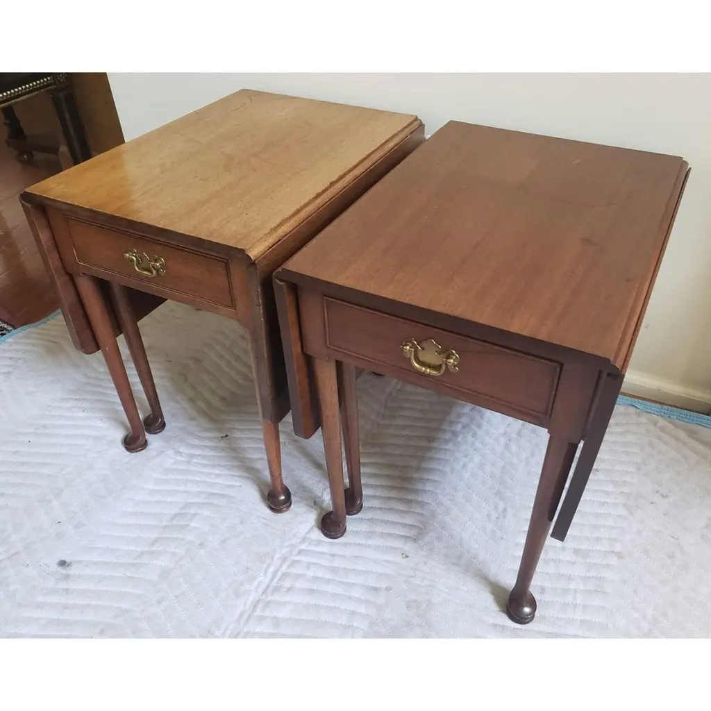 Biggs Richmond, a division of the famous Kittinger Furniture, pair of chippendale mahogany small drop leaf table pembroke table. Tables are in excellent structural condition with some finish loss. No obvious scratches.Table measures 15"W x 20"D x 20"H. with leafs down. With both leafs up it measures 36.25"W x 20"D x 20"H.