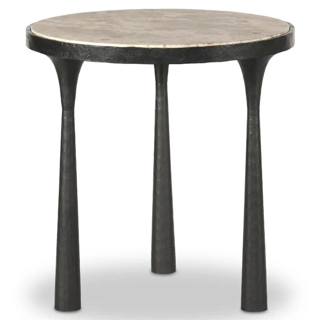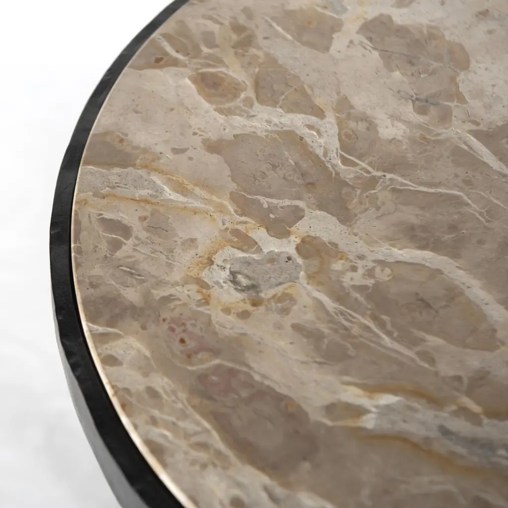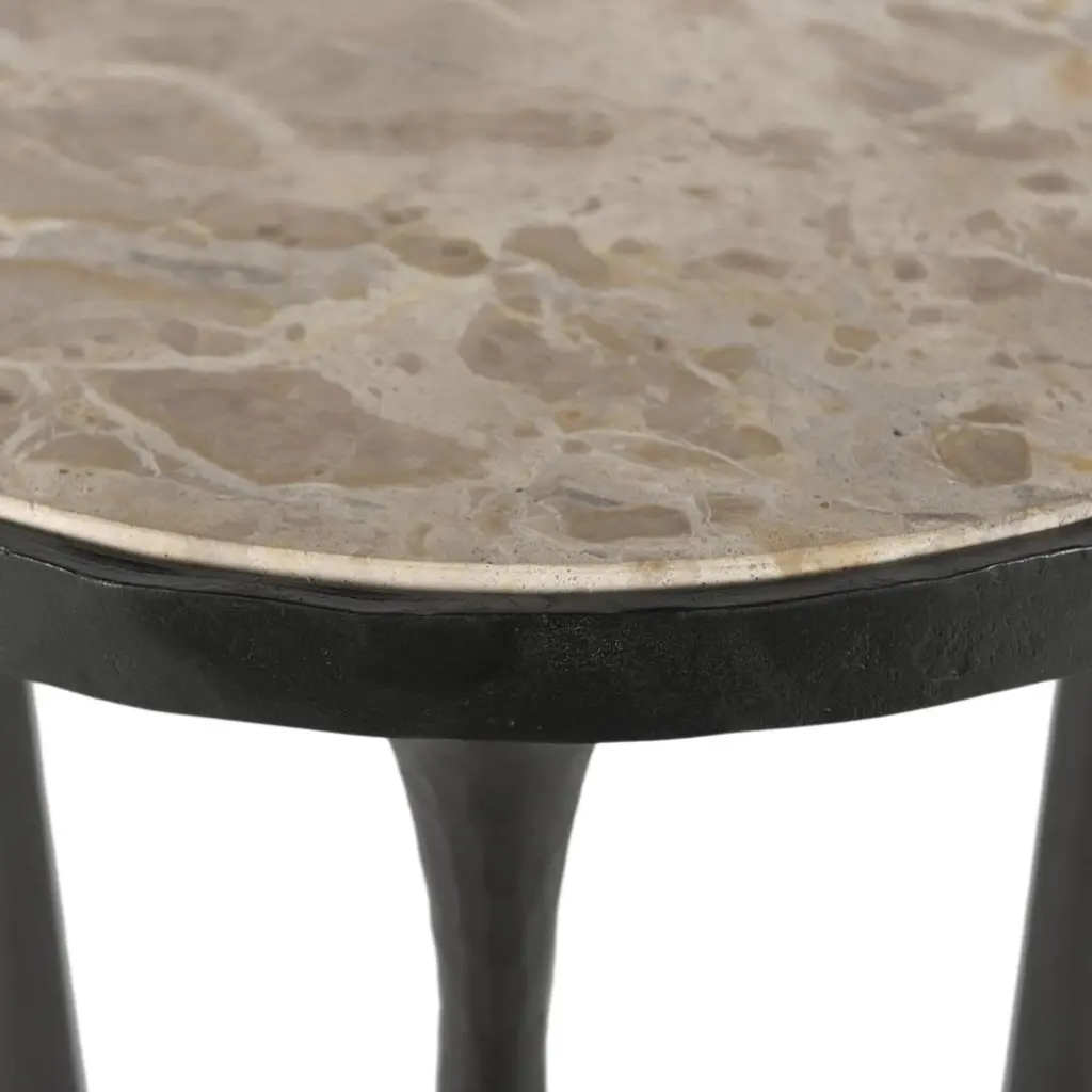 A design collaboration by Amber Lewis and Four Hands. Cast iron and detail-rich marble come together for a naturally worn look. Three tapered hourglass-shaped legs with a hammered gunmetal finish support a marble top rich in rock deposits - a complementary contrast of color and material.
