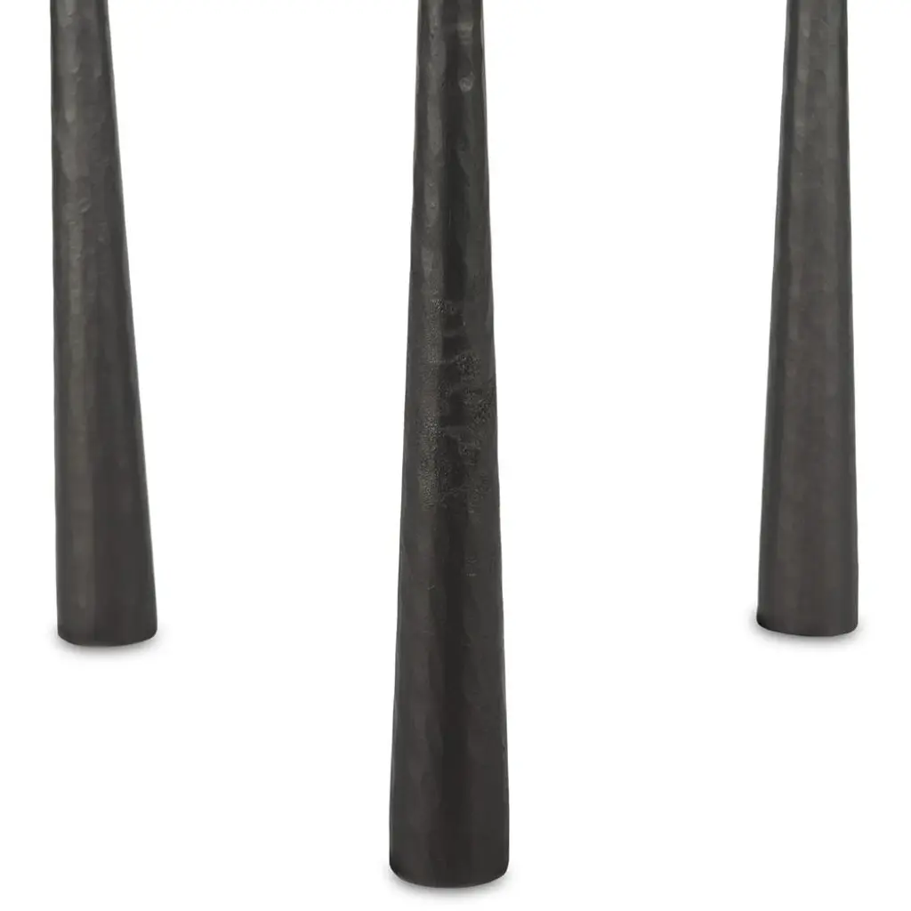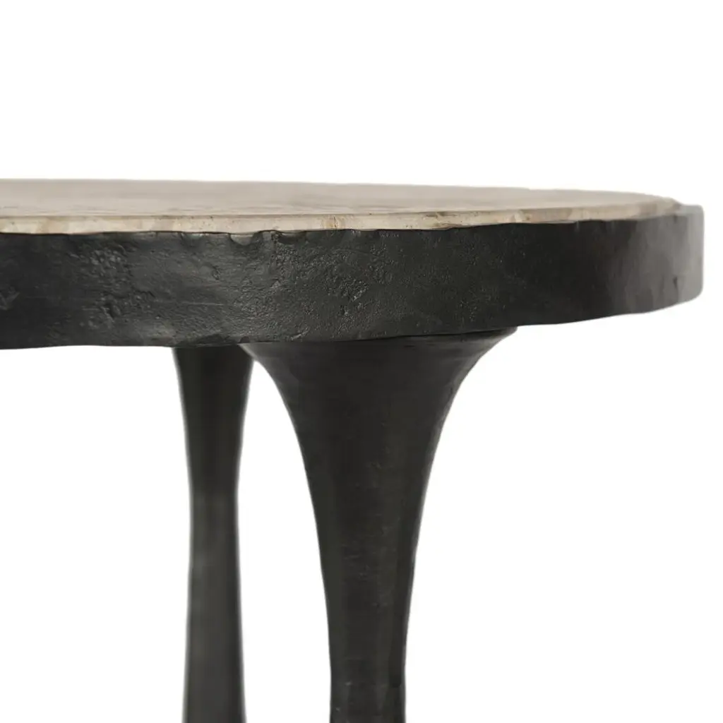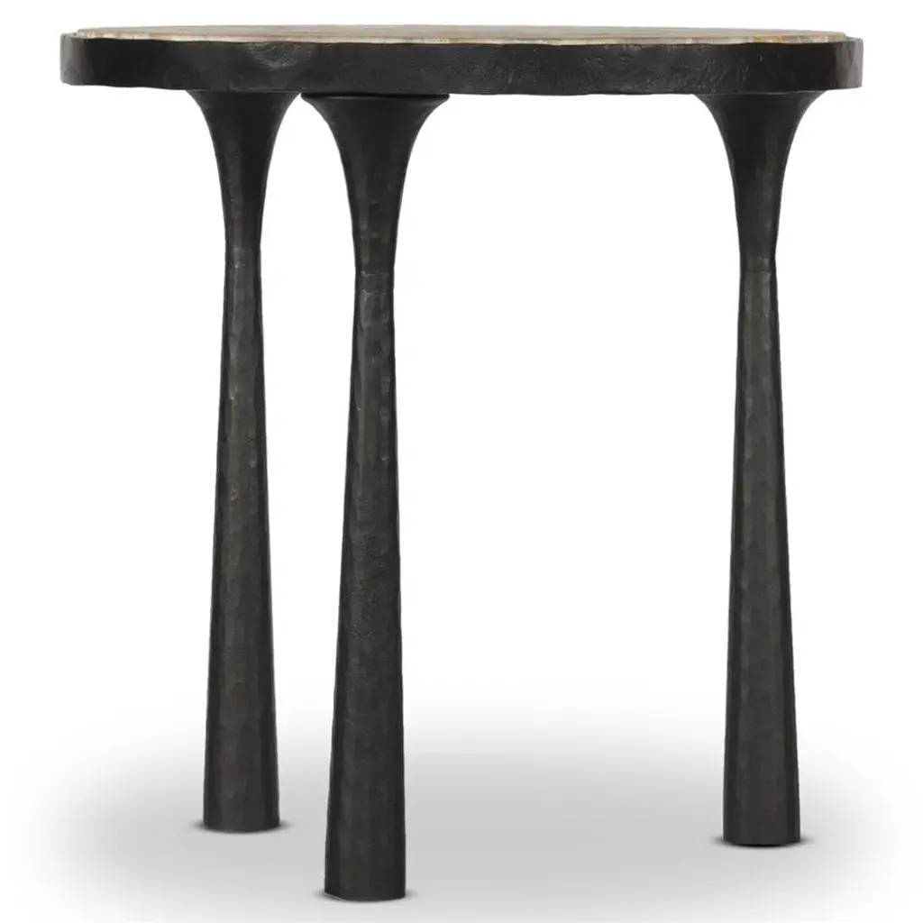 A design collaboration by Amber Lewis and Four Hands. Cast iron and detail-rich marble come together for a naturally worn look. Three tapered hourglass-shaped legs with a hammered gunmetal finish support a marble top rich in rock deposits - a complementary contrast of color and material.