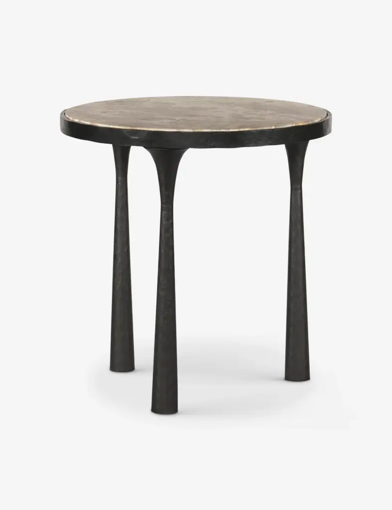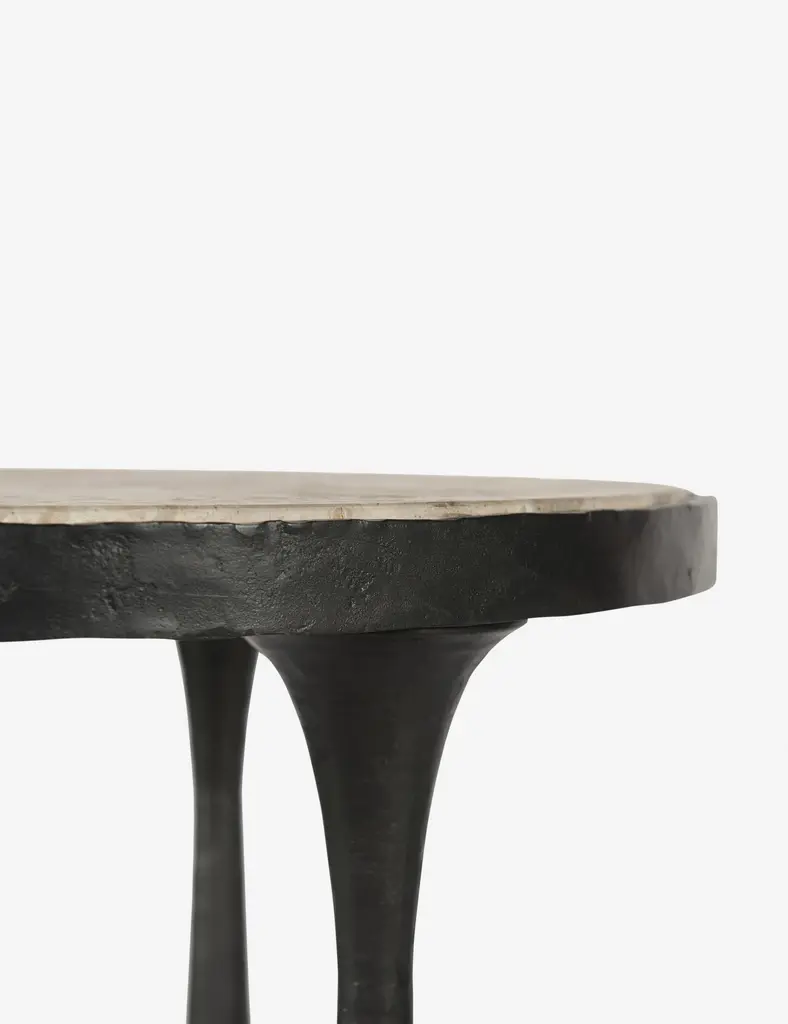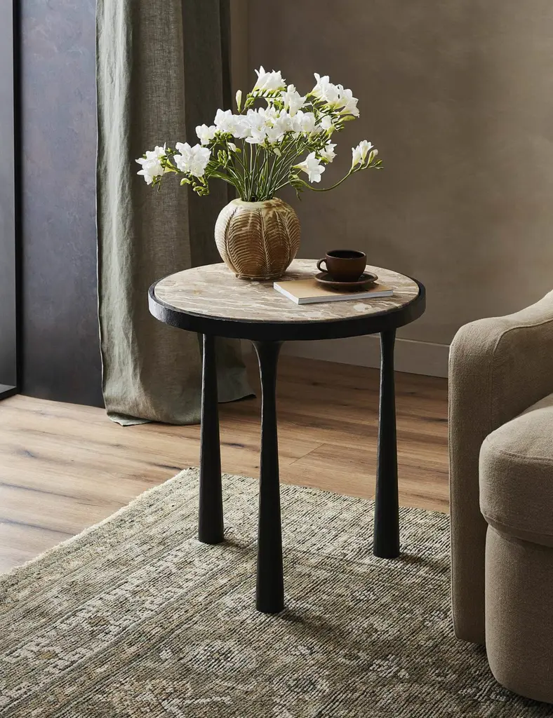 Four Hands brings their exceptional craftsmanship to a timeless collection rooted in Amber Lewis' perennial California style. Hourglass legs paired with sleek curves, highlight a character-rich marble top on a modern side table. This round end table is a charming choice offering casual, sculpted flair beside an occasional chair or sofa.
