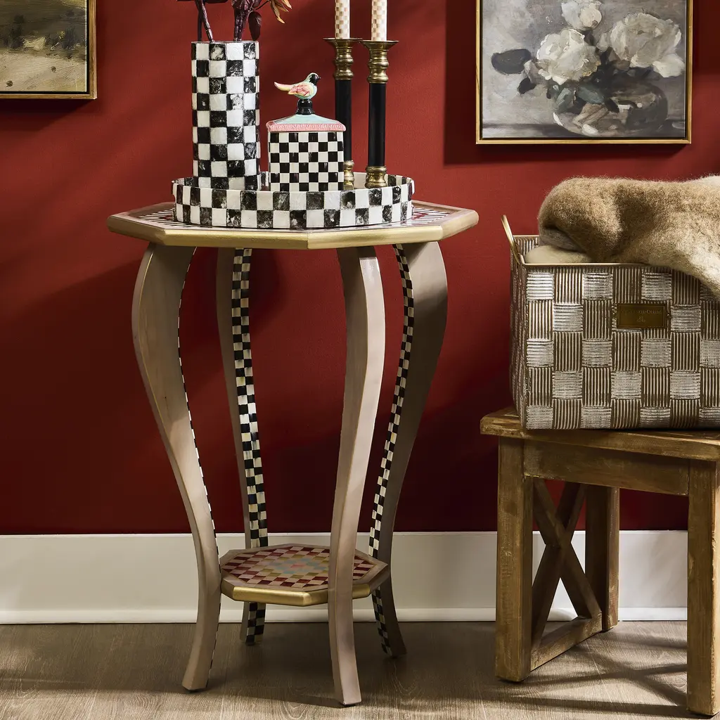 Both charming and exotic, the Birdsong Accent Table is the perfect addition for those who like to go bold on their decor. The tabletop shows a serene scene of birds mingling amongst interwoven vines, trimmed with a Courtly Stripe frame, while the table's lower shelf shows off a beautifully colored array of our classic check pattern, all beautifully pulled together by gold and Courtly Checked table legs. Pair this unique piece with other items from the Birdsong collection, or Courtly Checks and Stripes to make a true MacKenzie-Childs statement.