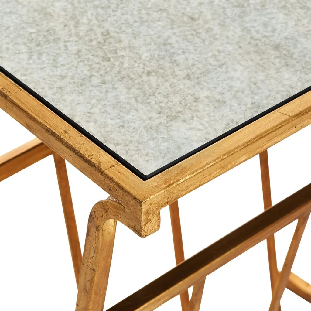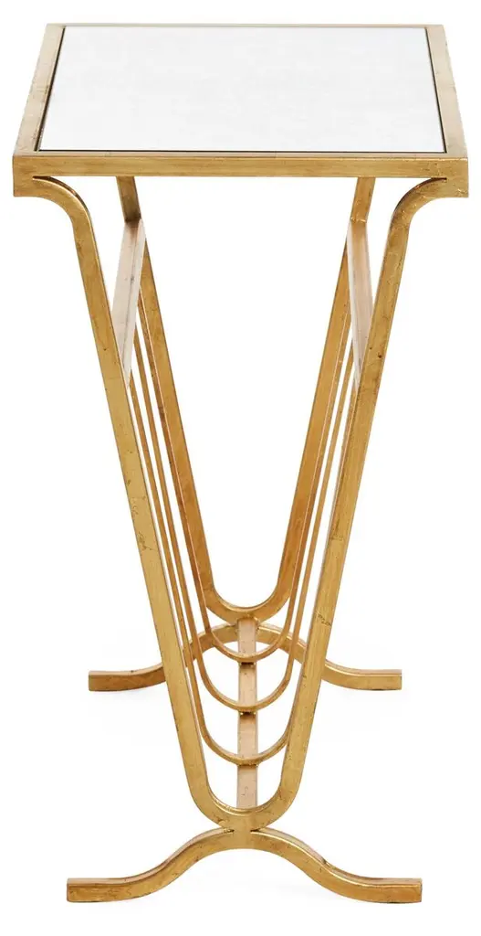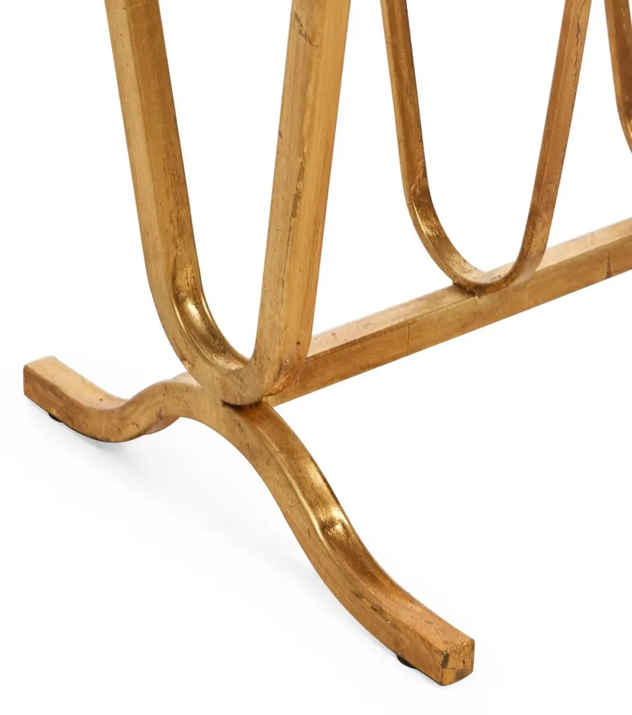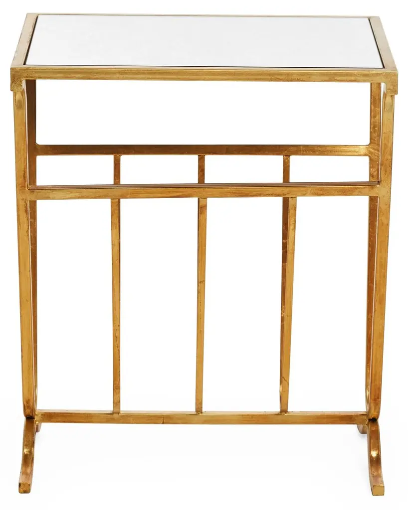 A side table and magazine rack all-in-one, this multifunctional piece is crafted with a glass top and a golden iron frame.