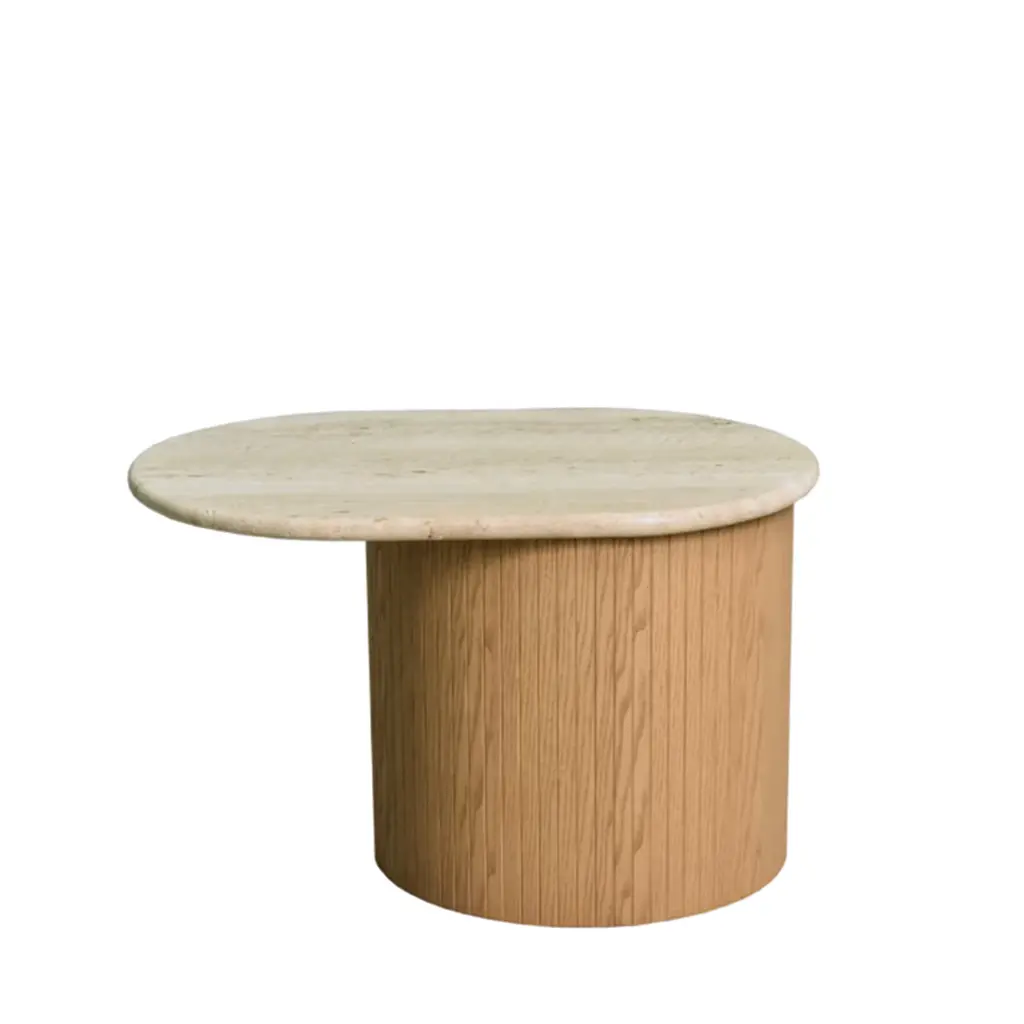 A sculptural silhouette marked by an intriguing asymmetrical design lends this contemporary-style side table its eye-catching look. Luminous and prized, the Travertine top comes in an oval shape with bevelled edge, a predilection for curves confirmed by the bold and ridged cylindrical ash base. Variants in multiple sizes are available, please contact the Concierge for details and pricing.