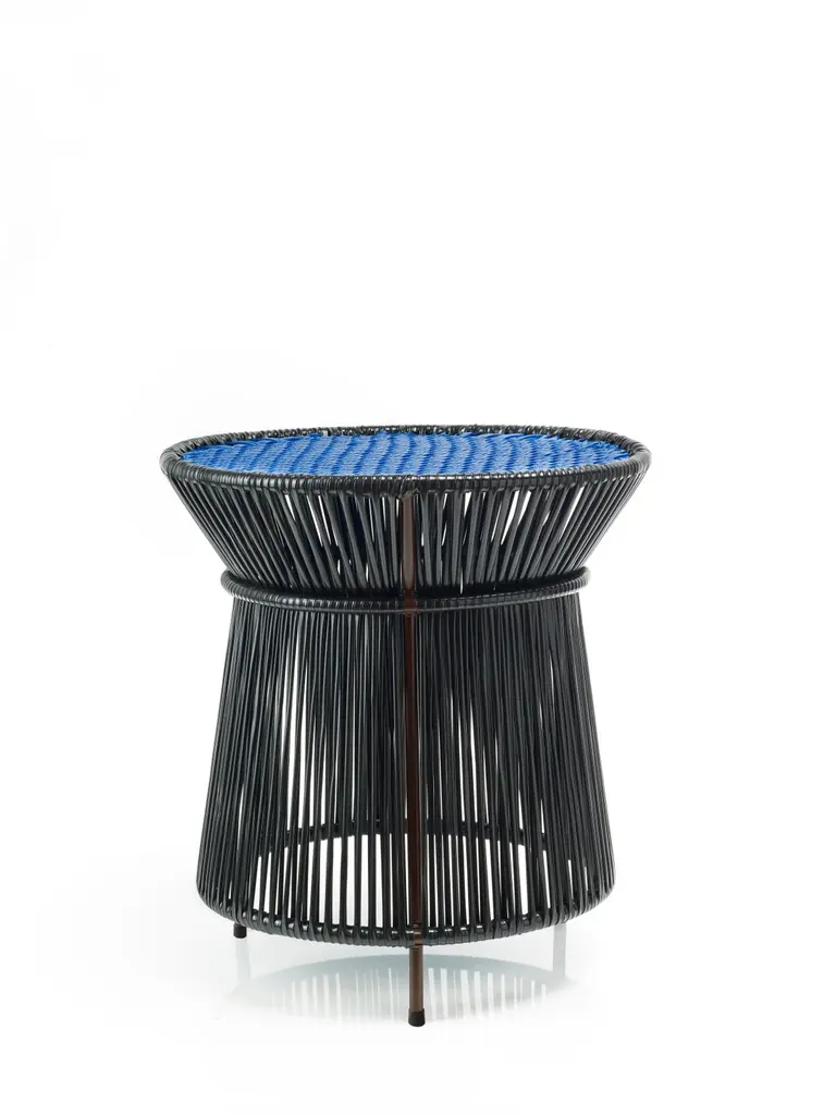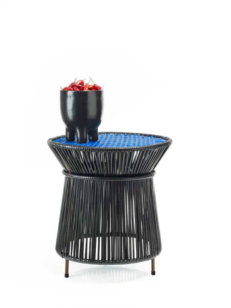 Black Caribe High table by Sebastian HerknerMaterials: Galvanized and powder-coated tubular steel. PVC strings are made from recycled plastic.Technique: Made from recycled plastic and weaved by local craftspeople in Colombia. Dimensions: Diameter 46.1 x H 50 cm Also available colors: blue/ mint/ black, mint/ green/ black, orange/ rose/ curry, green/ rose/ curry.The charming Caribe High Side Table is a colorful companion for seating arrangements inside and outdoors. It’s part of the Caribe collection, designed by Sebastian Herkner for ames. The German designer visited Colombia together with Ames founder Ana Maria Calderon-Kayser and translated the vibrancy and spirit of the country’s people and traditions into joyful, modern furniture pieces defined by clean lines, strong colors, and the hand-woven webbing.Each table is made in Santa Marta, a city on the Caribbean coast of Colombia, by local craftspeople. They weave the PVC strings, which are made from recycled plastic, around the tubular steel frame. The weaving technique the artesanos and artesanas use are called Momposino, a traditional method known for intricate patterns. Just the preparation of all the materials takes ten days, while the production of each table takes two days.German designer Sebastian Herkner is a long-term collaborator of Ames and has visited Colombia multiple times to experience the country’s cities, nature and people first hand. He also visited many of the ateliers that Ames has partnered with to learn about the unique traditional crafts of Colombia's regions. A sought-after contemporary designer and recipient of many industry awards, he has worked with many international design brands, creating intriguing pieces that showcase his intuition for interesting material, color, and texture combinations.