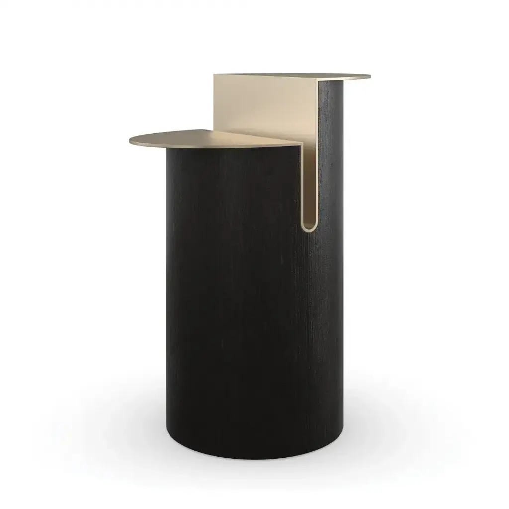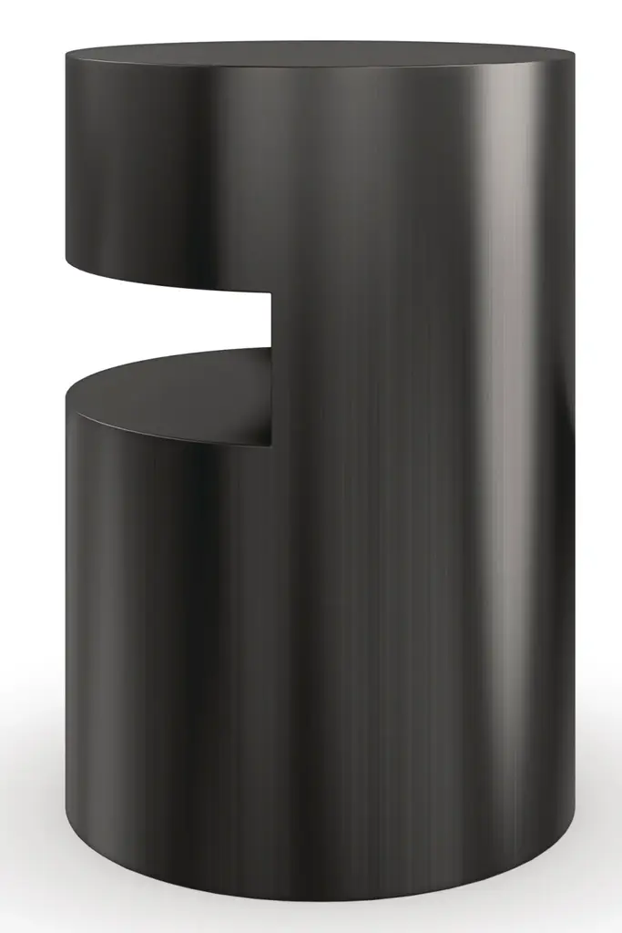 A Brushed Tungsten finish elevates this tall metal cylinder, designed to pair with our Constellation cocktail table. Adds warmth and a shimmering metallic accent, whether in orbit with other pieces, or styled on its own as a simple yet luxurious modern end table. A clever use of negative space adds depth and a functional element.