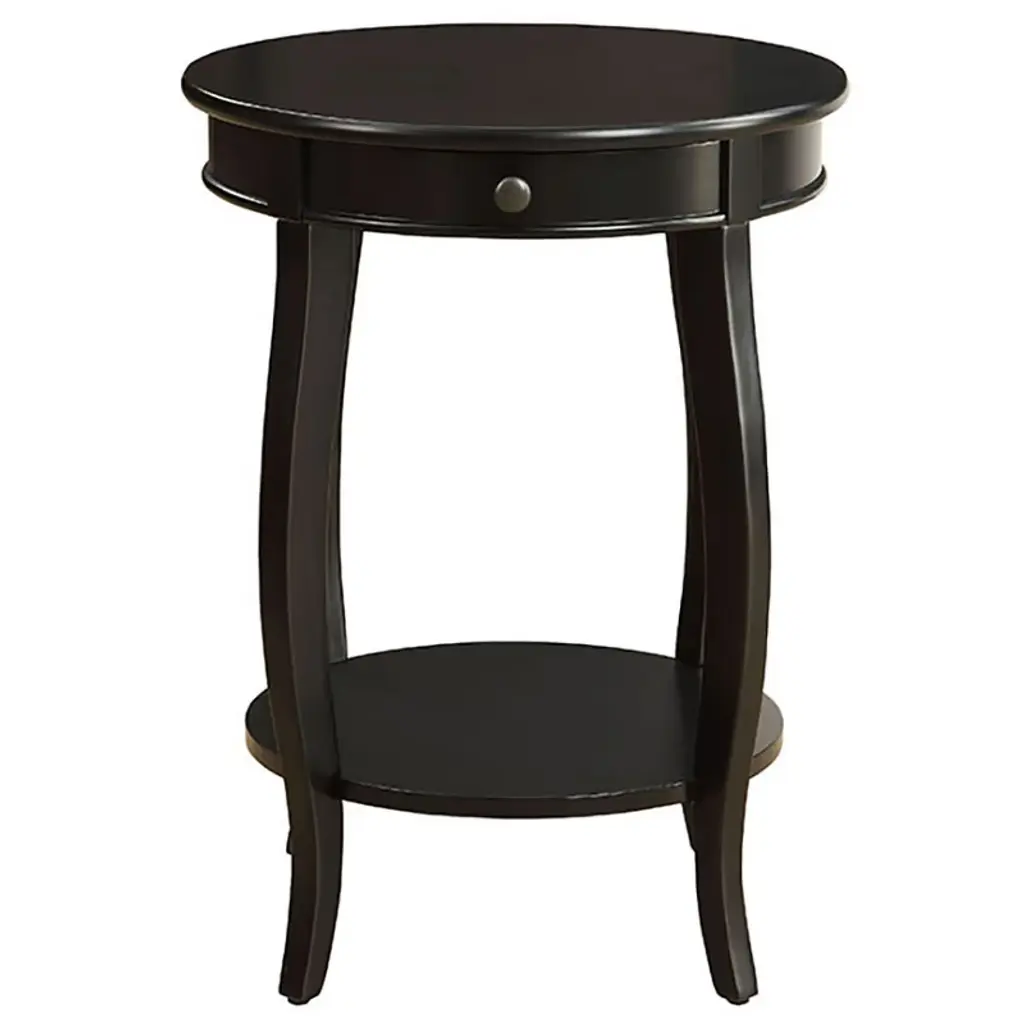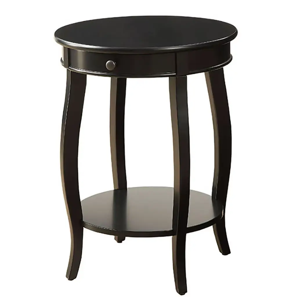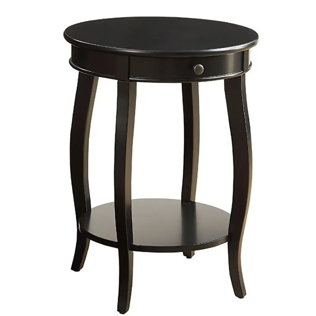 Romance Copy This end table features a convenient drawer and bottom shelf for ample storage, keeping your essentials organized and within reach. The round tabletop provides a smooth surface for decor or beverages, while its casual style and gracefully curved wooden cabriole legs enhance its aesthetic appeal and stability, making it a versatile addition to any home. Product Details Set includes One (1) end table Dimensions 24.5 inches high x 18.5 inches wide x 18.5 inches deep Materials Solid Wood, Wood Veneer, MDF Finish color Black