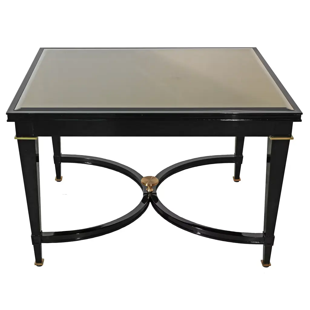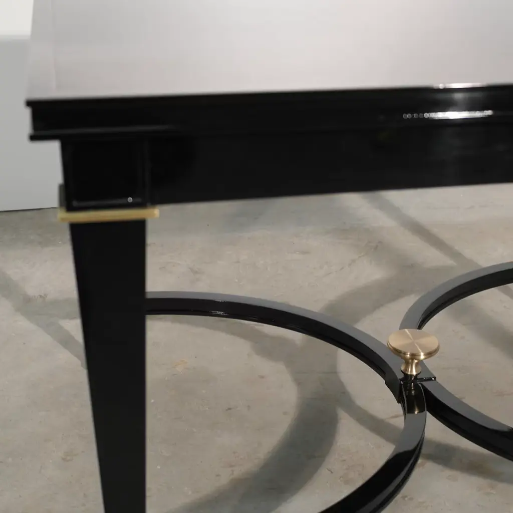 This elegant side table is crafted from solid wood, boasting a glossy black lacquered finish. Featuring tapered legs and two semi-circular base details, the design is enhanced with brass accents, characterized by a light brushed bronze finish. Finished with a polished bronze top with chamfered edges, the Black Gloss Rectangular Side Table makes a timeless addition to the home.