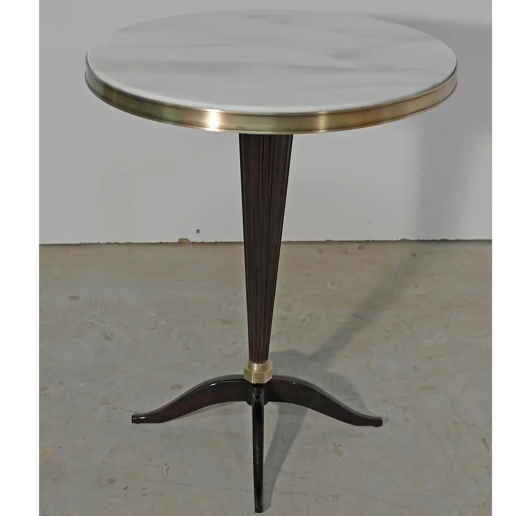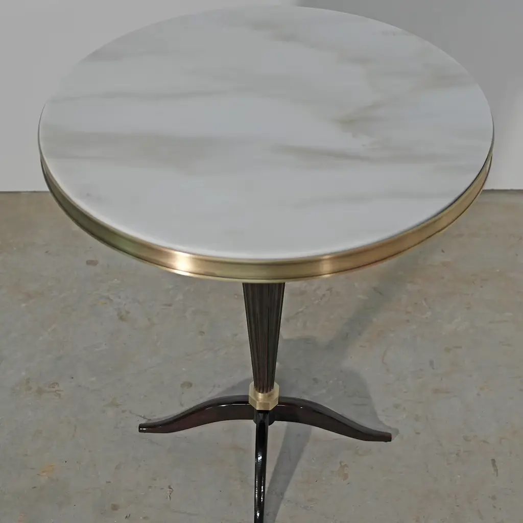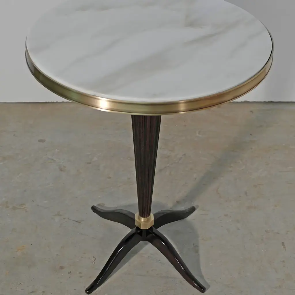 This round side table is crafted from solid wood. Its glossy rosewood-stained finish brings a warm feel to any room, enhanced with brass accents with a brushed bronze finish. Finished with a Calacatta marble top, the Black Gloss Round Side Table makes a timeless addition to modern and traditional interiors alike.