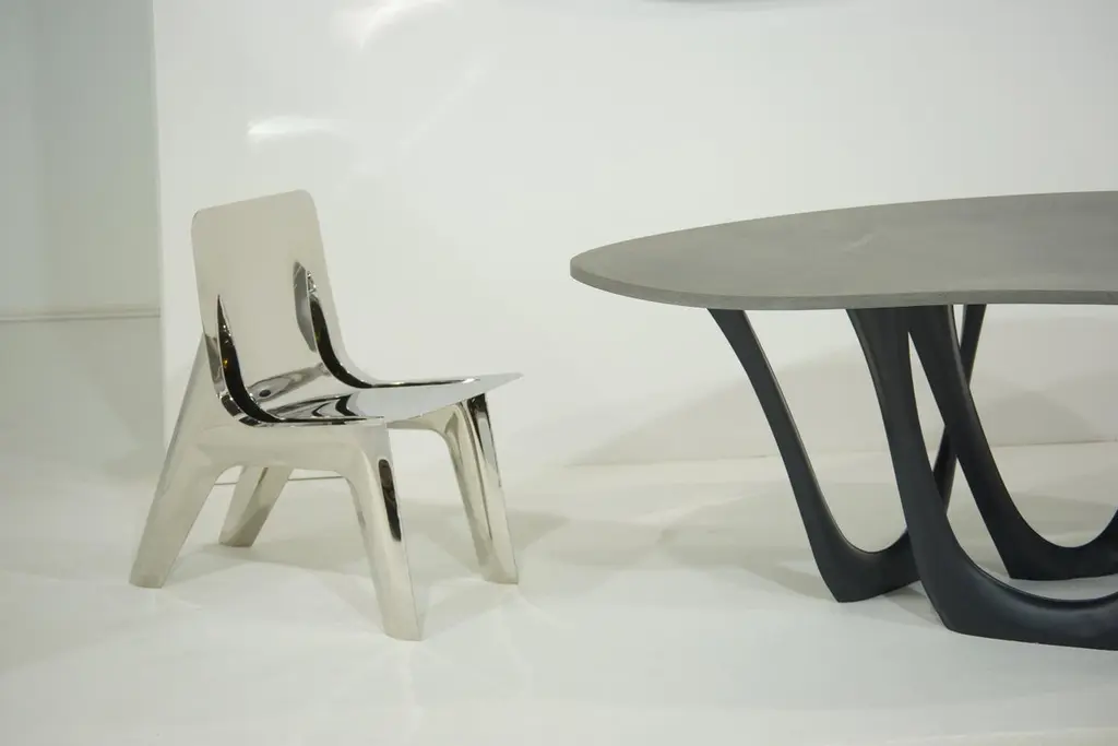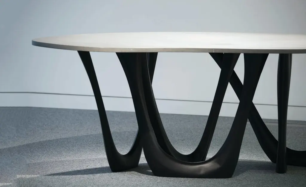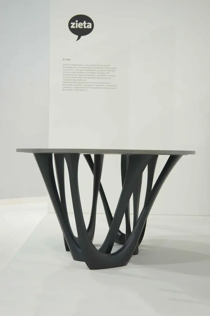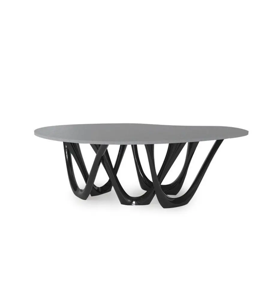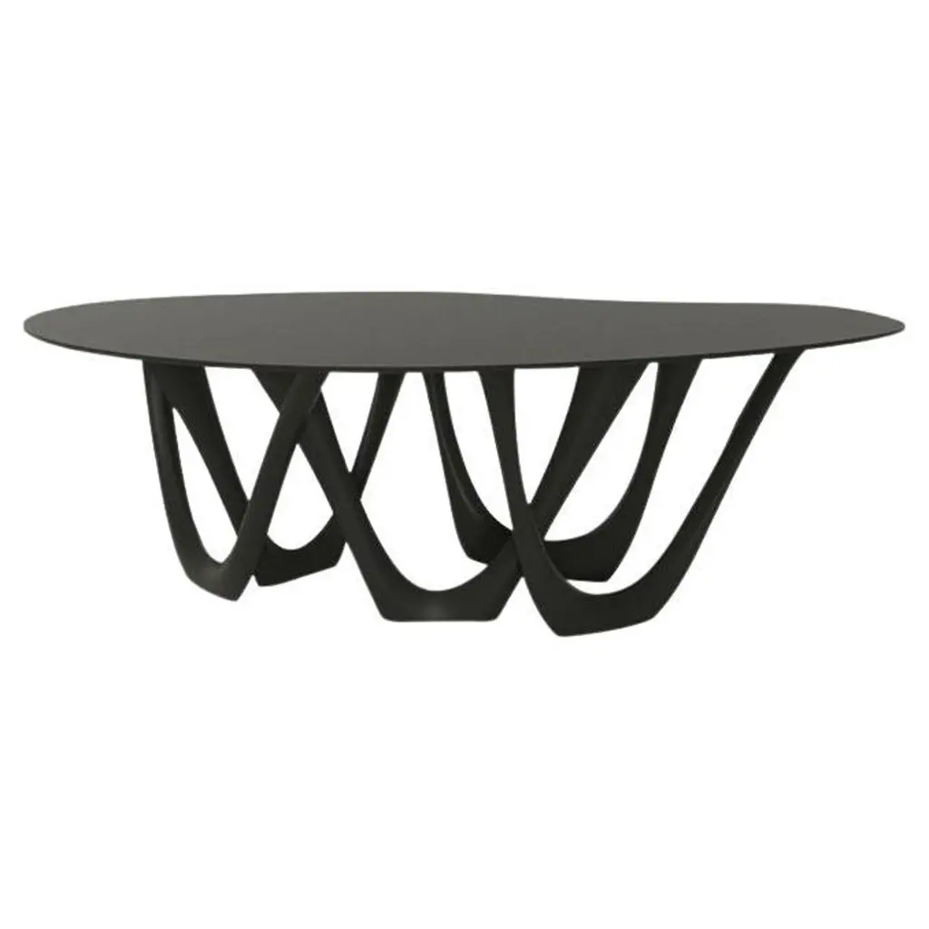 Black Glossy concrete steel G-table by ZietaDimensions: D 110 x W 220 x H 75 cm Material: Concrete top. Carbon steel base. Finish: Powder-Coated. Glossy finish. Available in colors: Beige, black/brown, black glossy, blue-grey, concrete grey, graphite, gray beige, gray-blue, moss grey, olive green, pale green, resende, stone gray, tele gray, umbra grey, white glossy, white matt, window grey or yellow olive. Available in finishes: stainless steel, wood top, and aluminum. Also available in the side table version. G-Tables is a series of bionically shaped objects that are customized for customers' needs. Each table is “tailor-made” and created together with the user who can choose from a variety of materials, finishes and also decide about parameters like the number of people sitting at the table. The shape of the table, leg construction, and legs layout is optimized by the algorithm applied by designers to fit the distant space and meet the most demanding interiors.About Zieta: Zietas main goal is to deliver uniqueness and customization in design and construction while keeping the production, transport, and warehousing innovatively efficient.This is how they imagine the future world: Light, durable structures of customized applications produced on demand out of one-of-a-kind parts, yet efficiently.They use a computer-controlled production process. Customized pattern, customized form, customized function, one-of-a-kind product, and outstanding precision are what they deliver.You will find all of this philosophy reflected in the products. The research, they discover new possibilities, they play with forms and they deliver a beautiful, innovative, surprising outcome to people who love the design and who care about design development.They believe their work is a valuable contribution to the world of design not only by the unique beauty of the forms but most of all by opening ultra-innovative opportunities of forming and new paths for the world of the future. __