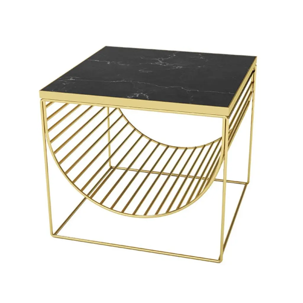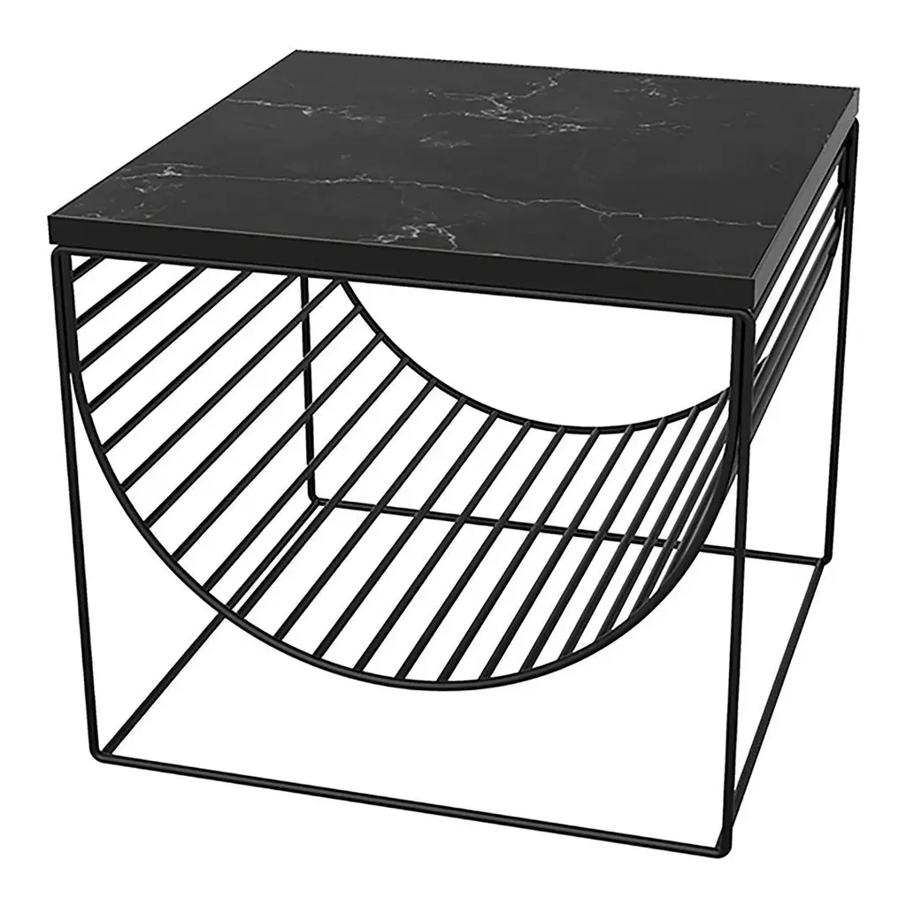 Black marble and steel side tableDimensions: L 50 x W 50 x H 44.3 cmMaterials: Marble, steel This series consists of three different designs that you can combine in many different ways. The table tops come in two different colored luxurious marble and have two different colored base frames. This makes them highly versatile as they can fit in any room and there are endless combination possibilities.The tables can stand alone as side or coffee tables, as well as nightstands up against the wall. Combine with one or two more - and you have the perfect sofa table, where you can have room for magazines. The materials are timeless and yet iconic and the tables will make sure to turn heads where ever you place them.