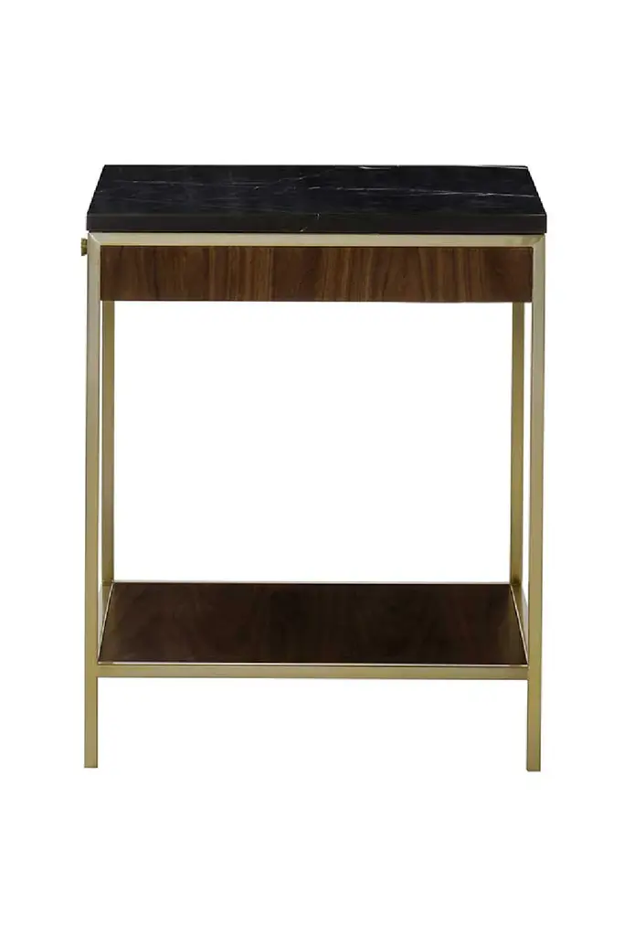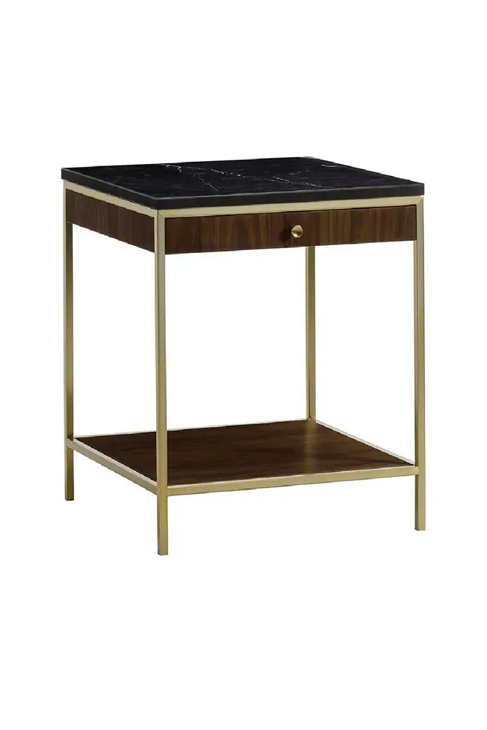 This one-drawer side table is influenced by mid-century modern design aesthetic, incorporating clean, architectural lines with luxurious dark wood with oak and walnut veneering, satin brass frame and black nero marquina marble finishes. The dark surfaces work harmoniously together to create a timeless piece for your space.