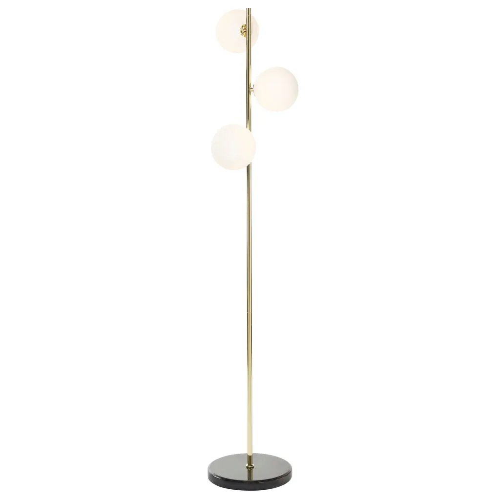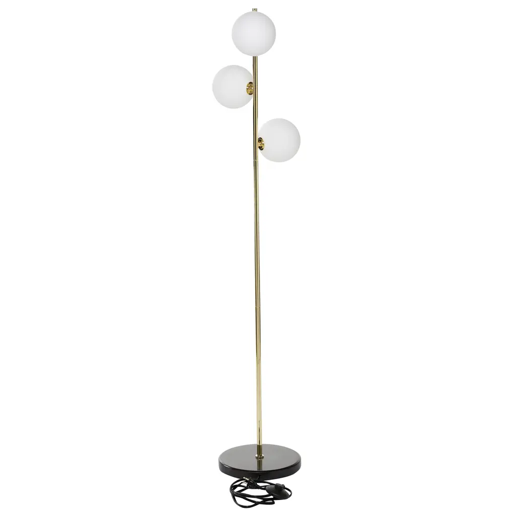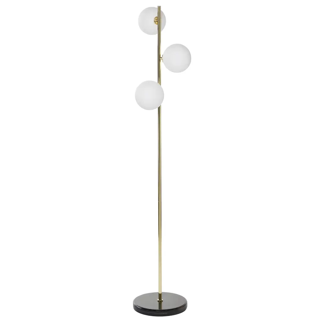Add sculptural, modern style with soft ambient lighting to your living room or bedroom with this white orb floor lamp. Featuring three large white orbs staggered along a metallic gold stem, this light is full of contemporary and modern style. The base is solid and sturdy marble, adding sophisticated style. The footswitch at the base avoids unsightly cords, allowing this lamp to take center stage with a diffused floating light effect. Uses three G9 light bulbs (not included). This item has a 76" cord length. Suitable for indoor use only. This floor lamp powers via a cord switch and does not require batteries. Marble is a product of nature and no two pieces are exactly alike, it is prone to variations in color and/or patterns in the material that adds to the beauty and charm of the piece. This item comes shipped in one carton.