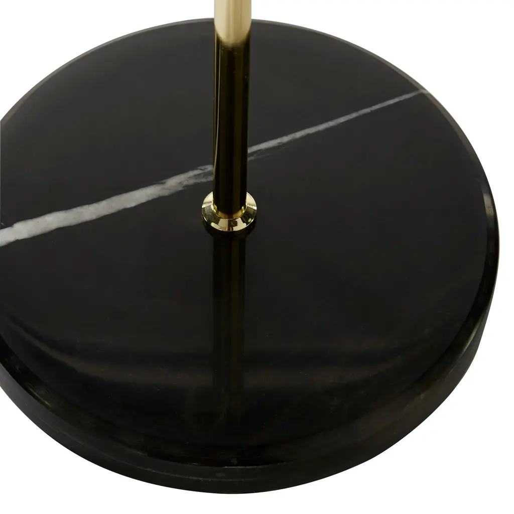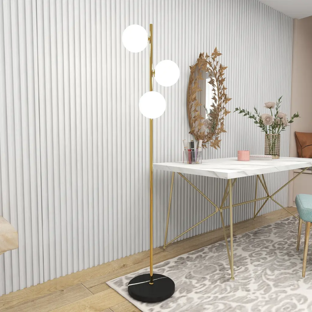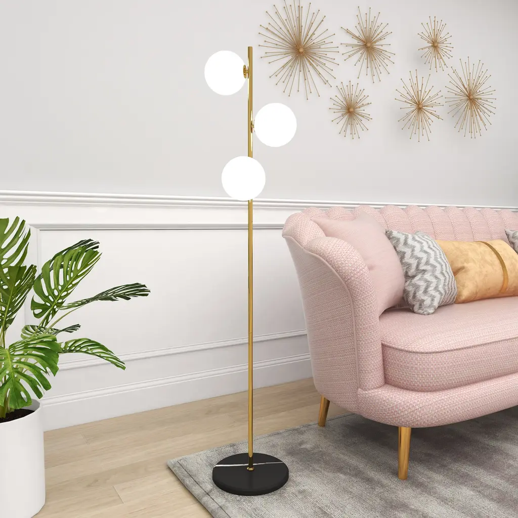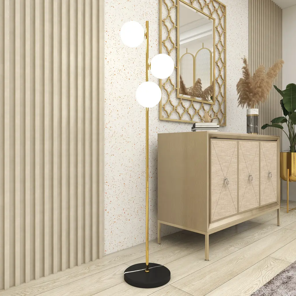 Add sculptural, modern style with soft ambient lighting to your living room or bedroom with this white orb floor lamp. Featuring three large white orbs staggered along a metallic gold stem, this light is full of contemporary and modern style. The base is solid and sturdy marble, adding sophisticated style. The footswitch at the base avoids unsightly cords, allowing this lamp to take center stage with a diffused floating light effect. Uses three G9 light bulbs (not included). This item has a 76" cord length. Suitable for indoor use only. This floor lamp powers via a cord switch and does not require batteries. Marble is a product of nature and no two pieces are exactly alike, it is prone to variations in color and/or patterns in the material that adds to the beauty and charm of the piece. This item comes shipped in one carton.
