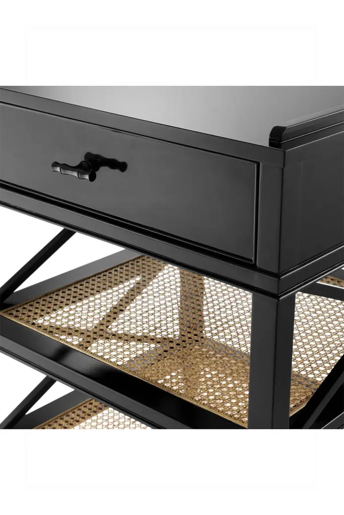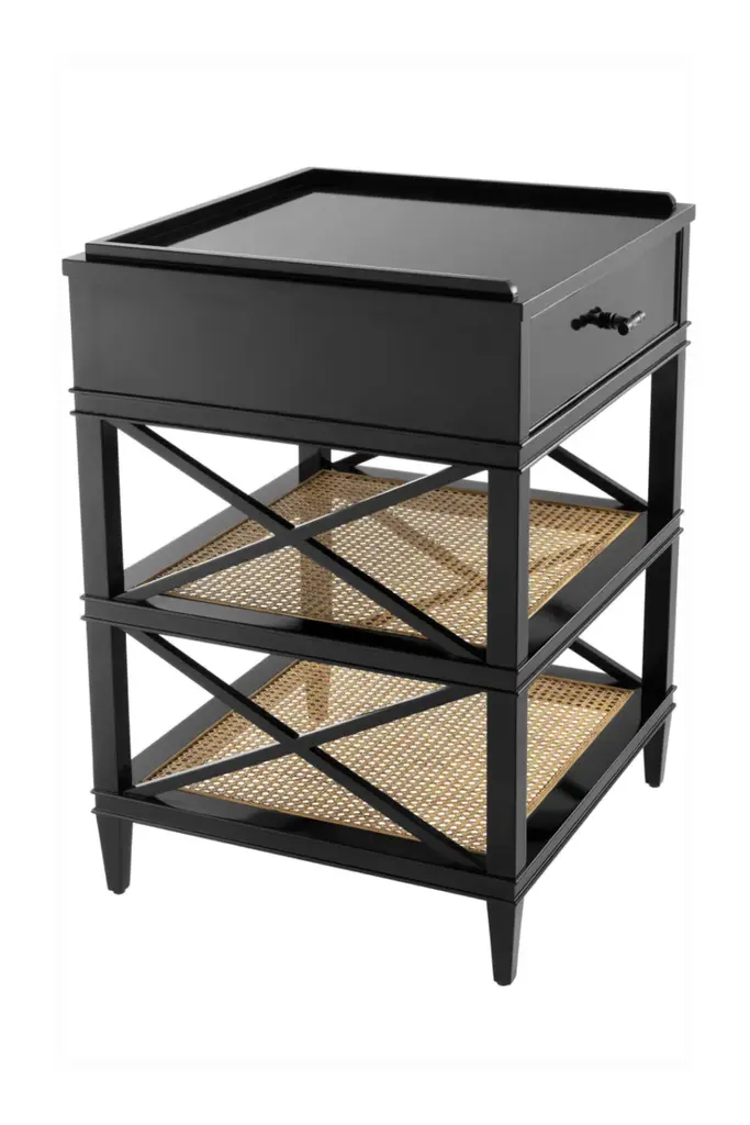Featuring a drawer and two lower shelves, the enchanting Bahamas Side Table makes a great nightstand. It is comprised of pine wood, natural mesh cane webbing and clear glass and has a black finish and cross bars for added design.