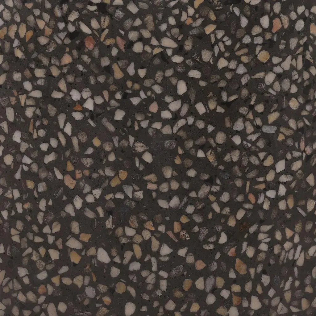 Concrete terrazzo round side table with black ground and speckles of browns, beiges, and grays. Perfect for outdoor or indoor use. Each slightly unique in terrazzo appearance. Weighs approx. 90 lbs.