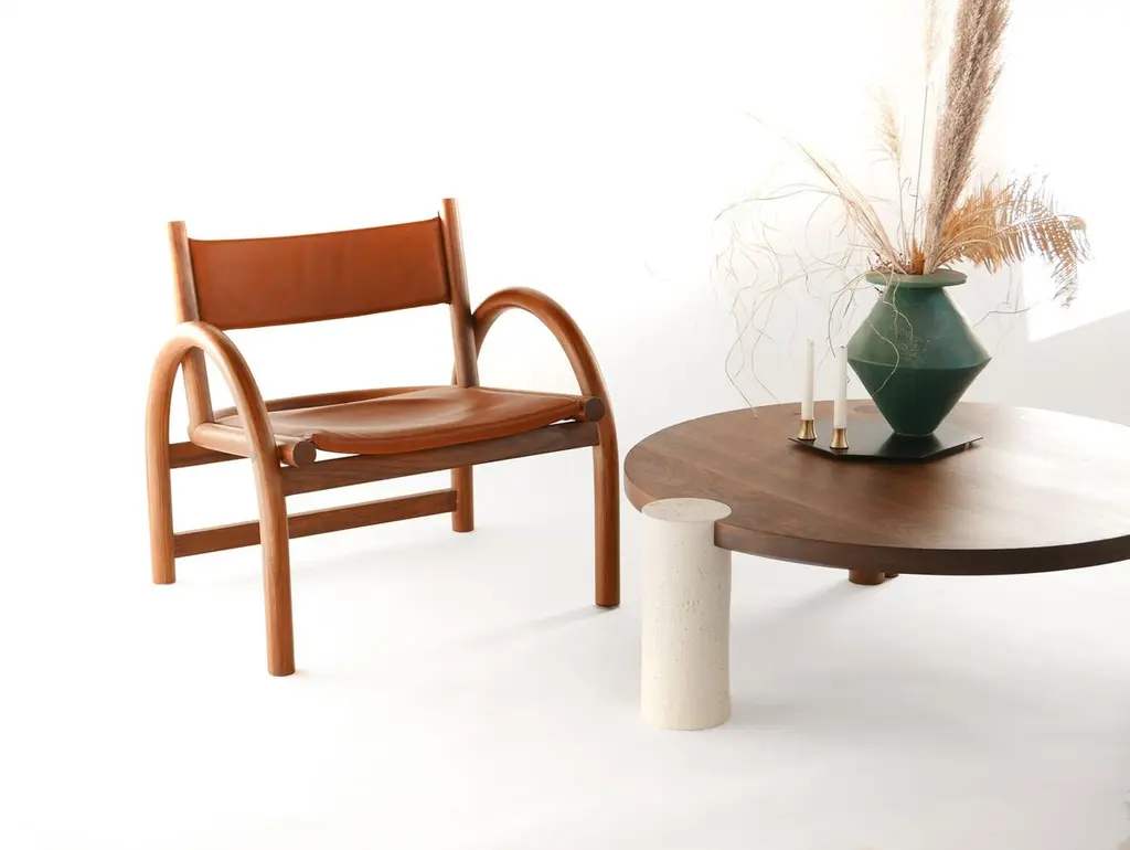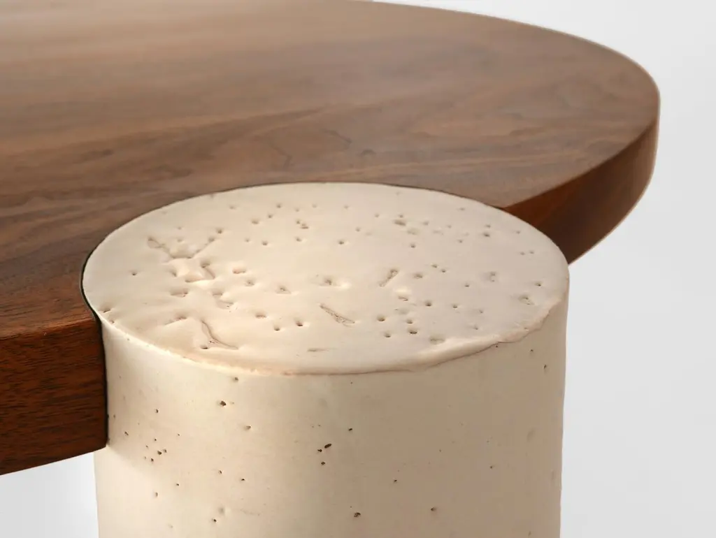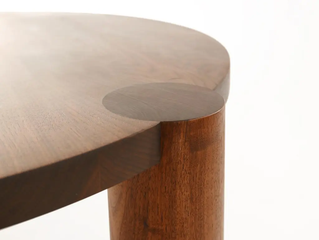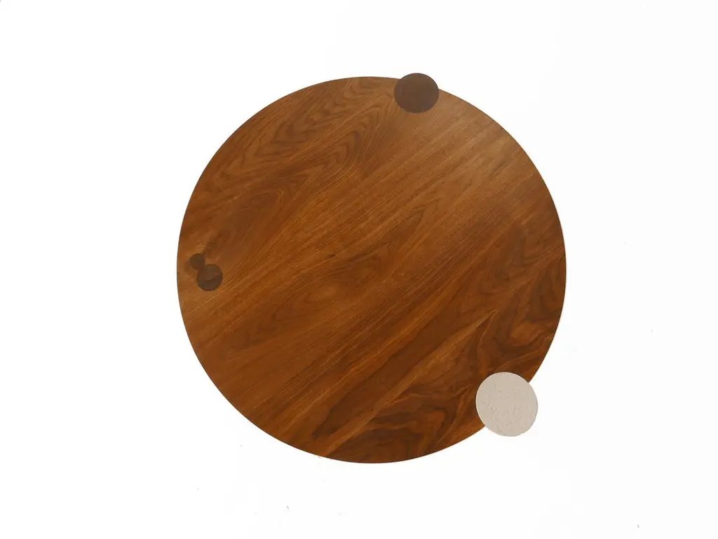 This 24" solid American black walnut side table with featured ceramic leg is inspired by the sun’s apparent orbit around the earth, the table legs exposed on the top surface create a celestial composition. The table top is made out of solid American black walnut and features a 6" white glazed ceramic leg alongside 3 additional solid wood legs. Hinterland Design's "Ecliptic Table" is also available in whitewashed Canadian white ash, and as larger 36" and 48" round coffee tables, all of which are 14" high. The legs are customizable be either copper plated, brass, blackened or powder coated steel. In this one-of-a-kind version, the main 6" wide leg is hand thrown clay, fired and then glazed in white to compliment the walnut.Hinterland designs and manufactures each of their pieces in its Vancouver, Canada workshop.