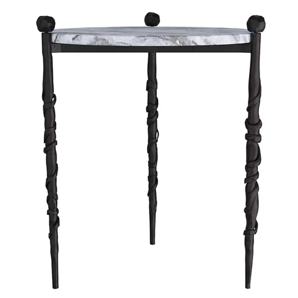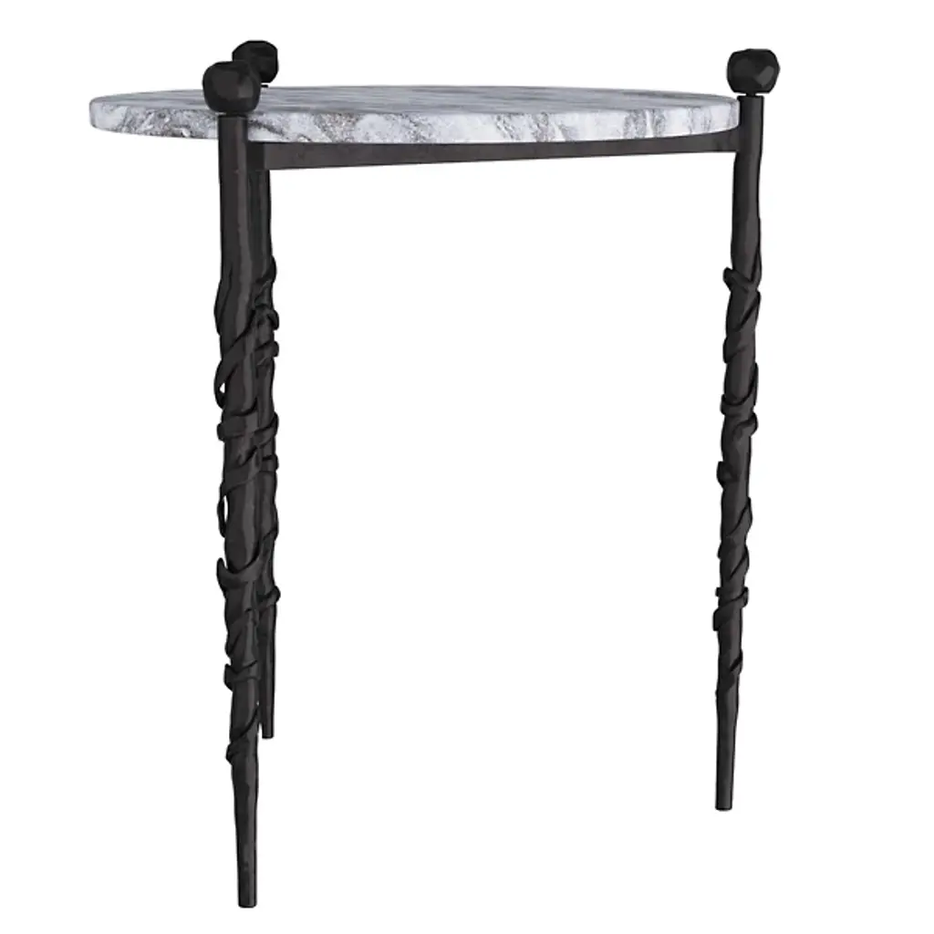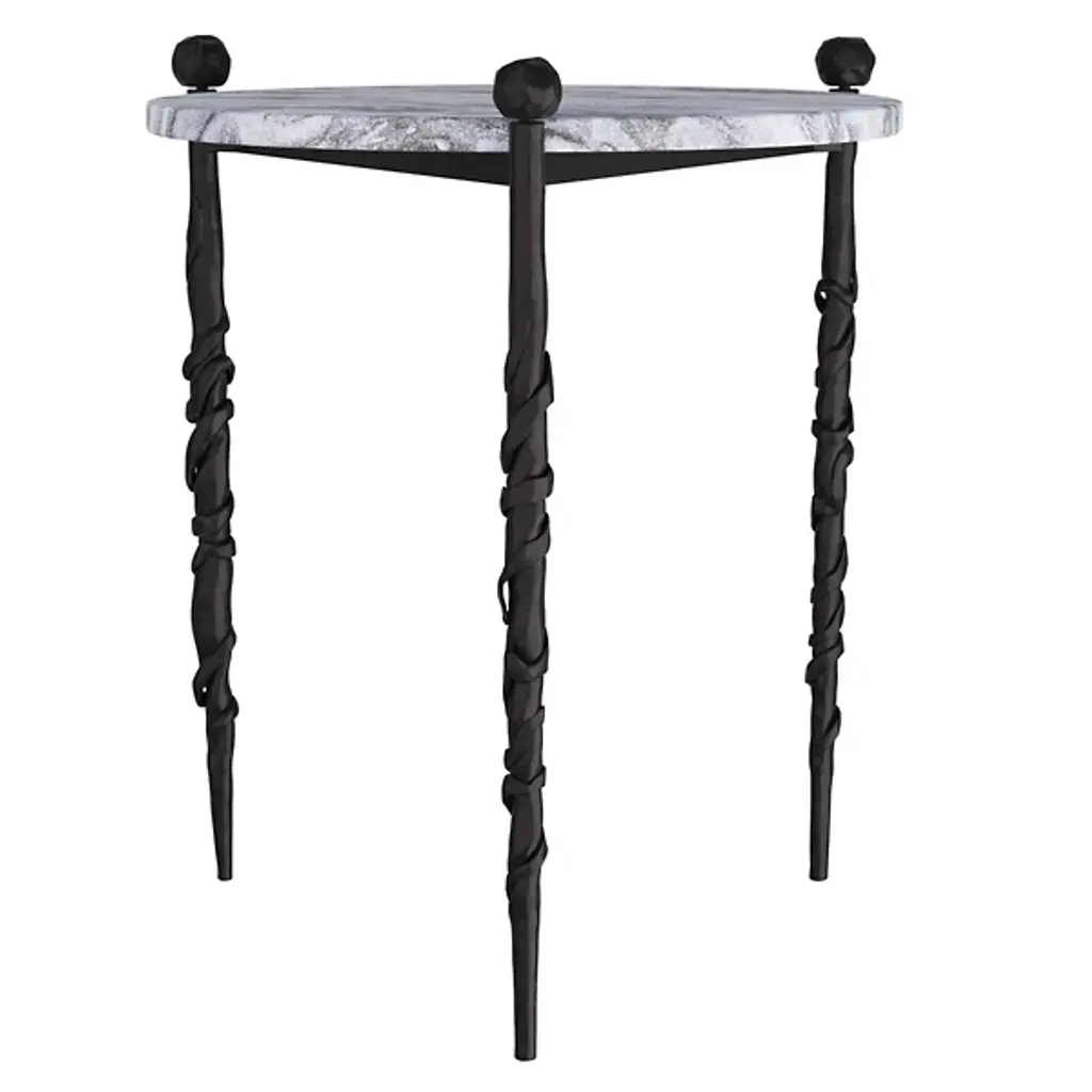 Add a rich, intriguing appeal to living spaces with the slender, spindly lines of the Blackthorn End Table from Arteriors. A daring design inspired by the knotted wood walking stick owned by designer Barry Dixon’s grandfather, it casts each leg in blackened iron, accented with a knob top, and joined to its neighbors by a horizontal triangular structure that supports a marble disc top unique to each table. Able to serve as a side table or occupy the center of attention, the organic textures and contrasting shapes are a feast for the senses.