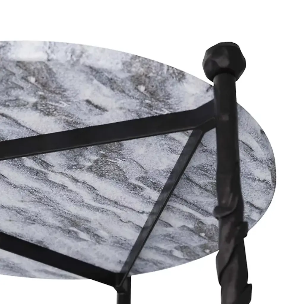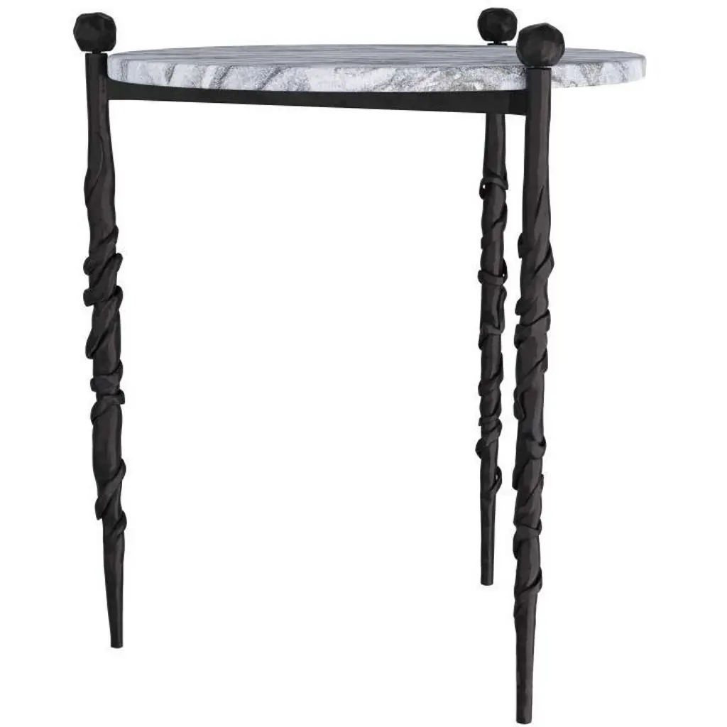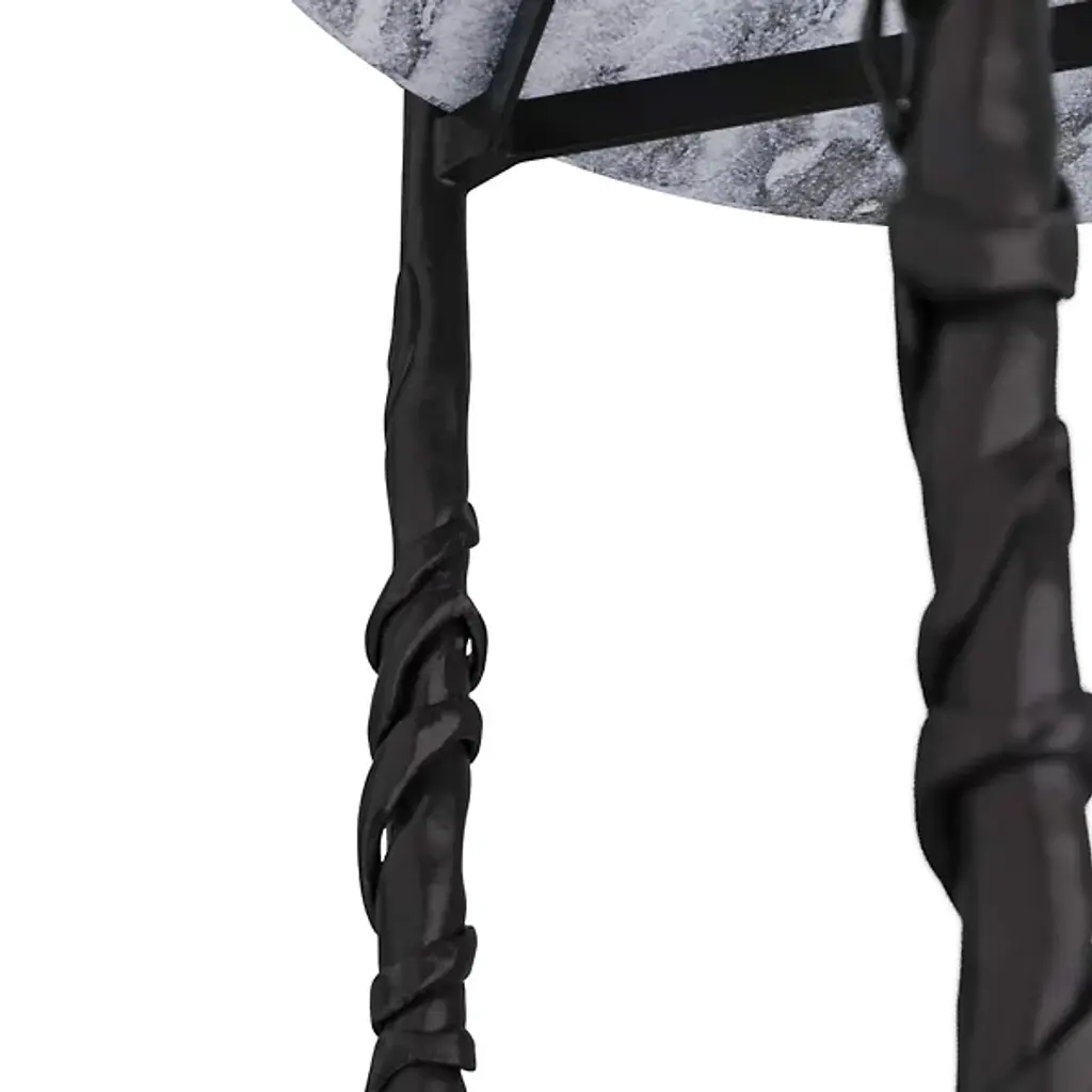 Add a rich, intriguing appeal to living spaces with the slender, spindly lines of the Blackthorn End Table from Arteriors. A daring design inspired by the knotted wood walking stick owned by designer Barry Dixon’s grandfather, it casts each leg in blackened iron, accented with a knob top, and joined to its neighbors by a horizontal triangular structure that supports a marble disc top unique to each table. Able to serve as a side table or occupy the center of attention, the organic textures and contrasting shapes are a feast for the senses.