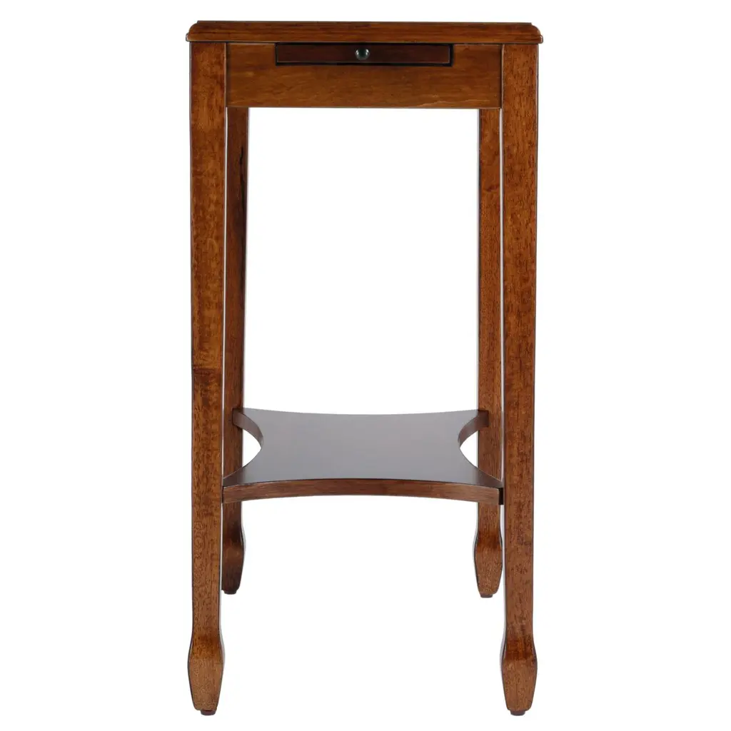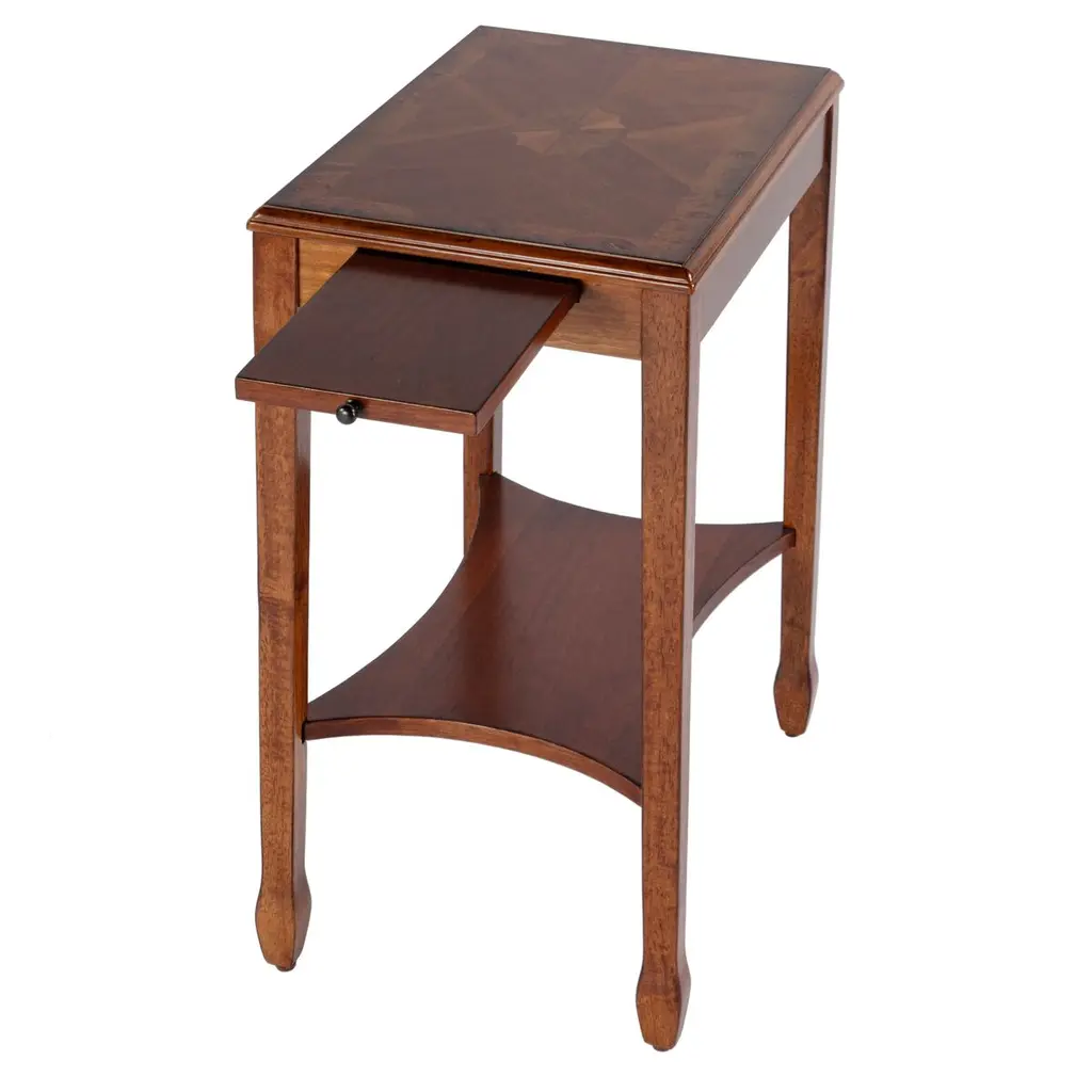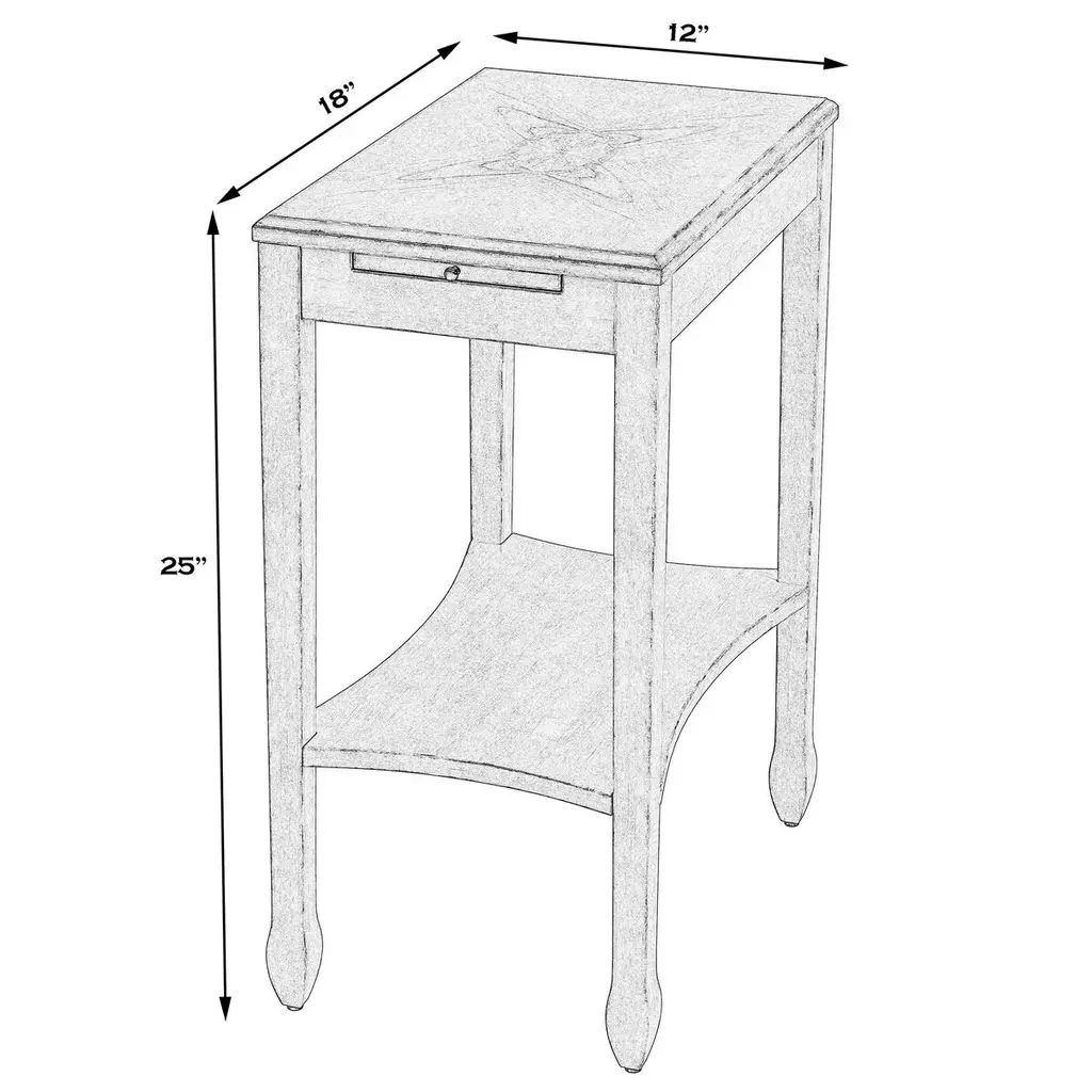 This relaxed traditional side table proves that good things do come in small packages. Carefully crafted from hardwood solids and wood products, it features a veneer linen-fold inlay on a matched veneer top and is framed within a veneer crossgrain border. Includes a lower display shelf and pull out tray with an antique brass finished pull.