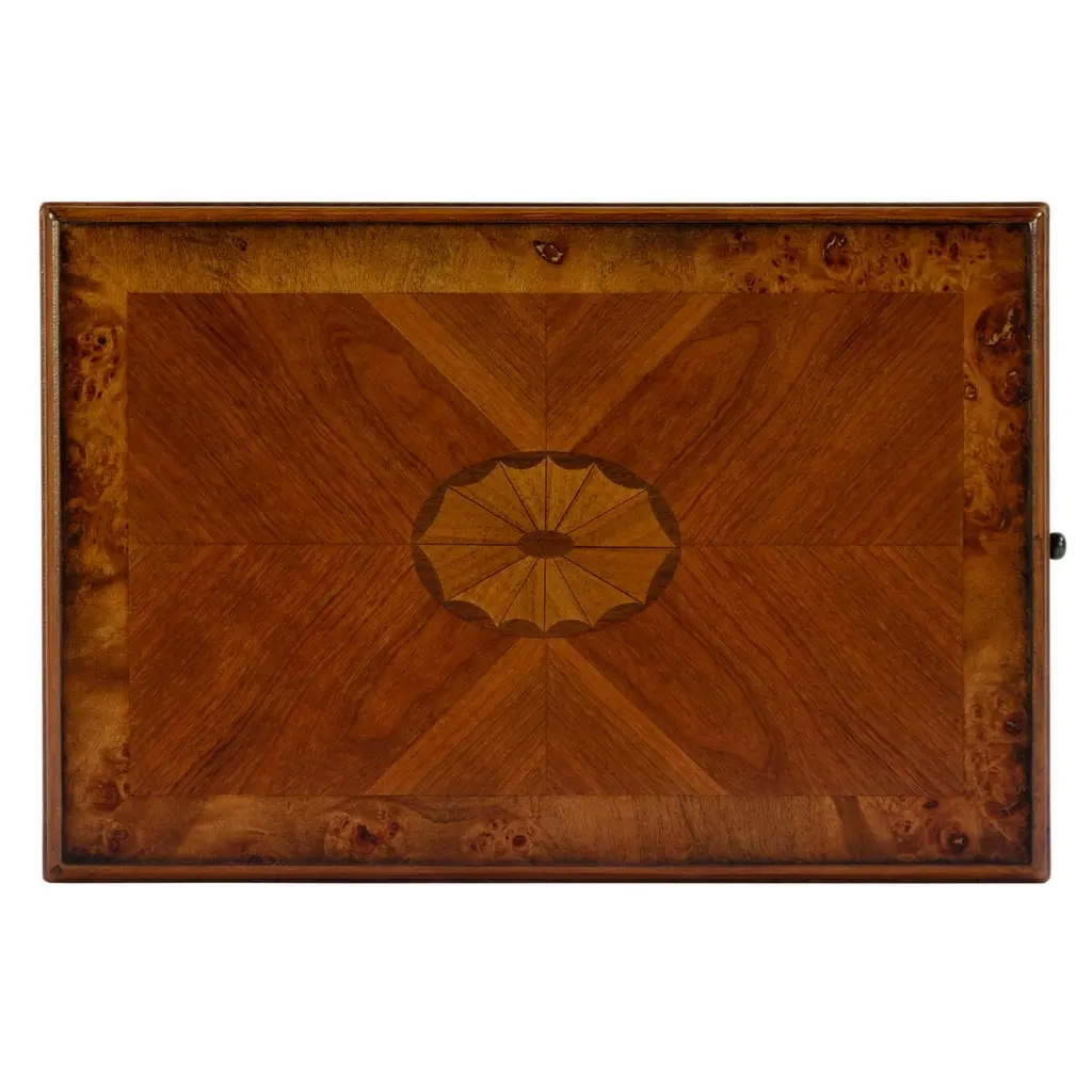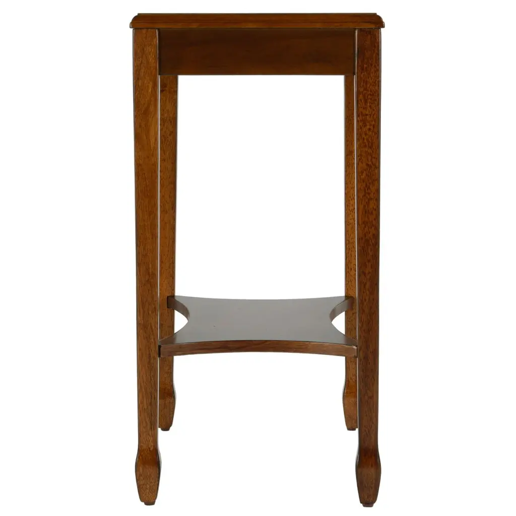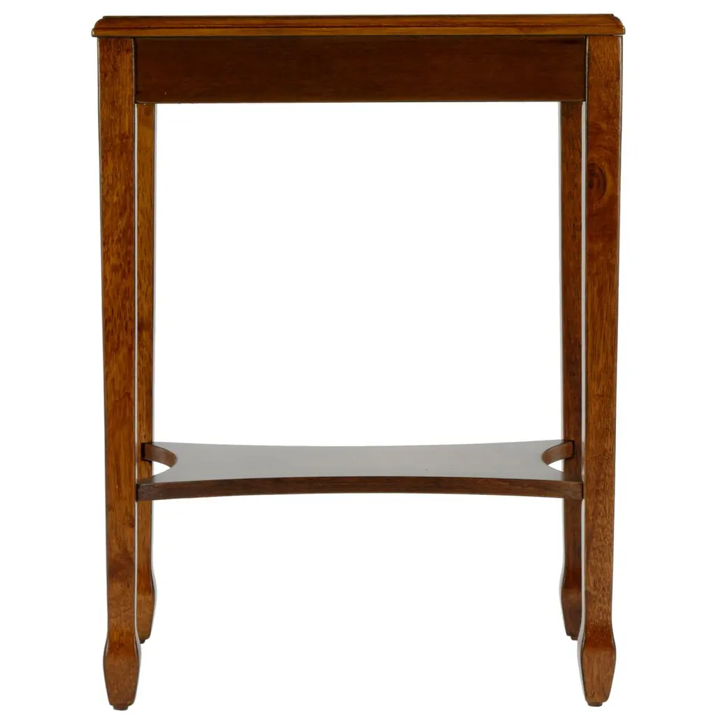 This relaxed traditional side table proves that good things do come in small packages. Carefully crafted from hardwood solids and wood products, it features a veneer linen-fold inlay on a matched veneer top and is framed within a veneer crossgrain border. Includes a lower display shelf and pull out tray with an antique brass finished pull.