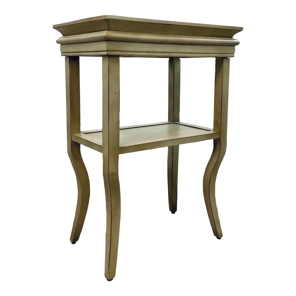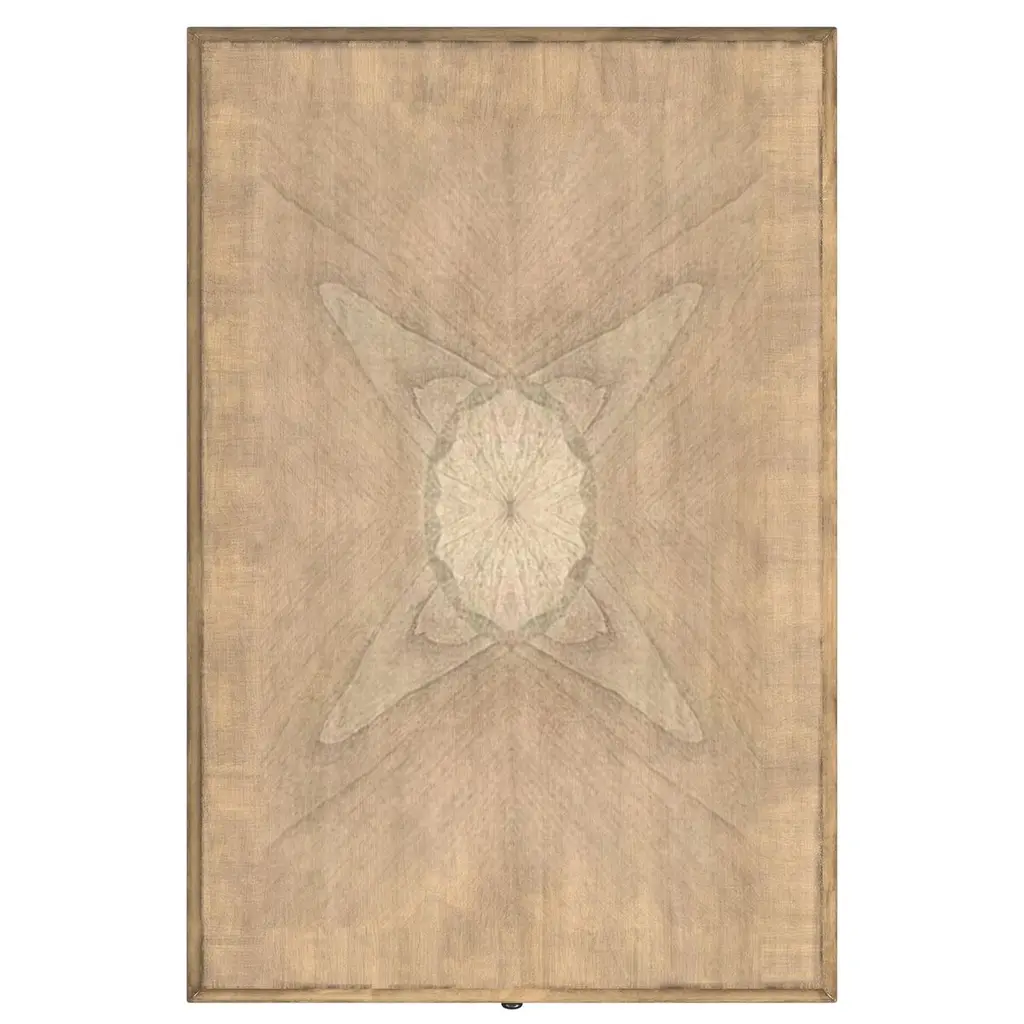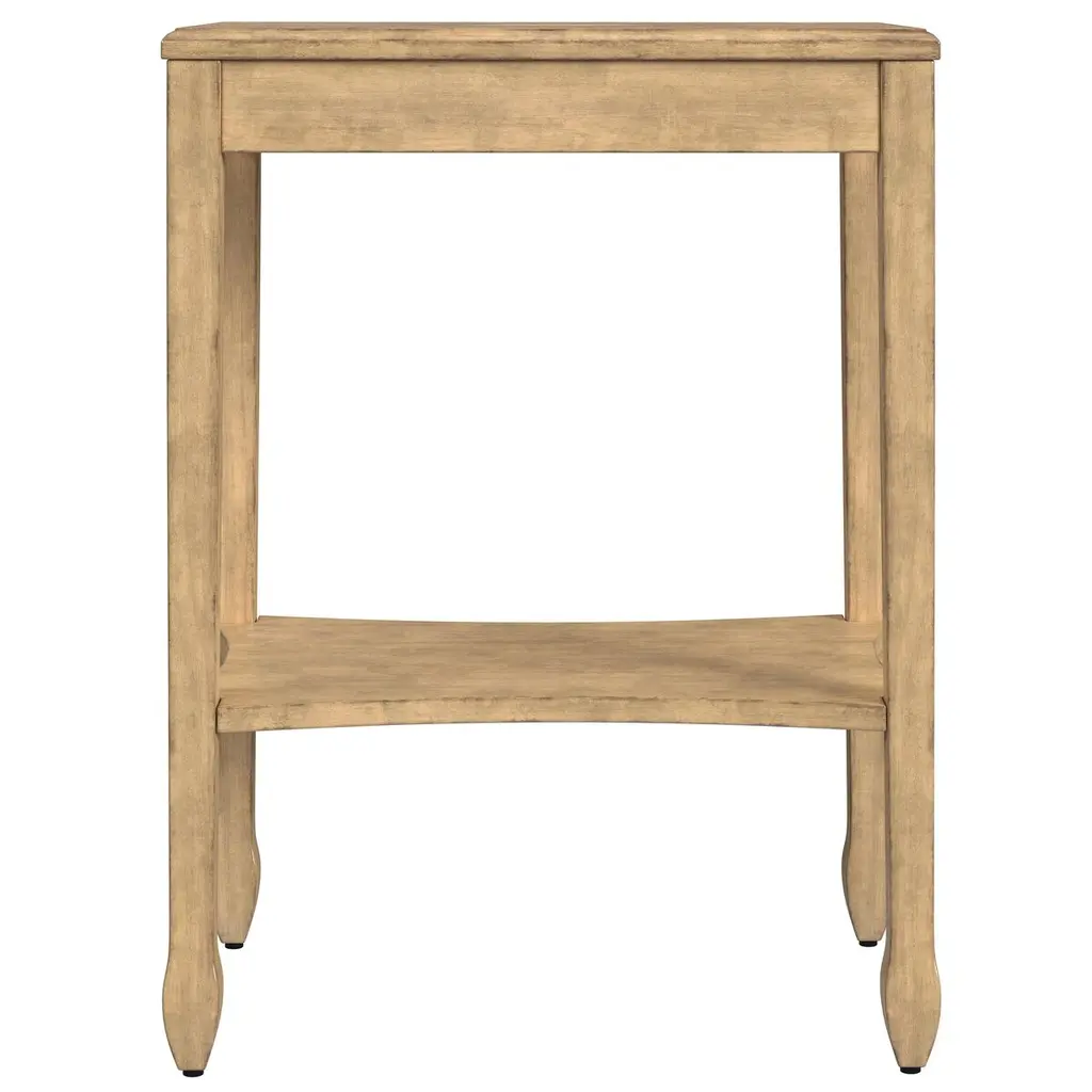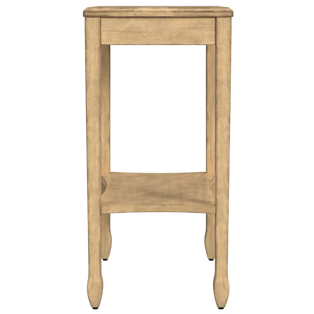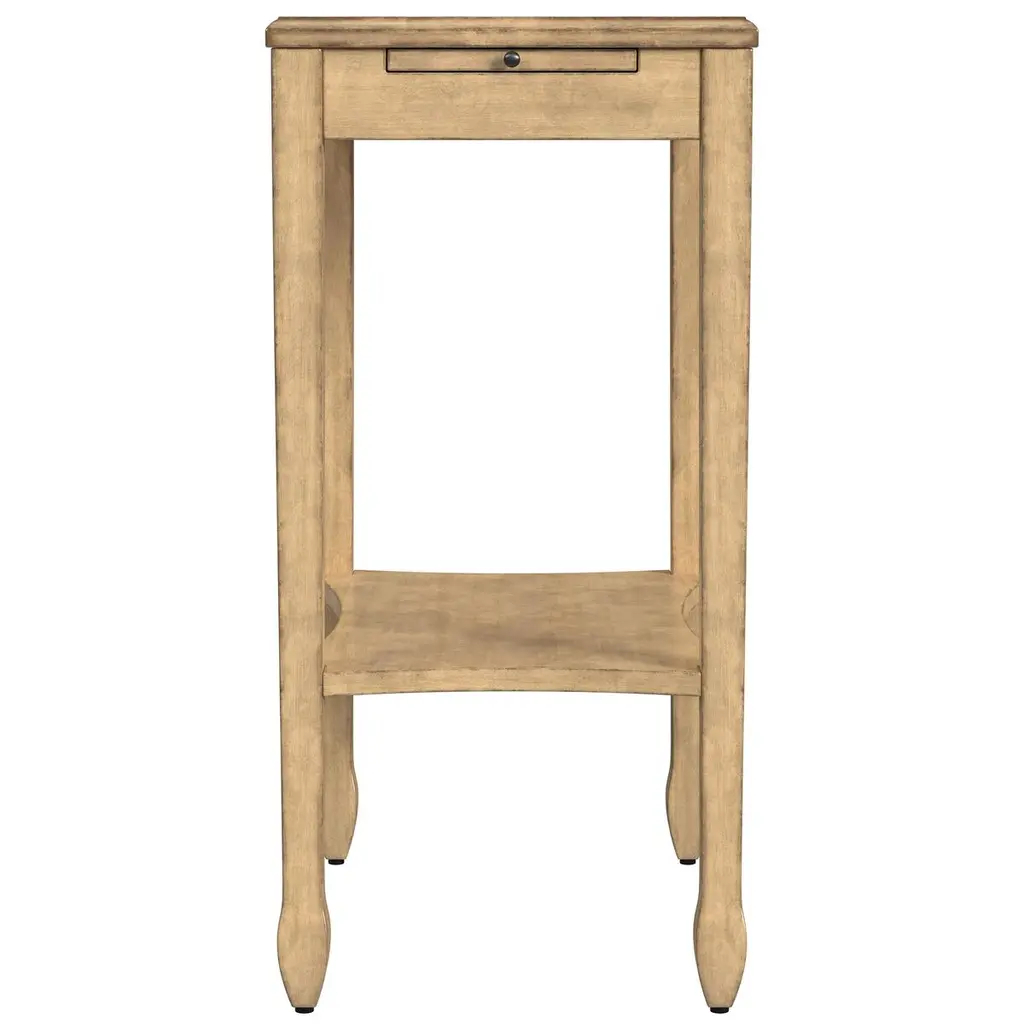This relaxed traditional side table proves that good things do come in small packages. Carefully crafted from hardwood solids and wood products, it features a veneer linen-fold inlay on a matched veneer top and is framed within a veneer crossgrain border. Includes a lower display shelf and pull out tray with an antique brass finished pull.