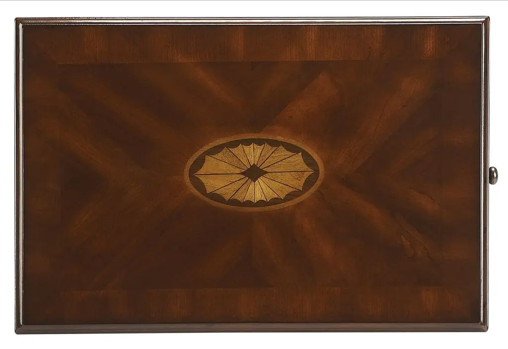 This relaxed traditional side table proves that good things do come in small packages. Carefully crafted from hardwood solids and wood products, it features a veneer linen-fold inlay on a matched veneer top and is framed within a veneer crossgrain border. Includes a lower display shelf and pull out tray with an antique brass finished pull.