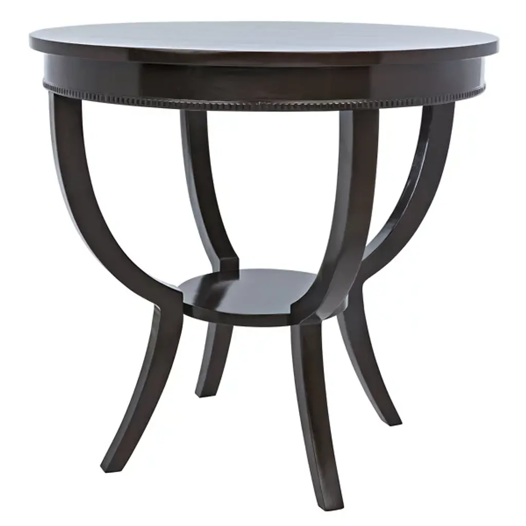 The Blake Accent Table is made of Mindi wood with a round top that has a subtle starburst pattern on the Mindi wood veneer. The legs curve up from the bottom and the feet are capped with polished brass ferrules. Because of its sleek lines, the table is stylistically contemporary.