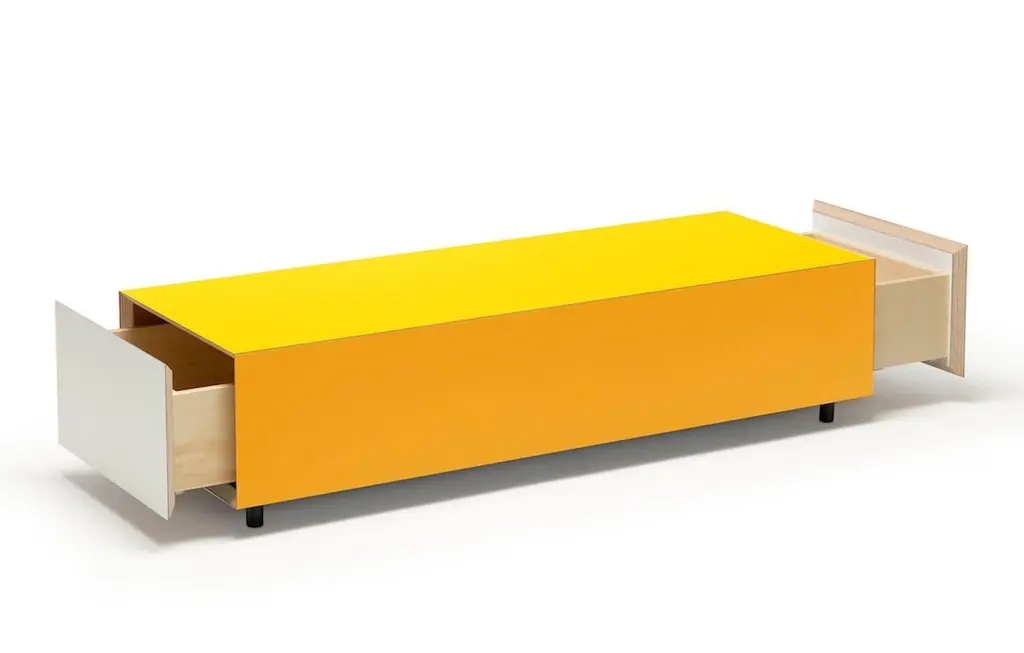 Treating colour as a material, Bloc side tables are based on the idea of recreating a hand-drawn cube, using different tones and shades to suggest an optical illusion.Hidden in the plywood structure is a drawer with a soft-open mechanism, disguised by theblock colours of the outer surfaces. Available in three sizes, the design is highly versatileand can add playfulness and a compact graphic character to a wide range of interiorenvironments, from the home to the office.The BLOC coffee tables are colourful plywood boxes in contrasting high-pressure laminatefinishes. They come with black dowel feet as standard and can be paired with castorwheels (optional) and a storage soft-open drawer (optional).DimensionsSmallL640mm × D450mm × H290mm, 20kgSquareL850mm × D850mm × H290mm, 25kgLongL1200mm × D450mm × H290mm, 35kgMaterialsBirch plywood, high-pressure laminate, soft-close drawer slides, black stained oak (legs),stainless steel ball bearing and nylon castors (option)COLOURSBright red, burgundy, clayBottle green, pine green, signal greenGrey, burnt orange, pale greyZinc yellow, signal yellow, pale greyNotesStable, strong, versatile, and durable. Suitable for general contract use. Not suitable for outdoor use. Avoid contact with heat sources.