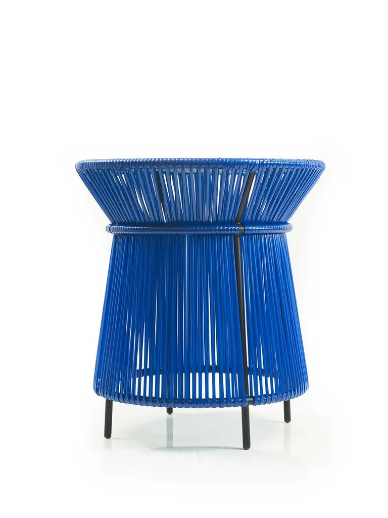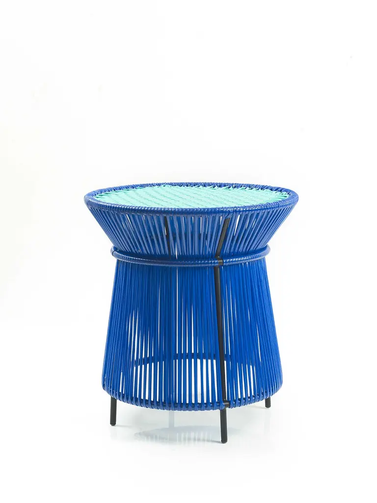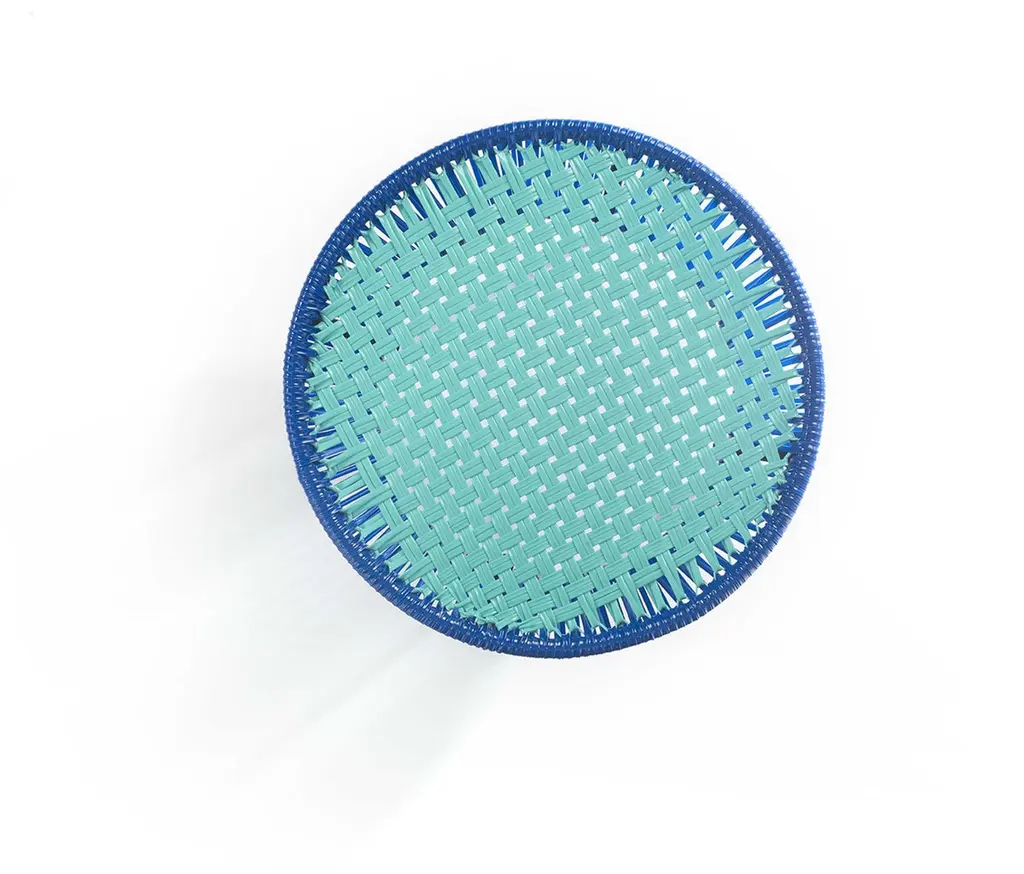 Blue Caribe High table by Sebastian HerknerMaterials: Galvanized and powder-coated tubular steel. PVC strings are made from recycled plastic.Technique: Made from recycled plastic and weaved by local craftspeople in Colombia. Dimensions: Diameter 46.1 x H 50 cm Also available colors: blue/ mint/ black, mint/ green/ black, orange/ rose/ curry, green/ rose/ curry.The charming Caribe High Side Table is a colorful companion for seating arrangements inside and outdoors. It’s part of the Caribe collection, designed by Sebastian Herkner for ames. The German designer visited Colombia together with Ames founder Ana Maria Calderon-Kayser and translated the vibrancy and spirit of the country’s people and traditions into joyful, modern furniture pieces defined by clean lines, strong colors, and the hand-woven webbing.Each table is made in Santa Marta, a city on the Caribbean coast of Colombia, by local craftspeople. They weave the PVC strings, which are made from recycled plastic, around the tubular steel frame. The weaving technique the artesanos and artesanas use are called Momposino, a traditional method known for intricate patterns. Just the preparation of all the materials takes ten days, while the production of each table takes two days.German designer Sebastian Herkner is a long-term collaborator of Ames and has visited Colombia multiple times to experience the country’s cities, nature and people first hand. He also visited many of the ateliers that Ames has partnered with to learn about the unique traditional crafts of Colombia's regions. A sought-after contemporary designer and recipient of many industry awards, he has worked with many international design brands, creating intriguing pieces that showcase his intuition for interesting material, color, and texture combinations.