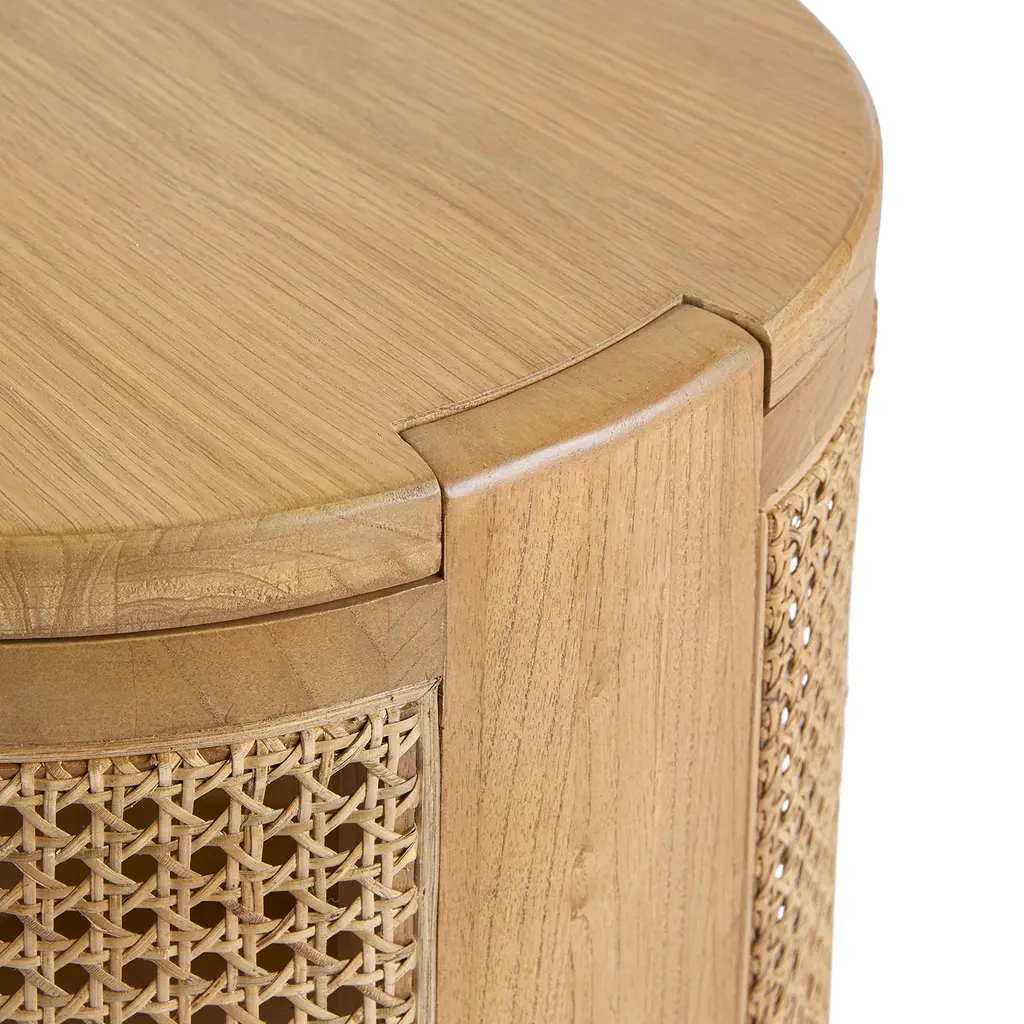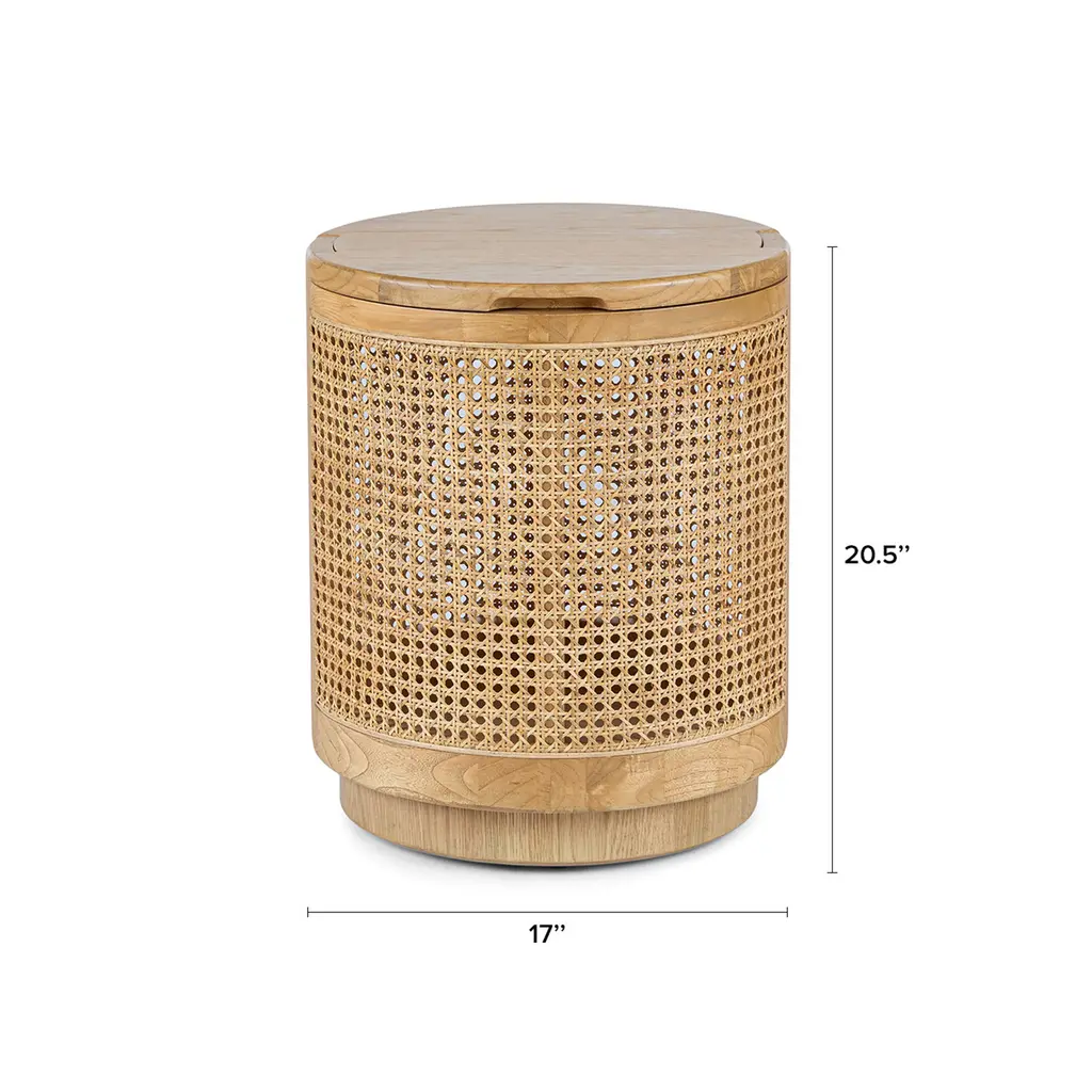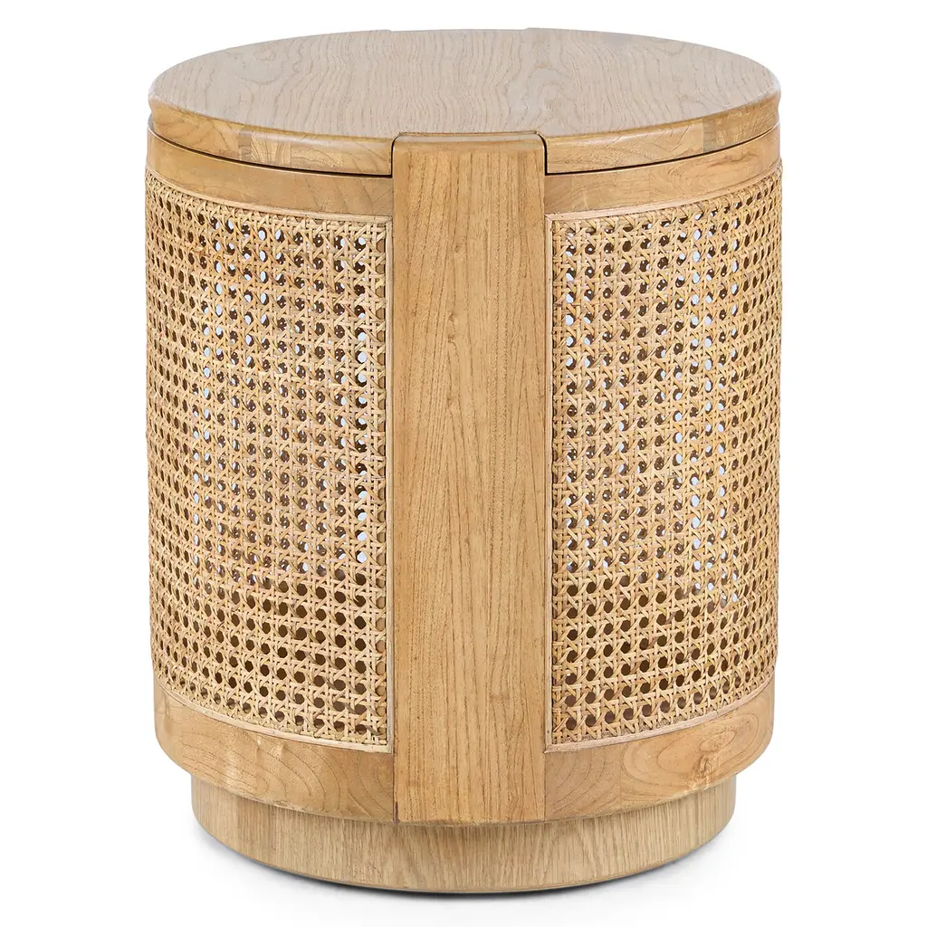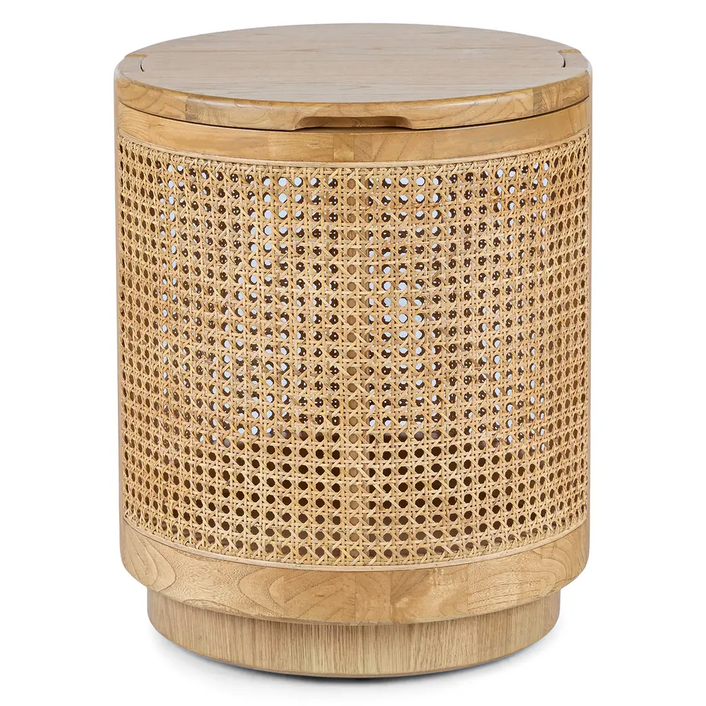 More than meets the eye. On the outside, the Bocana is a stunning oak and box cane side table but on the inside, it's whatever your heart desires. The Bocana's solid wood top lifts for spacious drum-shaped storage that's perfect for storing games, toys, or that collection of cozy movie night blankets you've amassed. It's like we thought of everything.