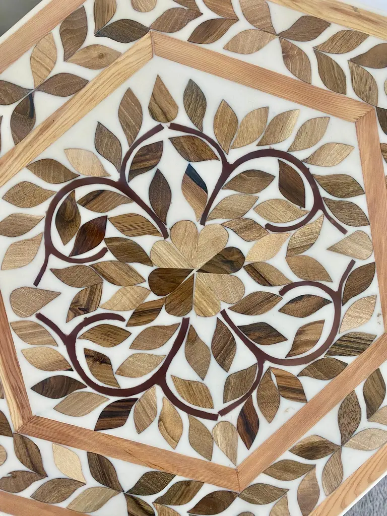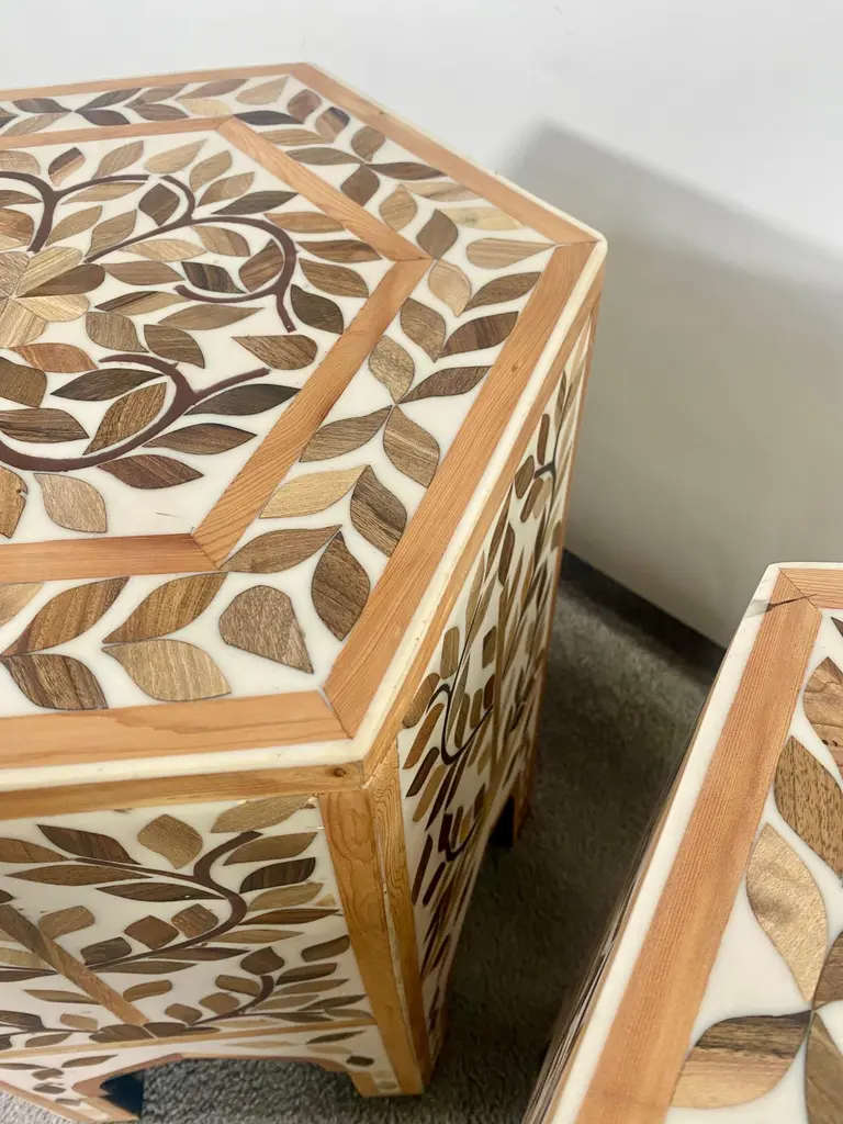 Boho Chic Leaf Design Resin & Walnut Hexagonal Side Or End Table, Pair