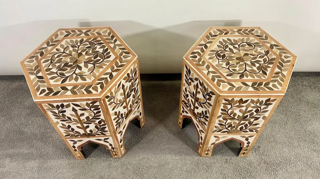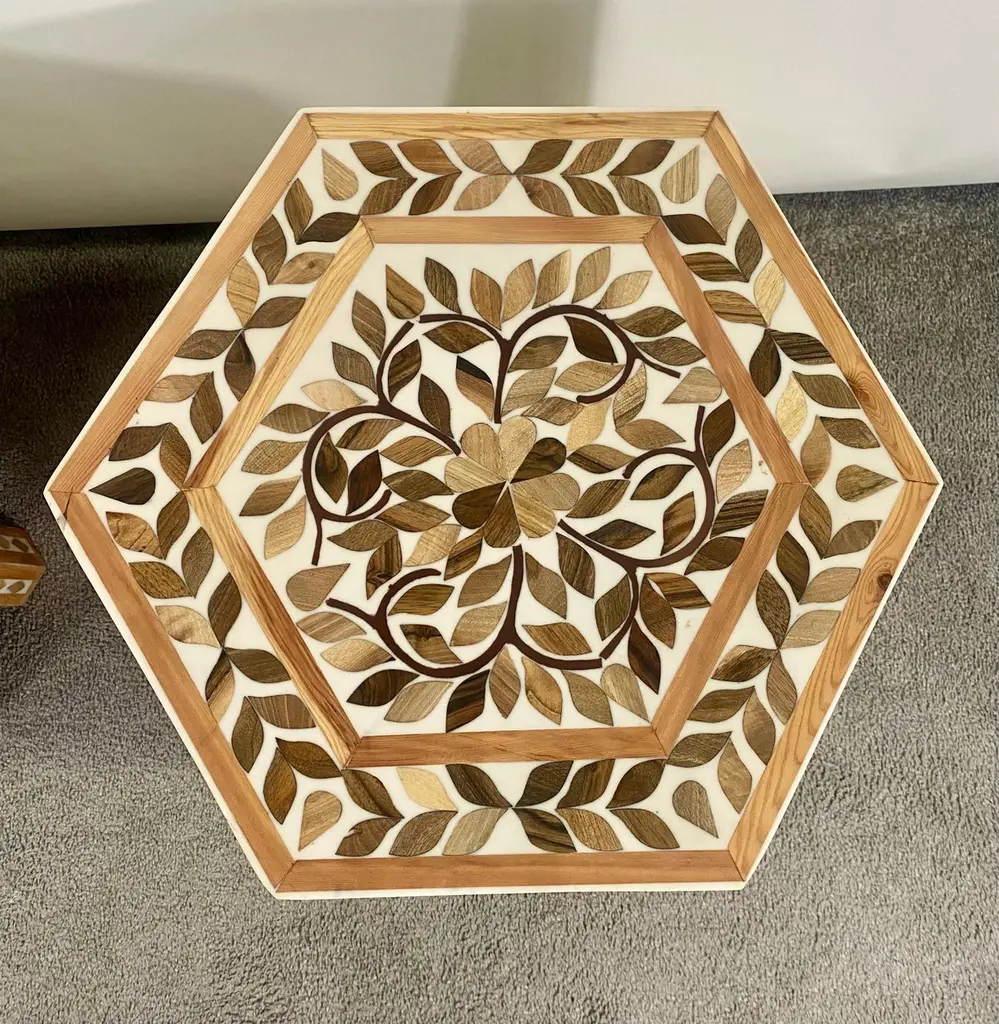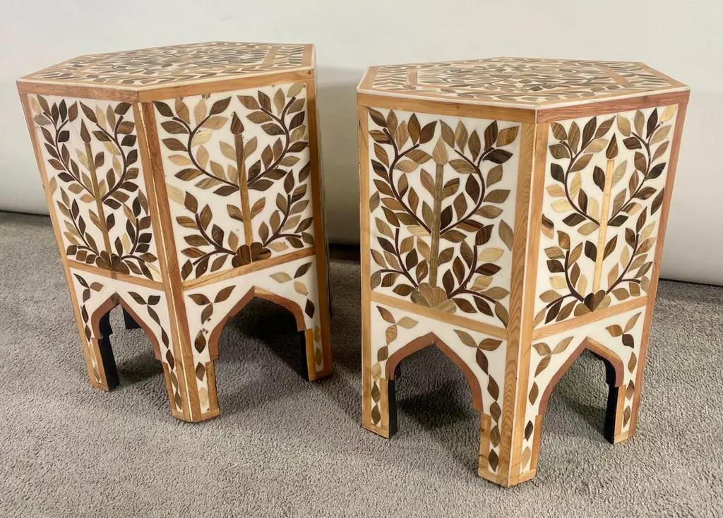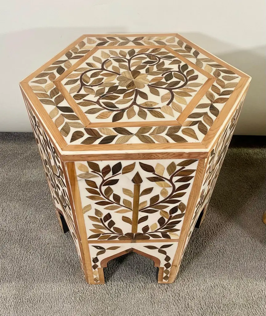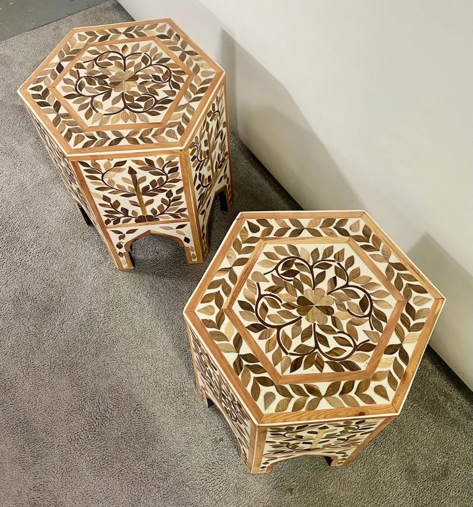 An exquisite pair of boho chic / Bohemian Moroccan style side or end table featuring an hexagonal shape. The handmade tables are finely decorated in leaves Pattern and beautiful arches, a staple of the Moorish timeless architecture and design. handmade of resin in an off white color with wooden walnut leaves inlay, the tables are gorgeous will add a touch of exotic to any room or space.Note : the tables are 100% handmade and the color of the natural walnut can vary in shades and tones. Dimensions: 19.25” H x 15.25” W x 17.75” D.